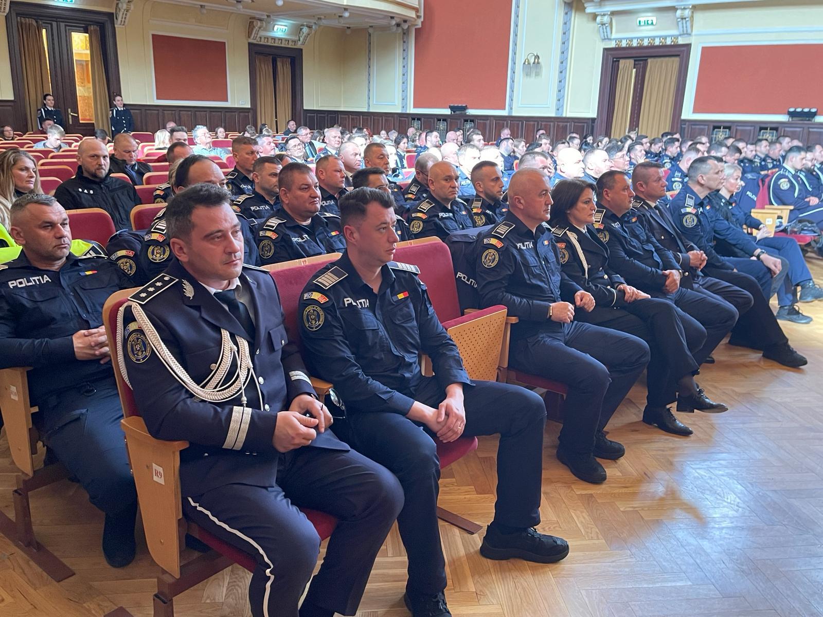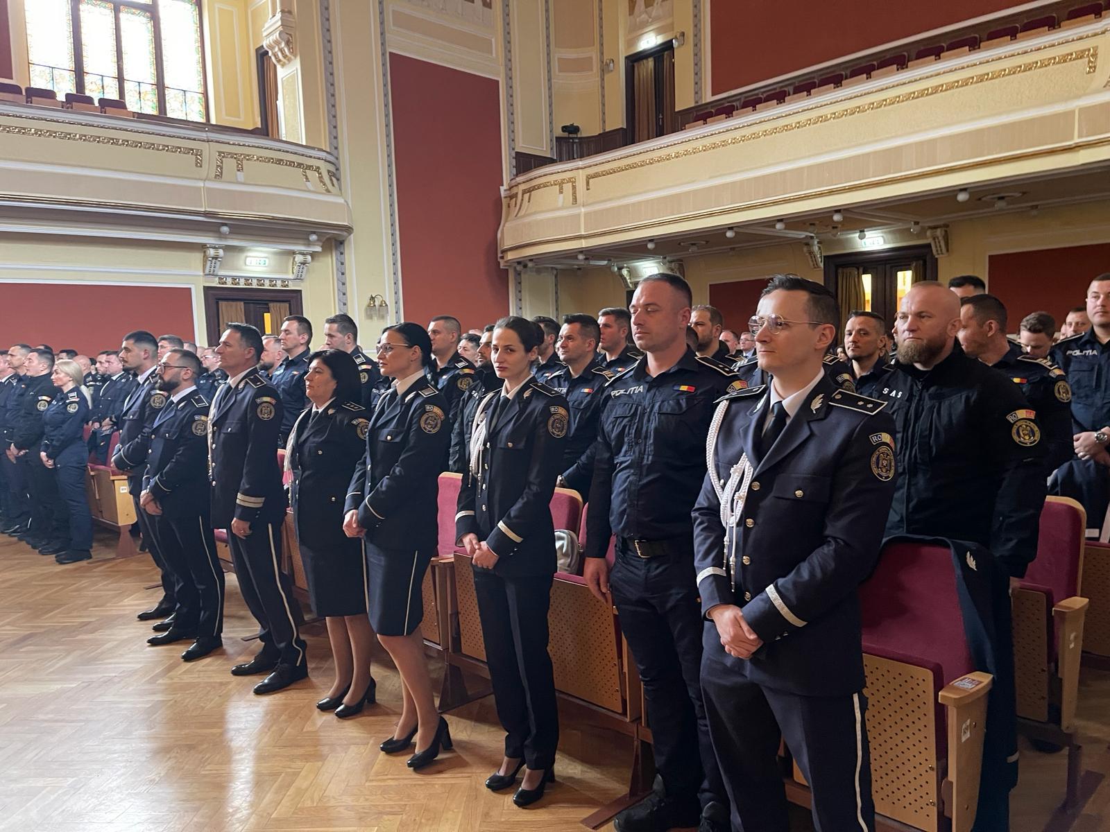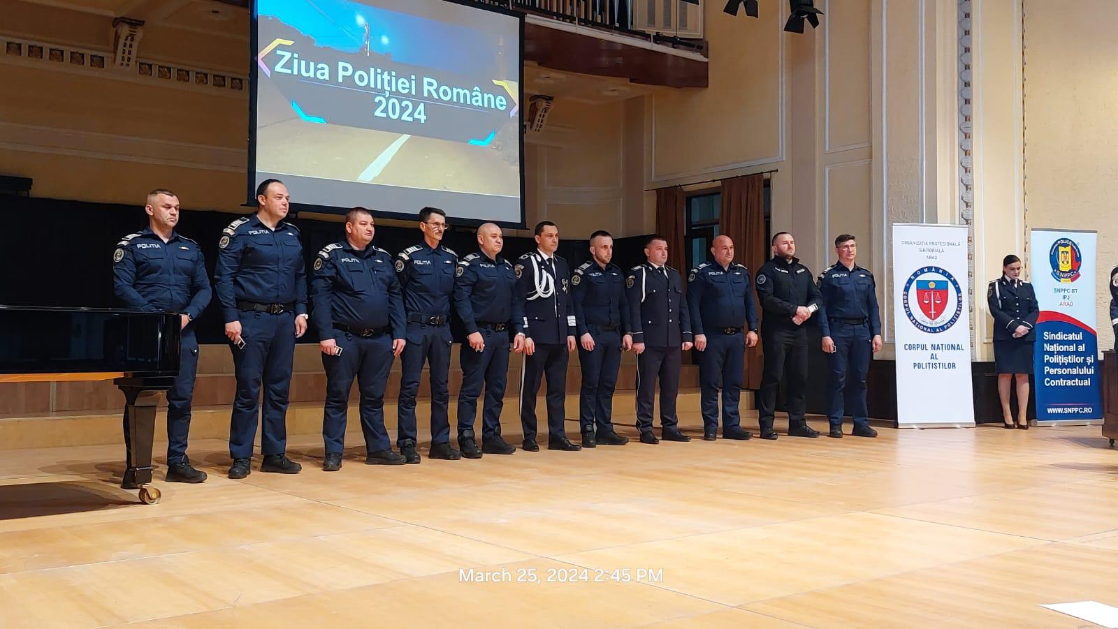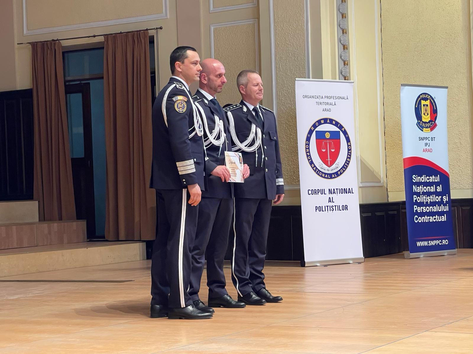 „În cadrul ceremoniei festive, care a avut loc la Filarmonica din Arad, au fost avansați la termen, în gradul profesional următor, 126 de polițiști. Înainte de termen, au fost avansați în gradul profesional următor 23 de polițiști. Au fost premiați și polițiștii cu rezultate deosebite la competițiile sportive, și au primit premii și distincții, din partea Corpului Național al Polițiștilor, Sindicatului Național al Polițiștilor și Personalului Contractual și colegii care s-au remarcat atât în activitatea profesională, cât și prin fapte care au adus plusvaloare imaginii polițiștilor arădeni. Conducerea Inspectoratului de Poliție Județean Arad a felicitat întregul efectiv pentru rezultatele obținute”, se mai arată în informarea transmisă de IPJ Arad.