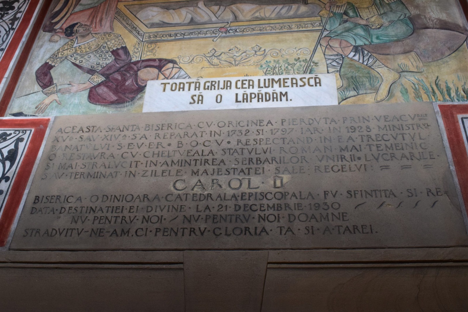 Data sfințirii este menționată și în inscripția sculptată deasupra intrării din pronaos în naos. „Această sfântă biserică cu originea pierdută prin veacul XV sau XIV s-a reparat în 1732 și 1797 iar în 1928, Ministrul Banatului, Sever Bocu, respectând în ea trecutul o restaură cu cheltuiala Statului Român, mai temeinic și mai strălucit, în amintirea Serbărilor Unirii. Lucrările s-au terminat în zilele Majestatei Sale Regelui Carol II. Biserica odinioară catedrală episcopală fu sfințită și redată destinației ei divine la 21 decembrie 1930. Nu pentru noi, Nu pentru noi Doamne, străduitu-ne-am, ci pentru gloria Ta și a Țarei”.