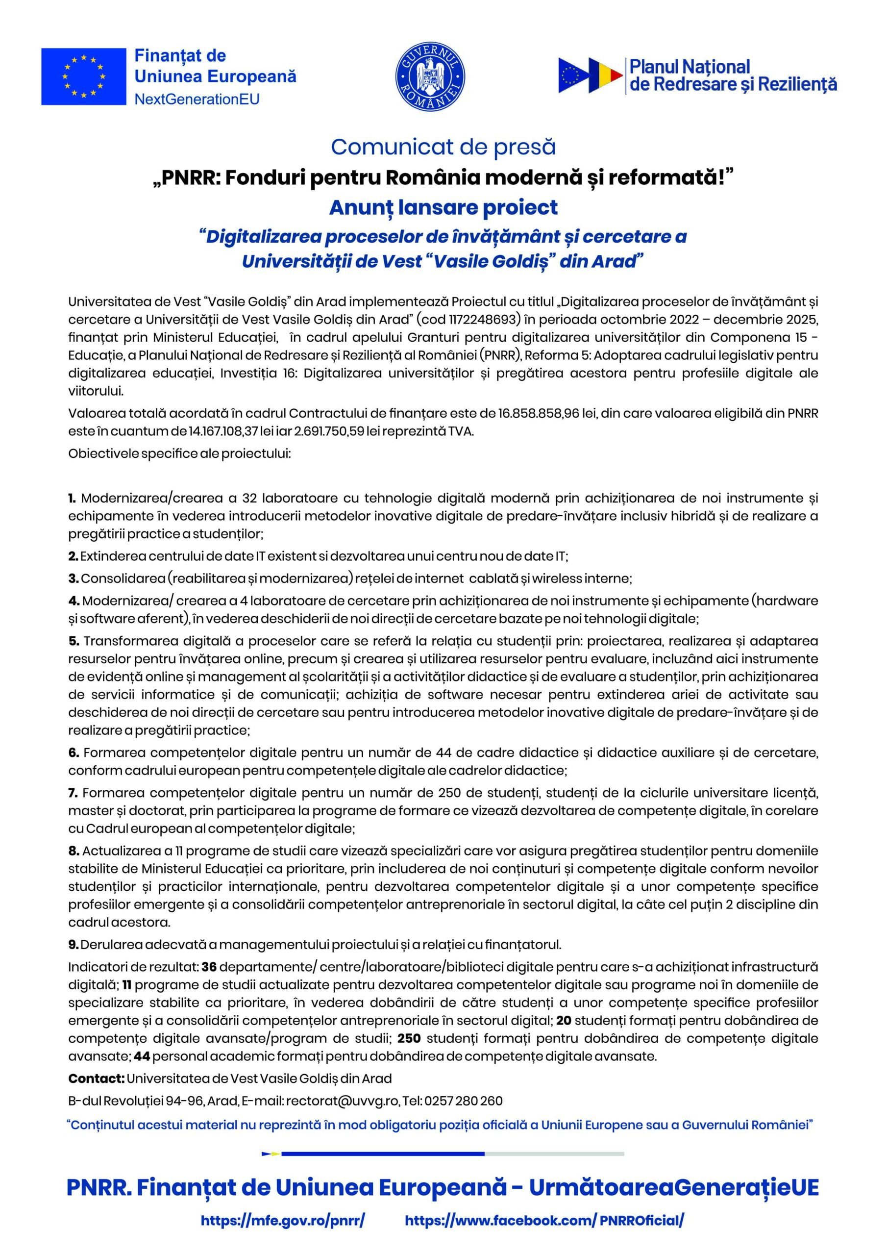 Obiectivele specifice ale proiectului sunt: Modernizarea/crearea a 32 laboratoare cu tehnologie digitală modernă prin achiziționarea de noi instrumente și echipamente în vederea introducerii metodelor inovative digitale de predare-învățare inclusiv hibridă și de realizare a pregătirii practice a studenților; Extinderea centrului de date IT existent si dezvoltarea unui centru nou de date IT; Consolidarea (reabilitarea și modernizarea) rețelei de internet cablată și wireless interne; Modernizarea/ crearea a 4 laboratoare de cercetare prin achiziționarea de noi instrumente și echipamente (hardware și software aferent), în vederea deschiderii de noi direcții de cercetare bazate pe noi tehnologii digitale; Transformarea digitală a proceselor care se referă la relația cu studenții prin: proiectarea, realizarea și adaptarea resurselor pentru învățarea online, precum și crearea și utilizarea resurselor pentru evaluare, incluzând aici instrumente de evidență online și management al școlarității și a activităților didactice și de evaluare a studenților, prin achiziționarea de servicii informatice și de comunicații; achiziția de software necesar pentru extinderea ariei de activitate sau deschiderea de noi direcții de cercetare sau pentru introducerea metodelor inovative digitale de predare-învățare și de realizare a pregătirii practice; Formarea competențelor digitale pentru un număr de 44 de cadre didactice și didactice auxiliare și de cercetare, conform cadrului european pentru competențele digitale ale cadrelor didactice; Formarea competențelor digitale pentru un număr de 250 de studenți, studenți de la ciclurile universitare licență, master și doctorat, prin participarea la programe de formare ce vizează dezvoltarea de competențe digitale, în corelare cu Cadrul european al competențelor digitale; Actualizarea a 11 programe de studii care vizează specializări care vor asigura pregătirea studenților pentru domeniile stabilite de Ministerul Educației ca prioritare, prin includerea de noi conținuturi și competențe digitale conform nevoilor studenților și practicilor internaționale, pentru dezvoltarea competentelor digitale și a unor competențe specifice profesiilor emergente și a consolidării competențelor antreprenoriale în sectorul digital, la câte cel puțin 2 discipline din cadrul acestora.