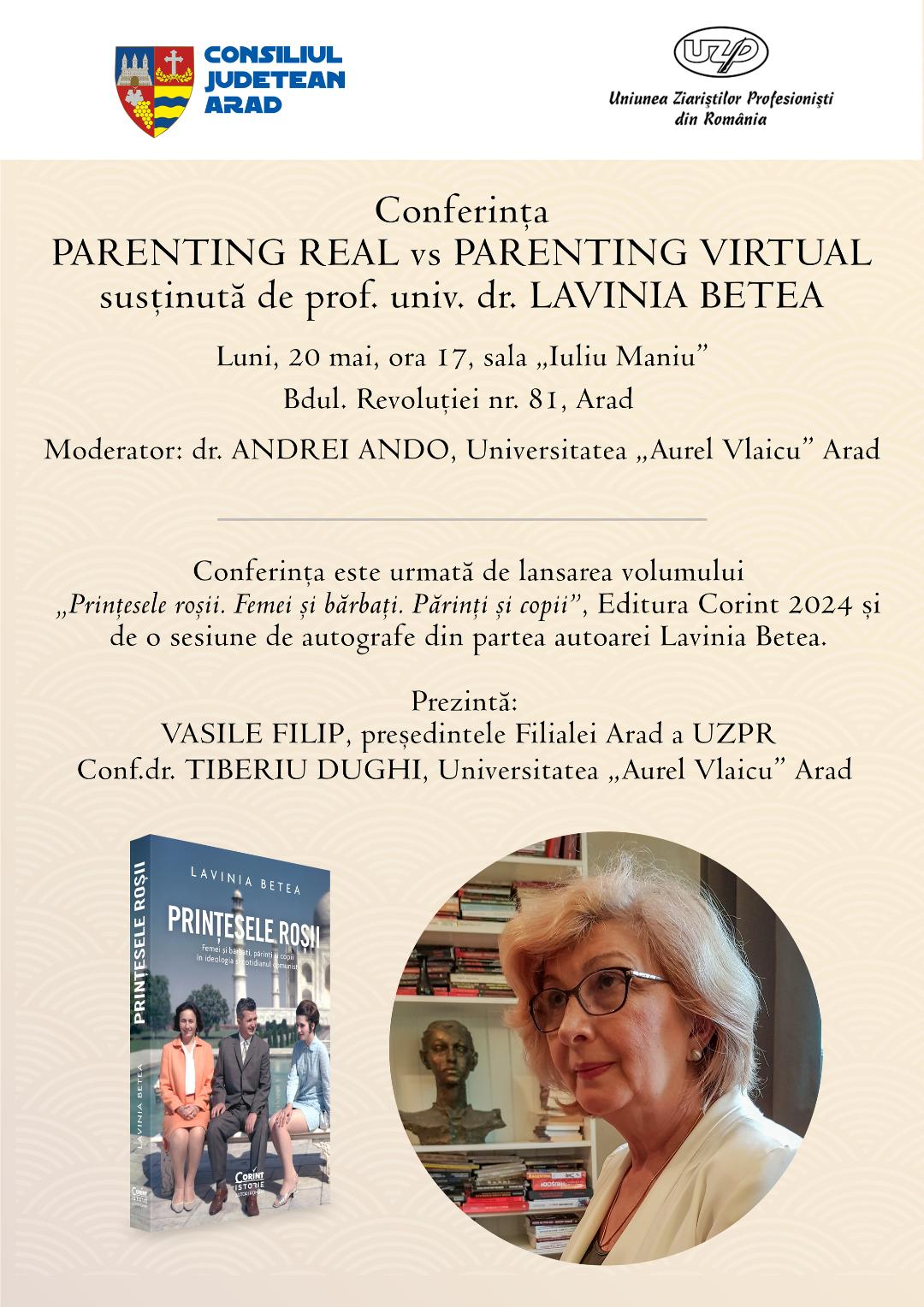 Prof.univ. dr. Lavinia Betea, prim-vicepreședinte al filialei arădene a Uniunii Ziariștilor Profesioniști din România, va susţine conferinţa „PARENTING REAL versus PARENTING VIRTUAL”. Evenimentul va avea loc luni, 20 mai, ora 17, în sala „Iuliu Maniu” (Bulevardul Revoluției nr.81), va fi moderat de către dr. Andrei Ando, de la Universitatea „Aurel Vlaicu” Arad şi va fi onorat de prezenţa președintelui Uniunii Ziariștilor Profesioniști din România, Sorin Stanciu.