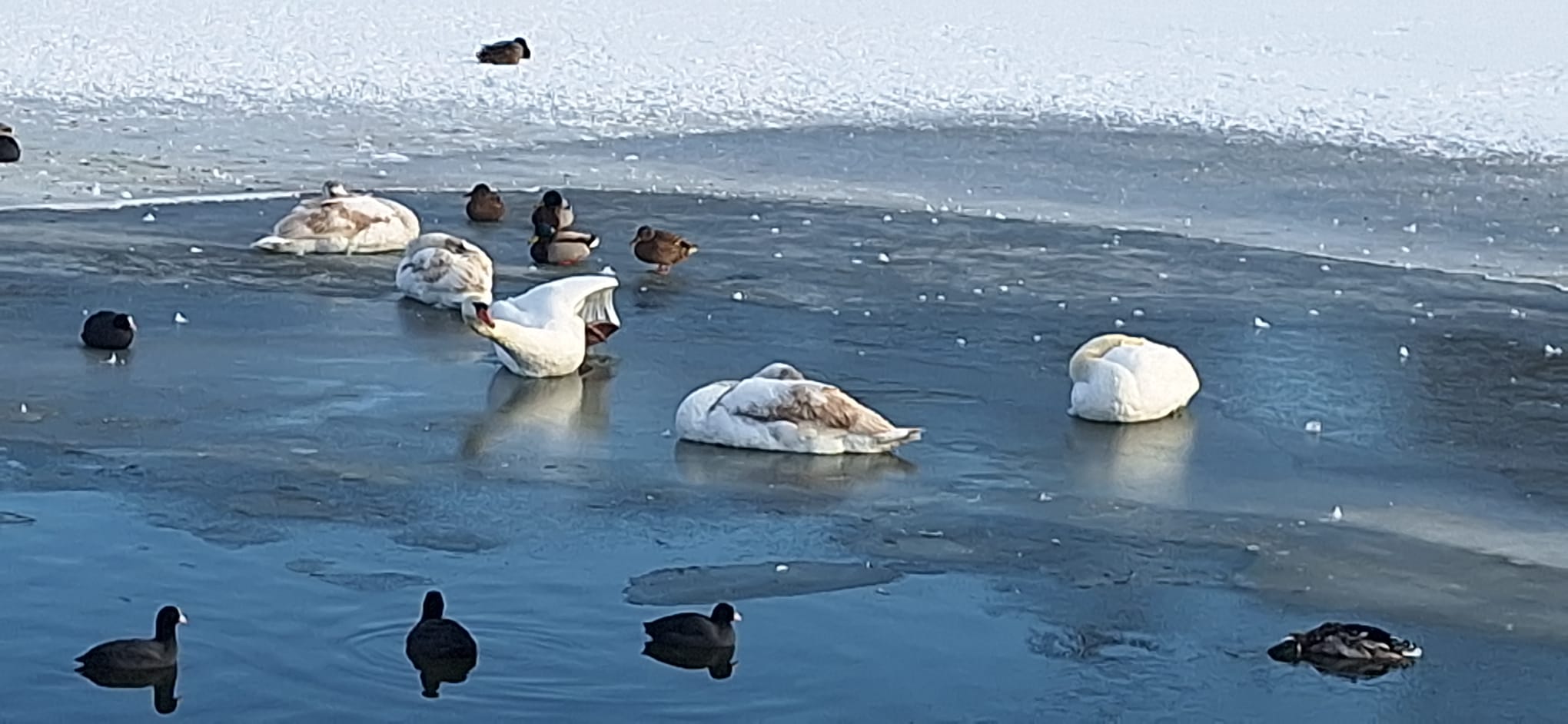 Cele câteva lacuri au înghețat aproape complet. Pe o baltă, o familie de 5 lebede își duce traiul pe gheață, iar mai multe rațe și lișițe stau înghesuite pe un ochi de apă, din mijlocul gheții. Situație similară și pe o altă baltă, în parcul de pe Mărului, unde 6 lebede și câteva rațe și lișițe stau pe un ochi de apă din mijlocul lacului înghețat.