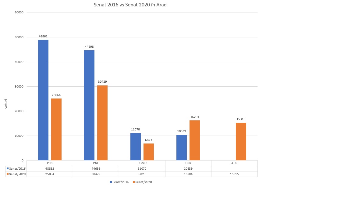 Voturile pierdute de marile partide în Arad au fost efectul, pe de o parte, a celor 27.861 de arădeni care au votat în 2016 dar care în acest an au decis să nu își mai exprime opțiunea de vot (prezența la urne fiind de 36,55% în 2016 și de doar 28,97% în 2020), dar pe de altă parte voturile au mers și către formațiunea nou apărută AUR – Alianța pentru Unirea Românilor. AUR a reușit să adune în Arad peste 15 mii de voturi atât la Camera Deputaților, cât și la Senat.