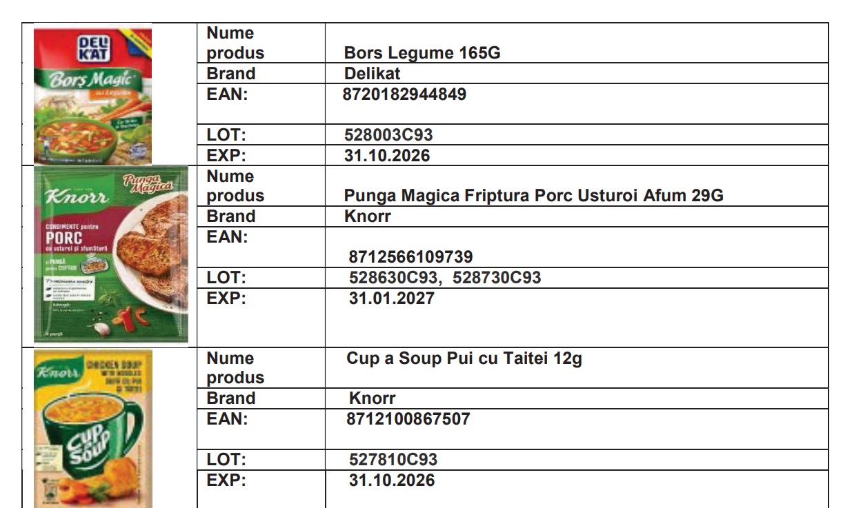 Produsele în cauză sunt: Borș Legume, 165 g, Delikat, LOT: 528003C93, exp: 31.10.2026; Punga Magică Friptură Porc Usturoi Afum, 29 g, Knorr, LOT: 528630C93, 528730C93, exp: 31.01.2027; Cup a Soup Pui cu Tăiței, 12 g, Knorr, LOT: 527810C93, exp: 31.10.2026; Knorr Fix Pui crocant usturoi 70g; LOT: 528008C93, exp: 30.04.2027.