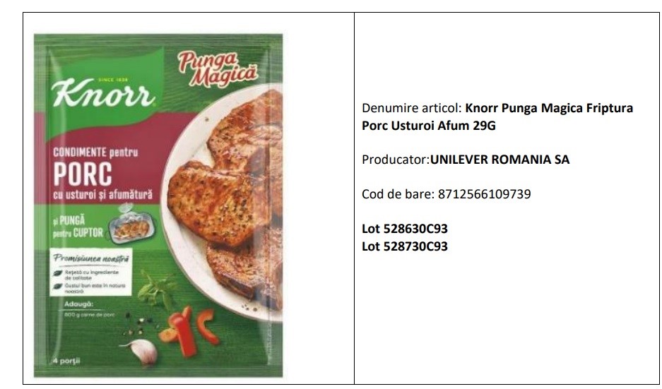 Produsele în cauză sunt: Borș Legume, 165 g, Delikat, LOT: 528003C93, exp: 31.10.2026; Punga Magică Friptură Porc Usturoi Afum, 29 g, Knorr, LOT: 528630C93, 528730C93, exp: 31.01.2027; Cup a Soup Pui cu Tăiței, 12 g, Knorr, LOT: 527810C93, exp: 31.10.2026; Knorr Fix Pui crocant usturoi 70g; LOT: 528008C93, exp: 30.04.2027.