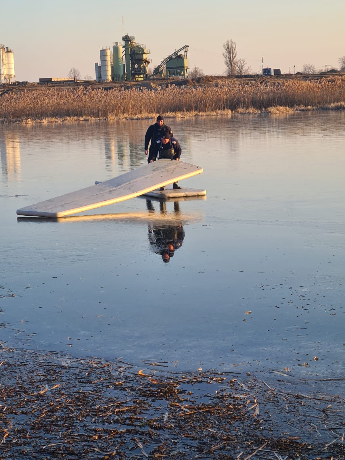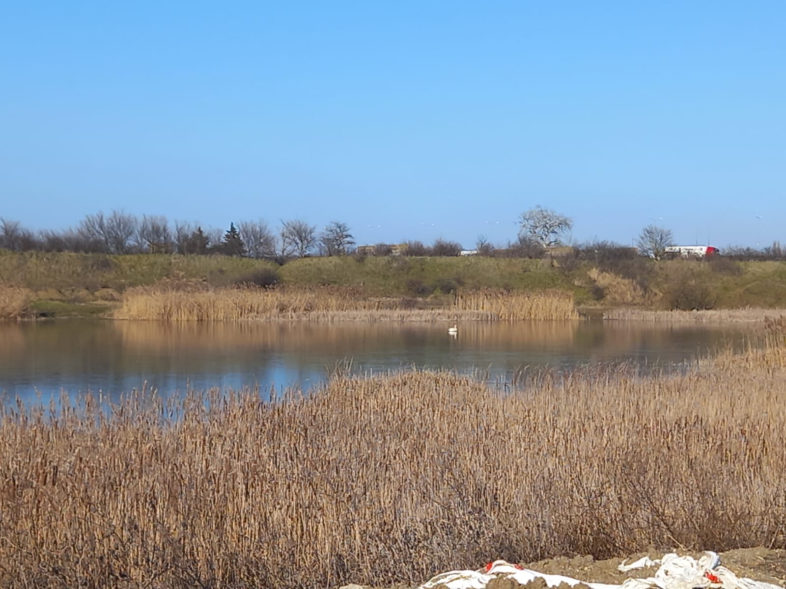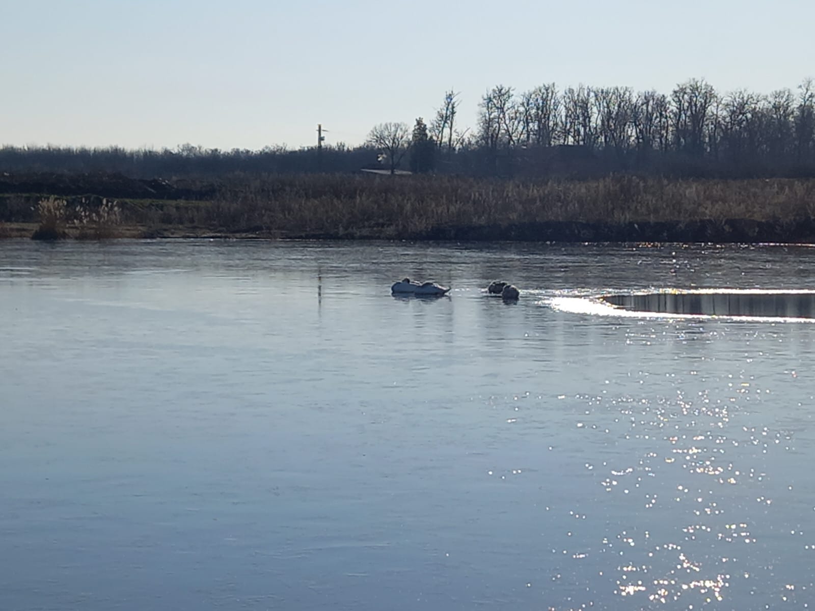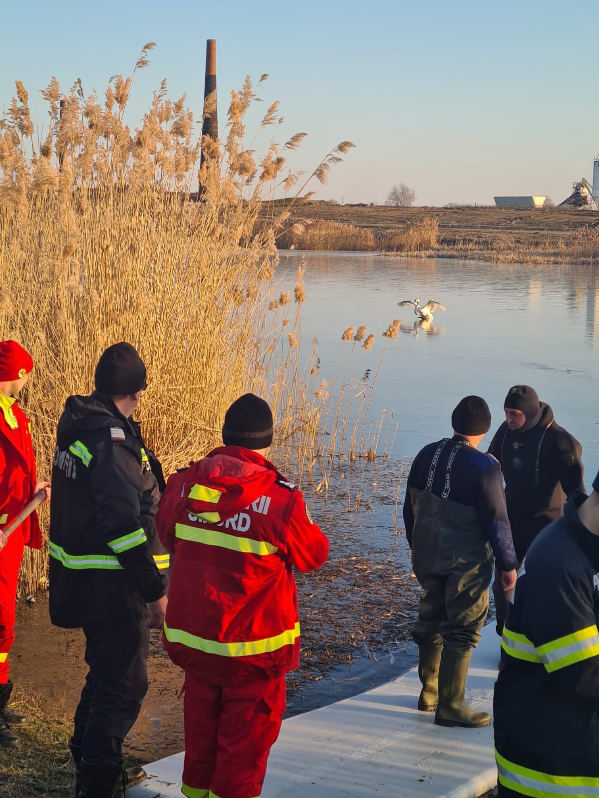 Arad. Joi după-amiază, în urma unui apel la 112 care anunța că „o lebădă se afla blocată pe apa înghețată a bălții Homoc din municipiul Arad, pompierii militari din cadrul Detașamentului Arad s-au deplasat la fața locului cu o autospecială de primă intervenție și comandă dotată cu o barcă, pentru salvarea păsării prinse în sloiul de gheață”, informează ISU Arad.Până ca pompierii să ajungă însă la puiul de lebădă, acesta a reușit să se elibereze singur, grăbindu-se să se alăture familiei sale, aflate de cealaltă parte a bălții.