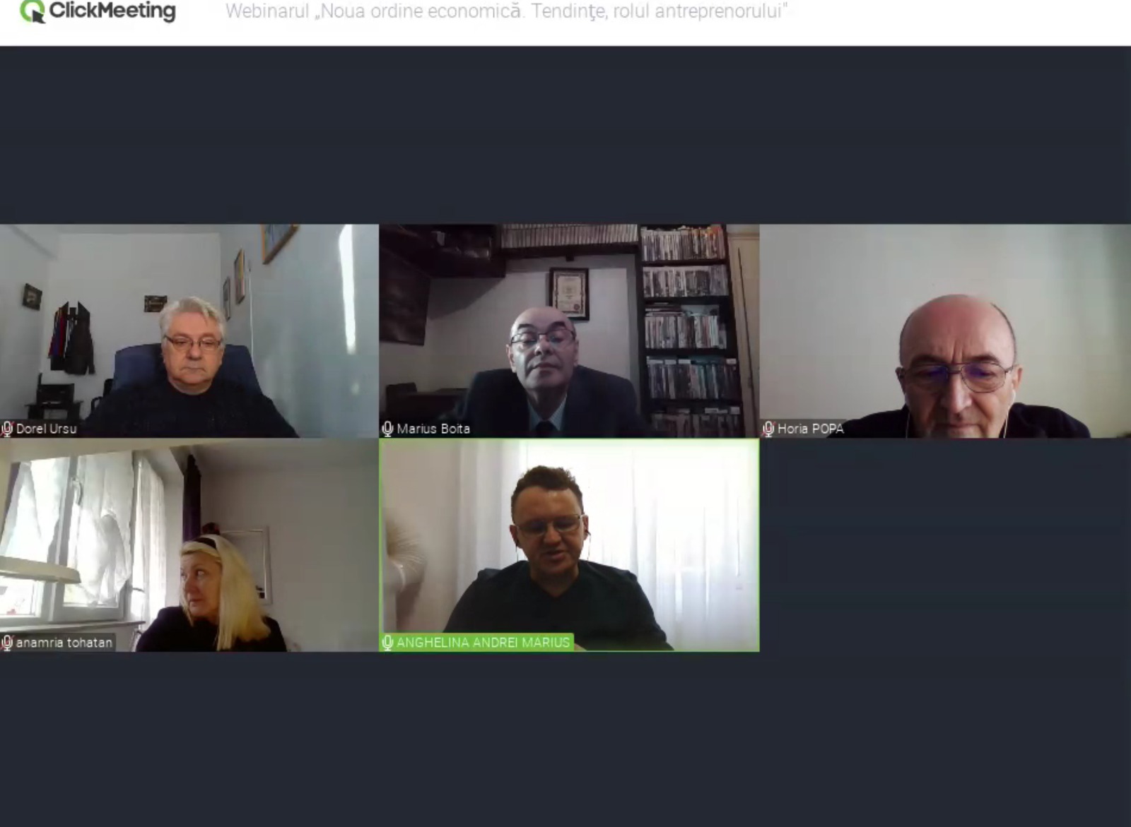 Patru au fost temele prezentate ȋn cadrul webinarului: „Noua ordine economică. Tendinţe, rolul antreprenorului”: Importanţa economistului în economia de piață. Prezent și viitor – conf. univ. dr. Boby Costi; Rolul antreprenorului ȋn noua economie/economia viitorului – conf. univ. dr. Vichiente Maniov; Noile tendinţe ȋn domeniul tehnologiei – impact economic şi social – prof. univ. dr. Horaţiu Şoim; Rolul poştei ȋn economia durabilă – lector univ. dr. Caius Lăzărescu.