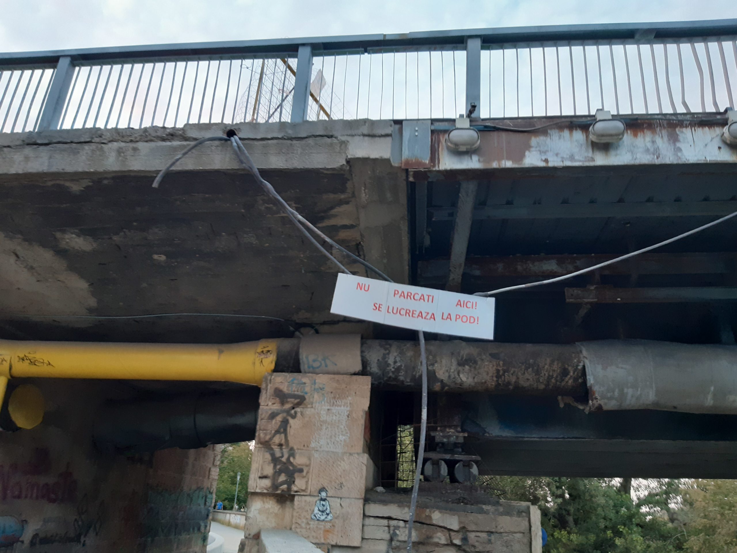ARAD. „Nu parcaţi aici! Se lucrează la pod!” Acesta e mesajul de avertizare scris pe un panou agăţat de nişte cabluri care atârnă pe Podul Decebal (atât în partea dinspre Hotel Parc, cât şi în partea dinspre Baza UTA). Dat fiind locul în care e afişată atenţionarea – sub pod, deasupra unei alei pietonale şi a unei piste de biciclete –, e greu de ghicit cui se adresează.