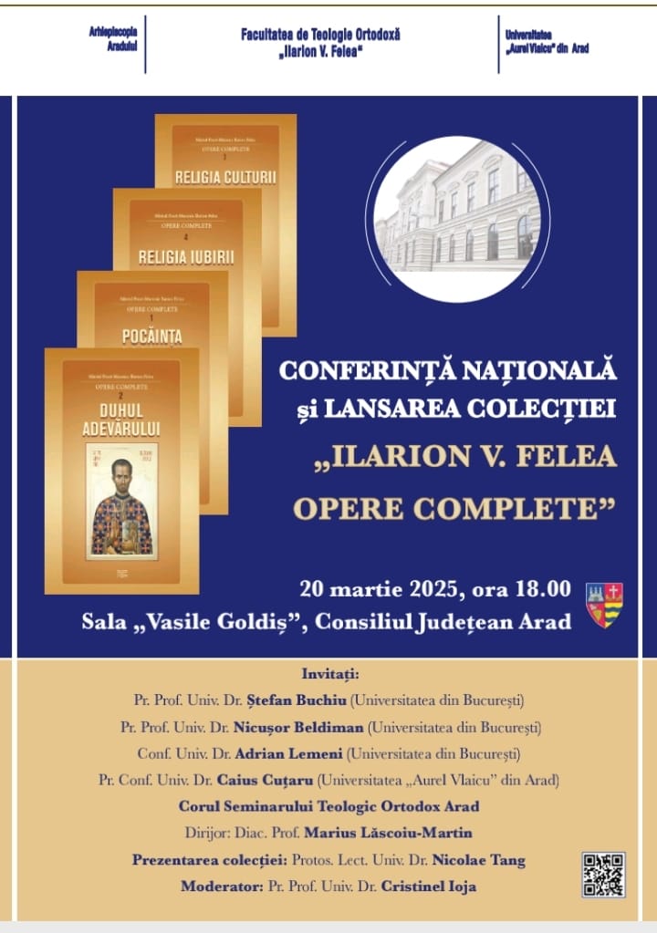 Şirul manifestărilor teologice, misionare şi culturale iniţiate de Facultatea de Teologie Ortodoxă „Ilarion V. Felea” din Arad cu ocazia sărbătoririi Centenarului Patriarhiei Române și a proclamării canonizării Sfântului Preot Mucenic Ilarion Felea continuă joi, 20 martie, printr-un eveniment semnificativ: lansarea unei noi colecţii intitulate „Ilarion V. Felea – Opere complete”, cu menirea de a oferi cititorilor o ediţie nouă şi integrală a scrierilor Sfântului Părinte.