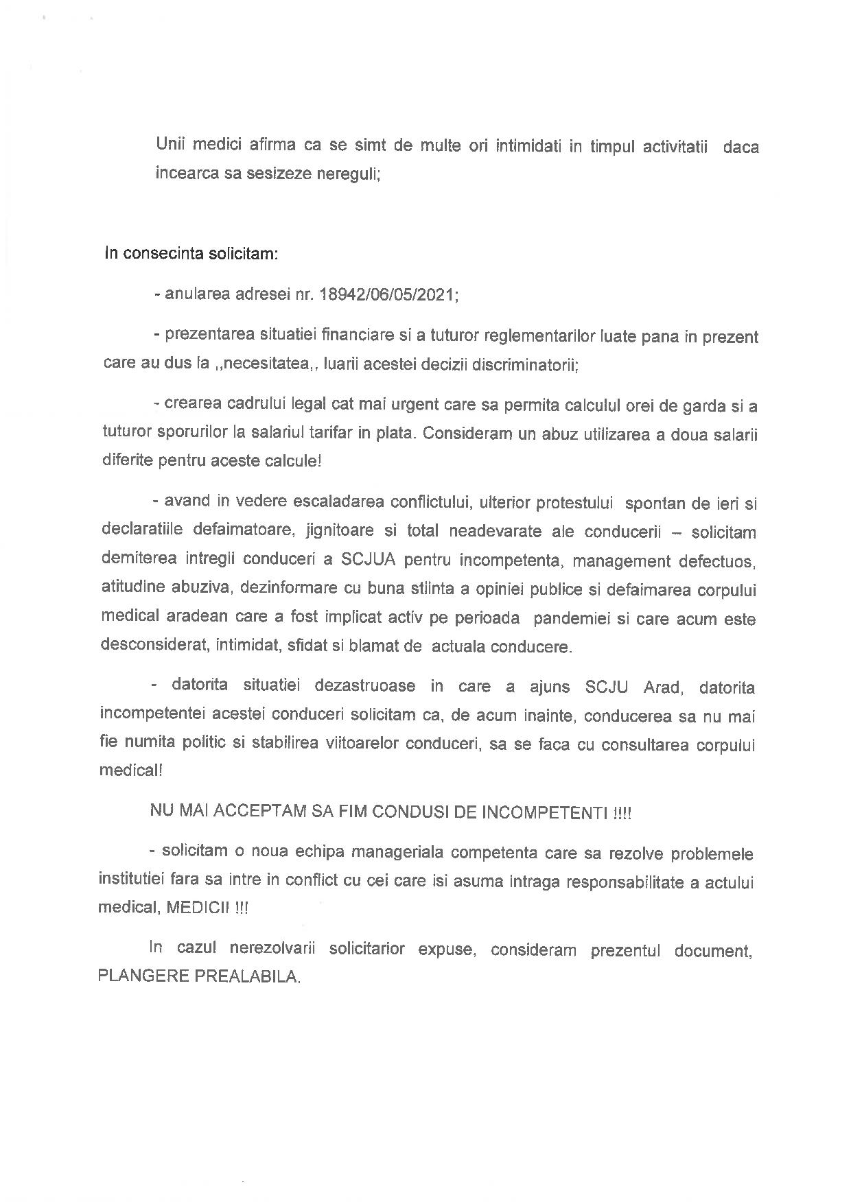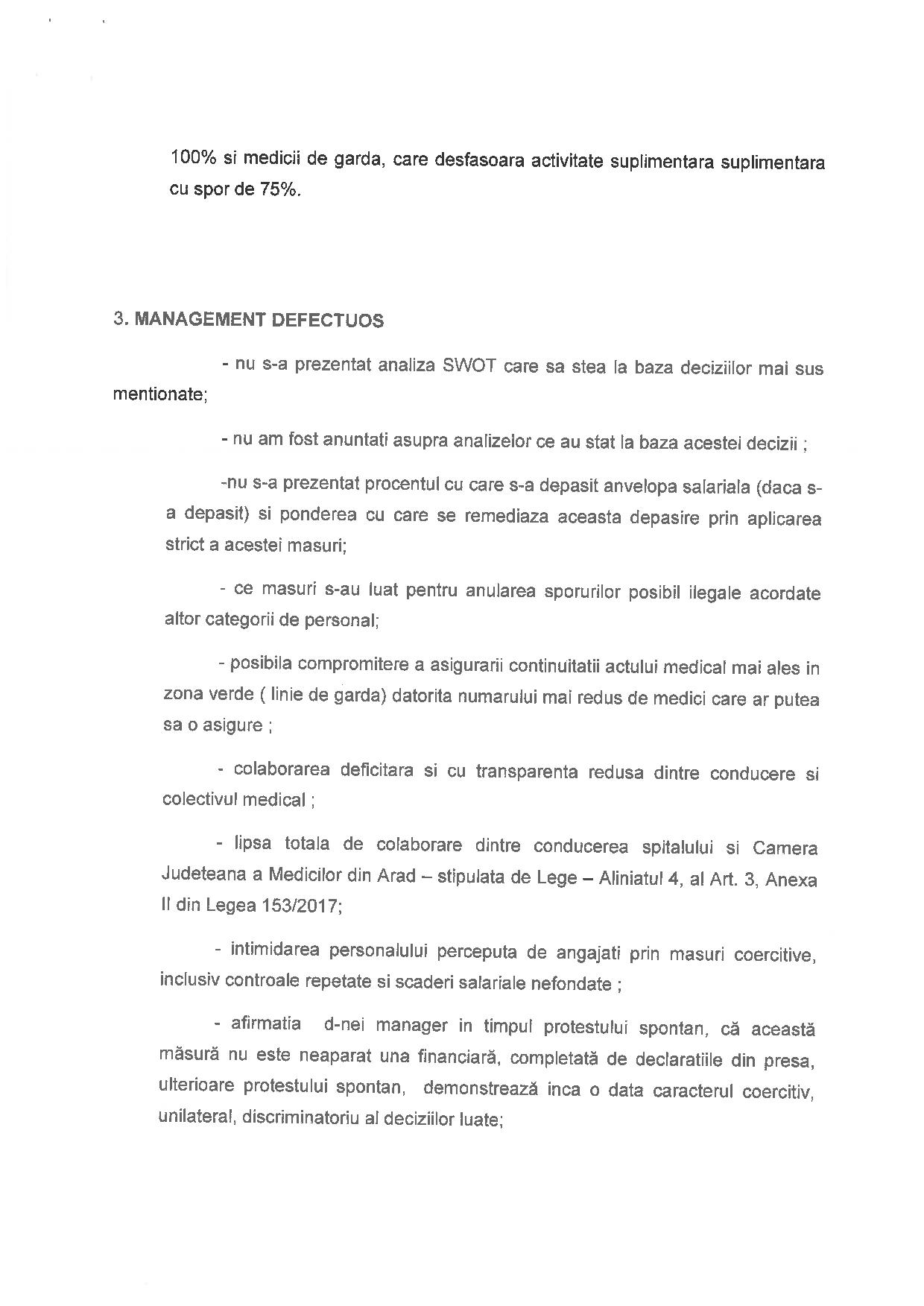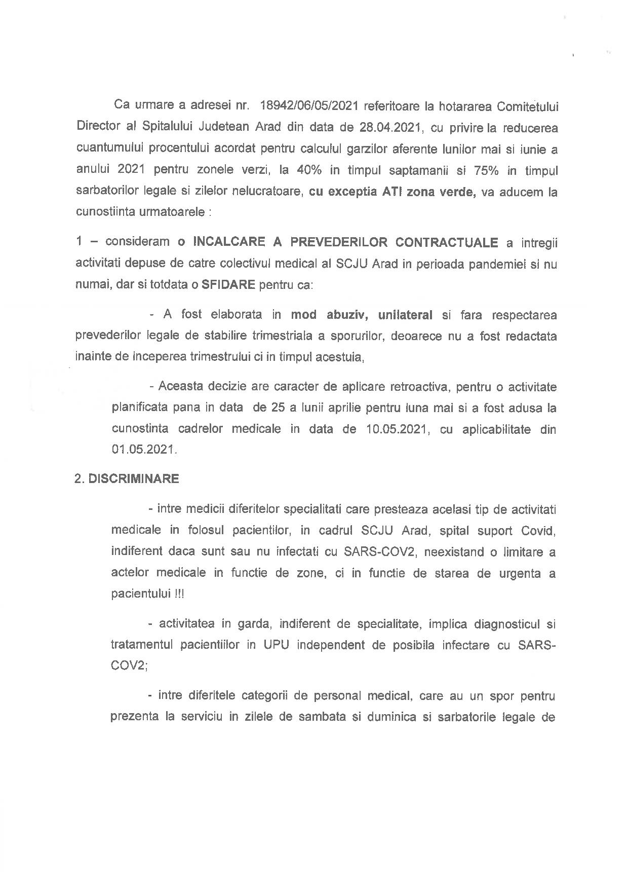 „Ca urmare a adresei nr. 18942/06/05/2021 referitoare la hotărârea Comitetului Director al Spitalului Județean Arad din data de 28.04.2021, cu privire la reducerea cuantumului procentului acordat pentru calculul gărzilor aferente lunilor mai și iunie a anului 2021 pentru zonele verzi, la 40% în timpul săptămânii și 75% în timpul sărbătorilor legale și zilelor nelucrătoare, cu excepția ATI zona verde, vă aducem la cunoștință următoarele: considerăm o încălcare a prevederilor contractuale a întregii activități depuse de către colectivul medical al SCJU Arad în perioada pandemiei, dar totodată și o sfidare pentru că a fost elaborată în mod abuziv, unilateral si fără respectarea prevederilor legale de stabilire trimestrială a sporurilor, deoarece nu a fost redactată înainte de începerea trimestrului, ci în timpul acestuia. Această decizie are caracter de aplicare retroactivă, pentru o activitate planificată până în data de 25 a lunii aprilie pentru luna mai și a fost adusă la cunoștința cadrelor medicale în data de 10.05.2021, cu aplicabilitate din 01.05.2021.”