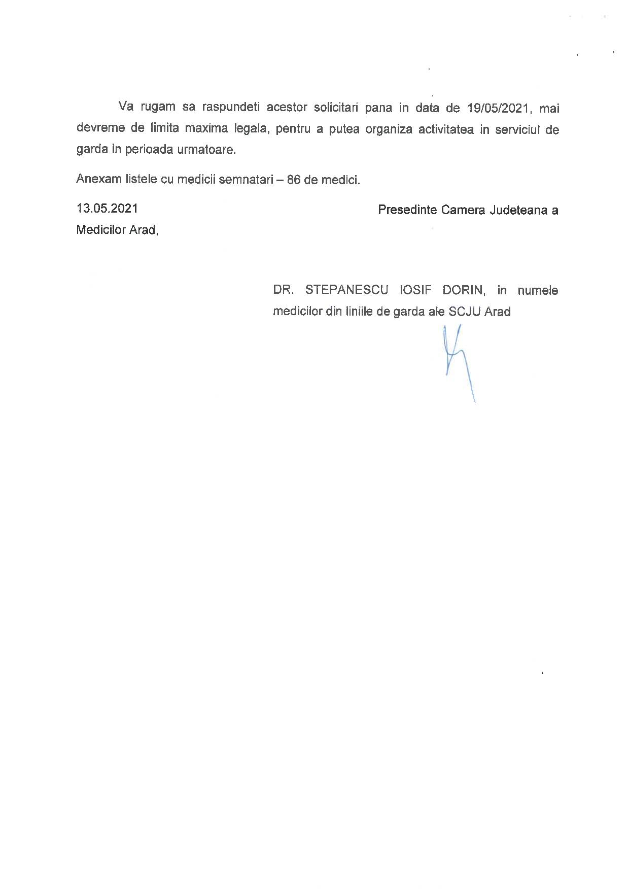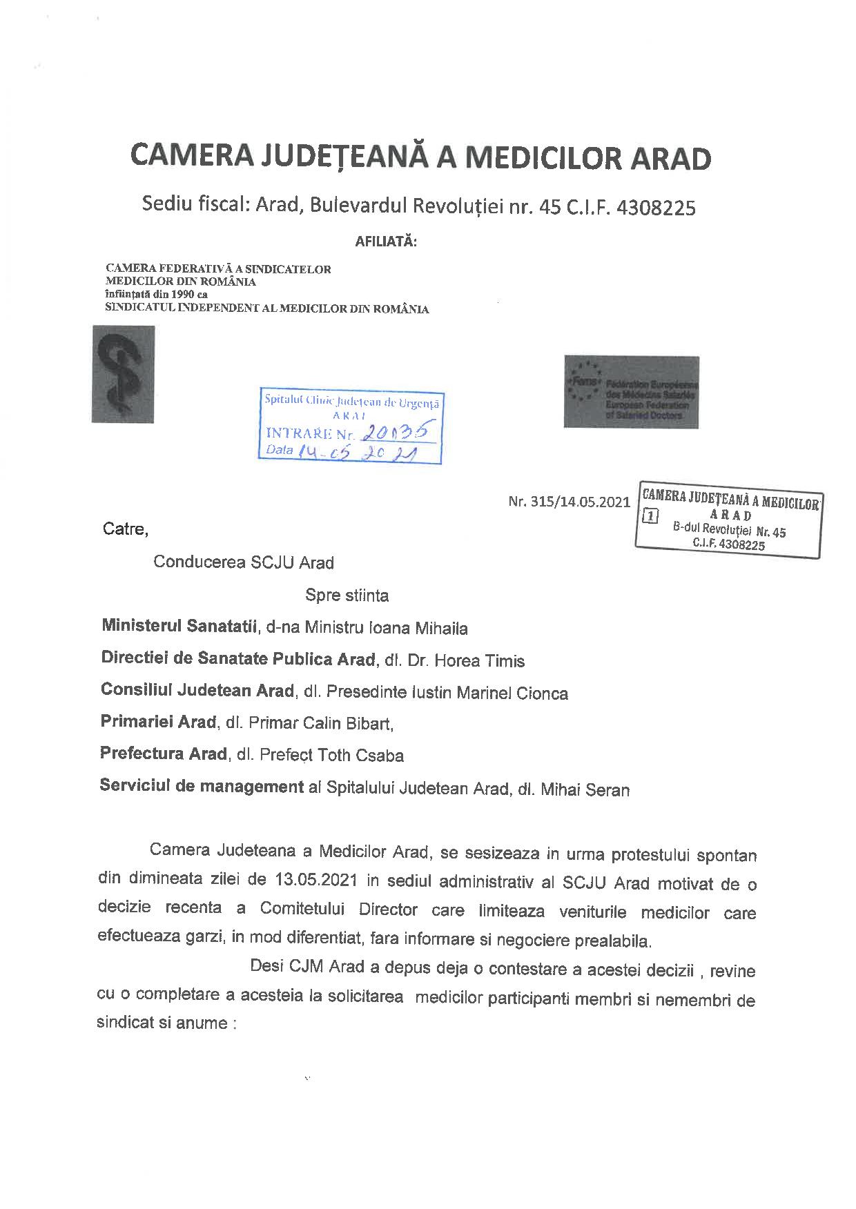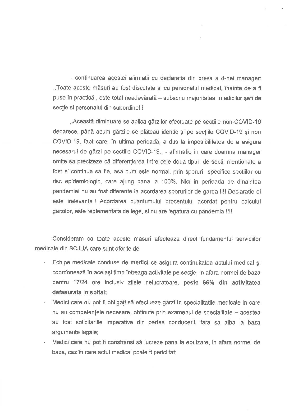 „Ca urmare a adresei nr. 18942/06/05/2021 referitoare la hotărârea Comitetului Director al Spitalului Județean Arad din data de 28.04.2021, cu privire la reducerea cuantumului procentului acordat pentru calculul gărzilor aferente lunilor mai și iunie a anului 2021 pentru zonele verzi, la 40% în timpul săptămânii și 75% în timpul sărbătorilor legale și zilelor nelucrătoare, cu excepția ATI zona verde, vă aducem la cunoștință următoarele: considerăm o încălcare a prevederilor contractuale a întregii activități depuse de către colectivul medical al SCJU Arad în perioada pandemiei, dar totodată și o sfidare pentru că a fost elaborată în mod abuziv, unilateral si fără respectarea prevederilor legale de stabilire trimestrială a sporurilor, deoarece nu a fost redactată înainte de începerea trimestrului, ci în timpul acestuia. Această decizie are caracter de aplicare retroactivă, pentru o activitate planificată până în data de 25 a lunii aprilie pentru luna mai și a fost adusă la cunoștința cadrelor medicale în data de 10.05.2021, cu aplicabilitate din 01.05.2021.”