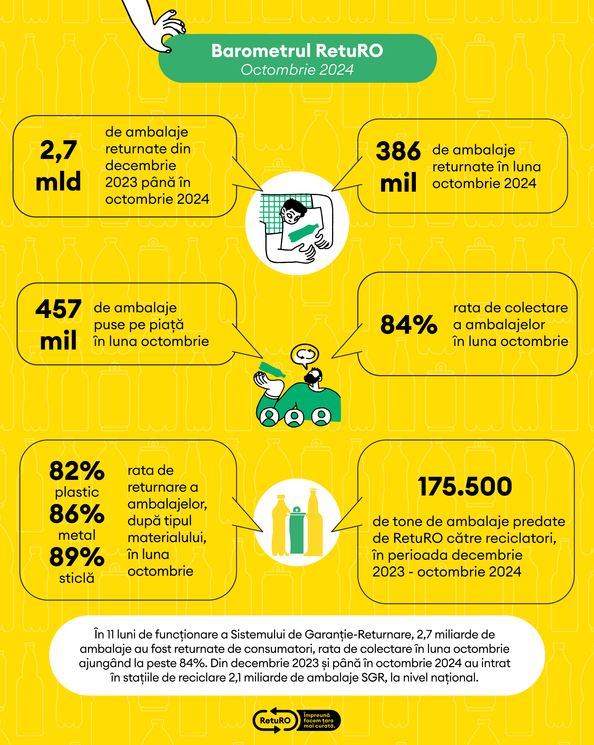 Odată cu creșterea apetitului românilor pentru utilizarea cu frecvență mai mare a Sistemului de Garanție-Returnare, crește însă și necesitatea dezvoltării infrastructurii de puncte de returnare în proximitate, de altfel una dintre direcțiile strategice viitoare ale RetuRO. În plus, este necesară deschiderea unor noi centre de sortare-numărare pentru a face față ratelor de returnare ridicate (81% în septembrie 2024 și 84% în octombrie). În prezent, există 7 astfel de centre care au creat în total peste 800 de locuri de muncă verzi în regiunile Cluj, Timiș, Brașov, Ilfov, Bacău, Dolj și Prahova. În următoarele luni, alte 2 noi centre vor fi deschise în județele Bihor și Constanța, iar rețeaua de puncte de returnare va fi extinsă.