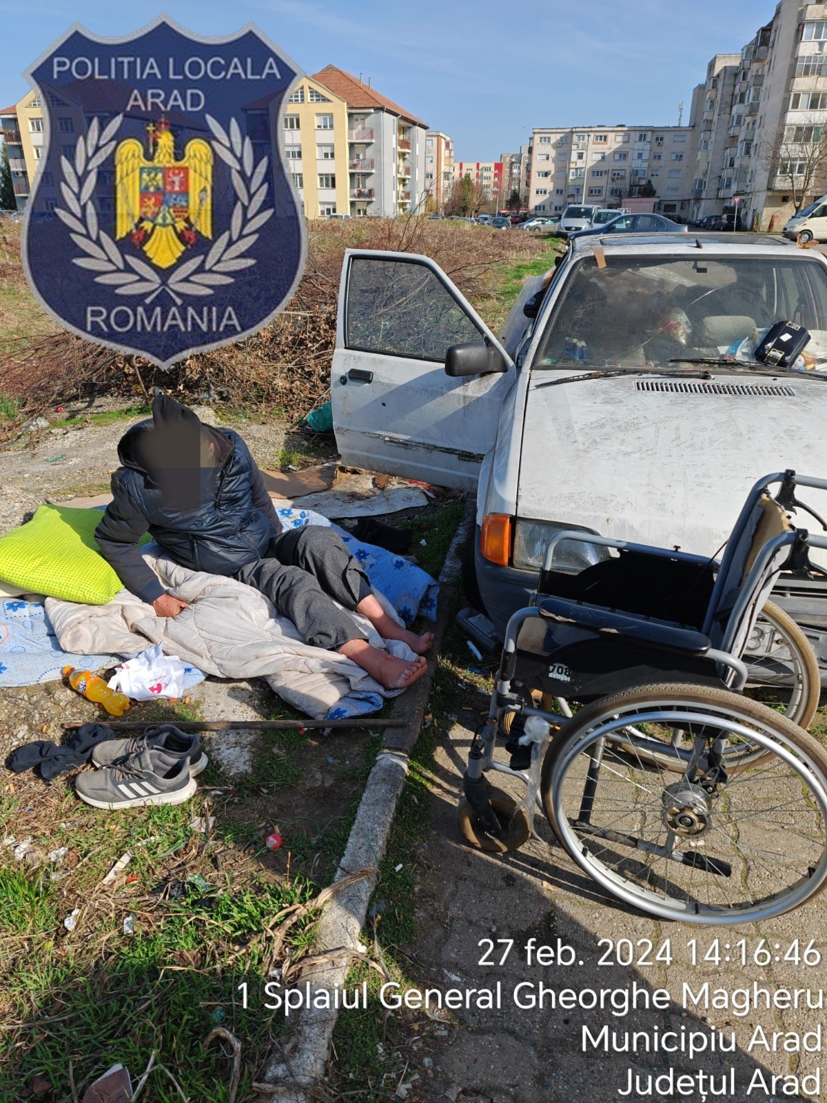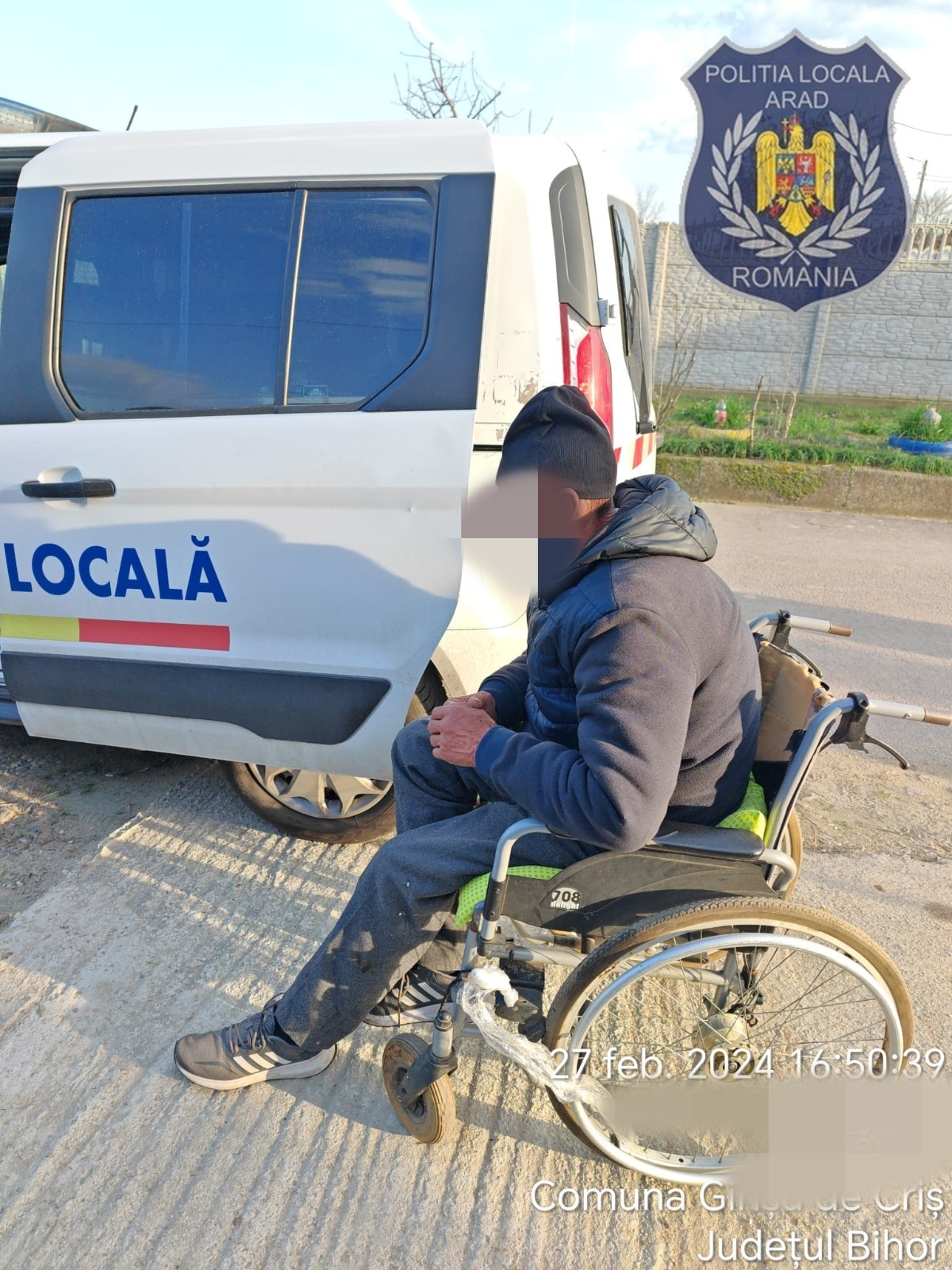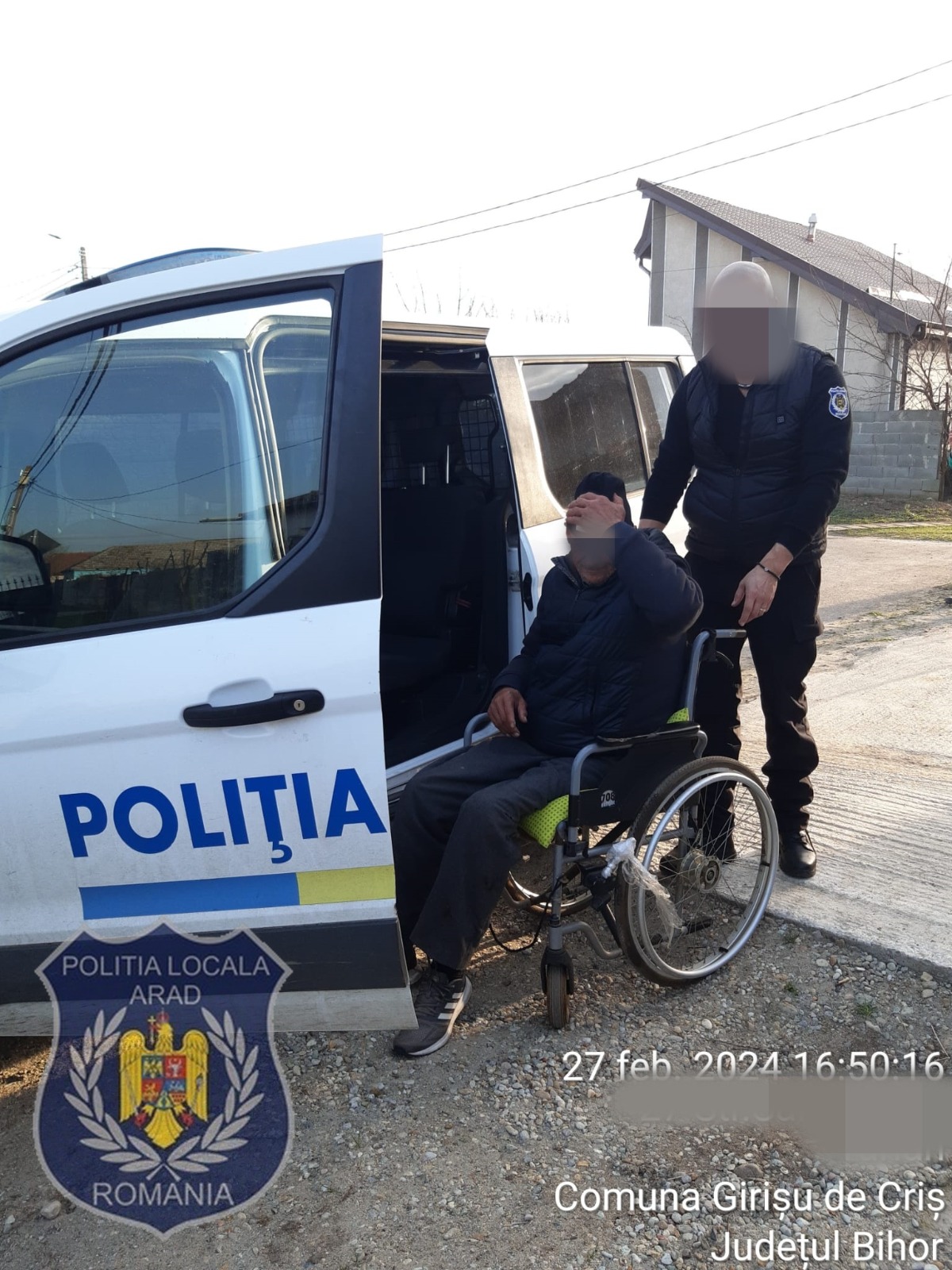 „În data de 27.02.2024, o patrulă de ordine publică din cadrul Direcției Generale Poliția Locală Arad a condus, cu autoutilitara din dotare, la locul de domiciliu din județul Bihor, o persoană fără adăpost aflată în municipiul Arad încă din anul 2012”, spune Poliția Locală.Este vorba despre un bărbat în vârstă de 56 de ani care pe timpul verii „locuia” într-o mașină abandonată în apropierea a unui supermarket din cartierul Micălaca, iar iarna apela la serviciile oferite de Adăpostul de noapte al Direcției de Asistență Socială. Situația sa este agravată și de o afecțiune care îi creează dificultăți în deplasare, făcându-l dependent de scaunul cu rotile.“Problemele pe care le-a întâmpinat pe durata prezenței în Municipiul Arad l-au plasat în postura de a fi sancționat de 45 de ori de polițiștii locali, pentru nesocotirea în mod repetat a prevederilor Legii nr. 61/1991, republicată, pentru sancționarea faptelor de încălcare a unor norme de conviețuire socială, a ordinii și liniștii publice (consum de alcool pe domeniul public și apelarea în mod repetat la mila publicului), respectiv a Legii nr. 349/2002 pentru prevenirea și combaterea efectelor consumului produselor din tutun (fumat în mijloace de transport în comun). Cele mai multe fapte contravenționale au fost constatate în cartierul Micălaca și zona centrală”, mai spun cei de la Locală.