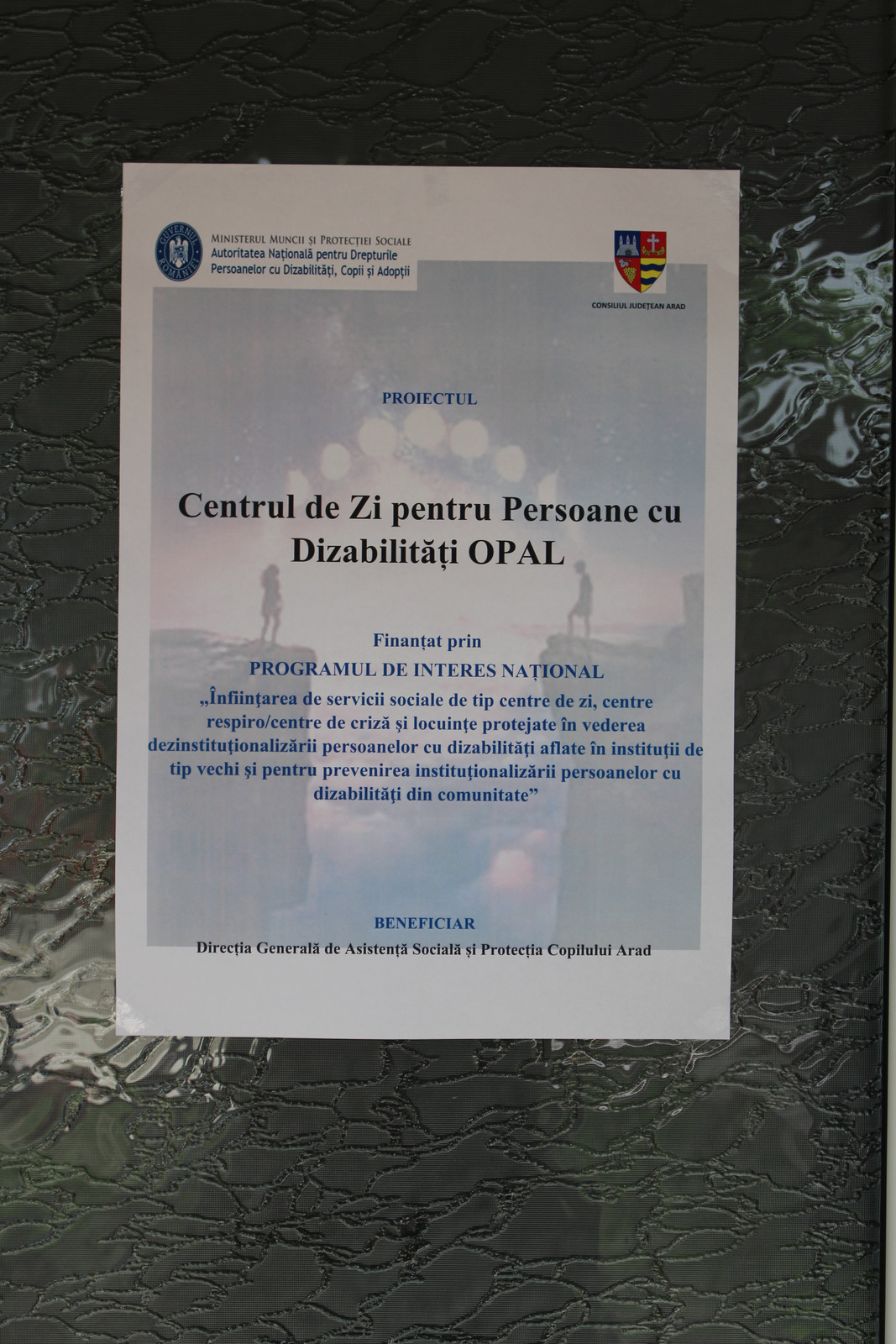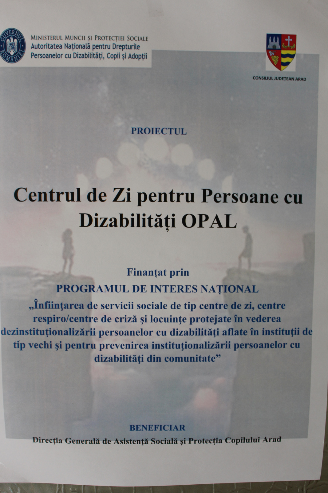 Proiectul „Centrul de zi pentru persoane cu dizabilități OPAL” este finanțat de Autoritatea Națională pentru Drepturile Persoanelor cu Dizabilități, Copii și Adopții, cofinanțat de Consiliul Județean Arad și implementat de Direcţia Generală de Asistenţă Socială şi Protecţia Copilului Arad în cadrul Programului de Interes Naţional „Înfiinţarea de servicii sociale de tip centre de zi, centre respiro/centre de criză şi locuinţe protejate în vederea dezinstituţionalizării persoanelor cu dizabilităţi aflate în instituţii de tip vechi şi pentru prevenirea instituţionalizării persoanelor cu dizabilităţi din comunitate.”