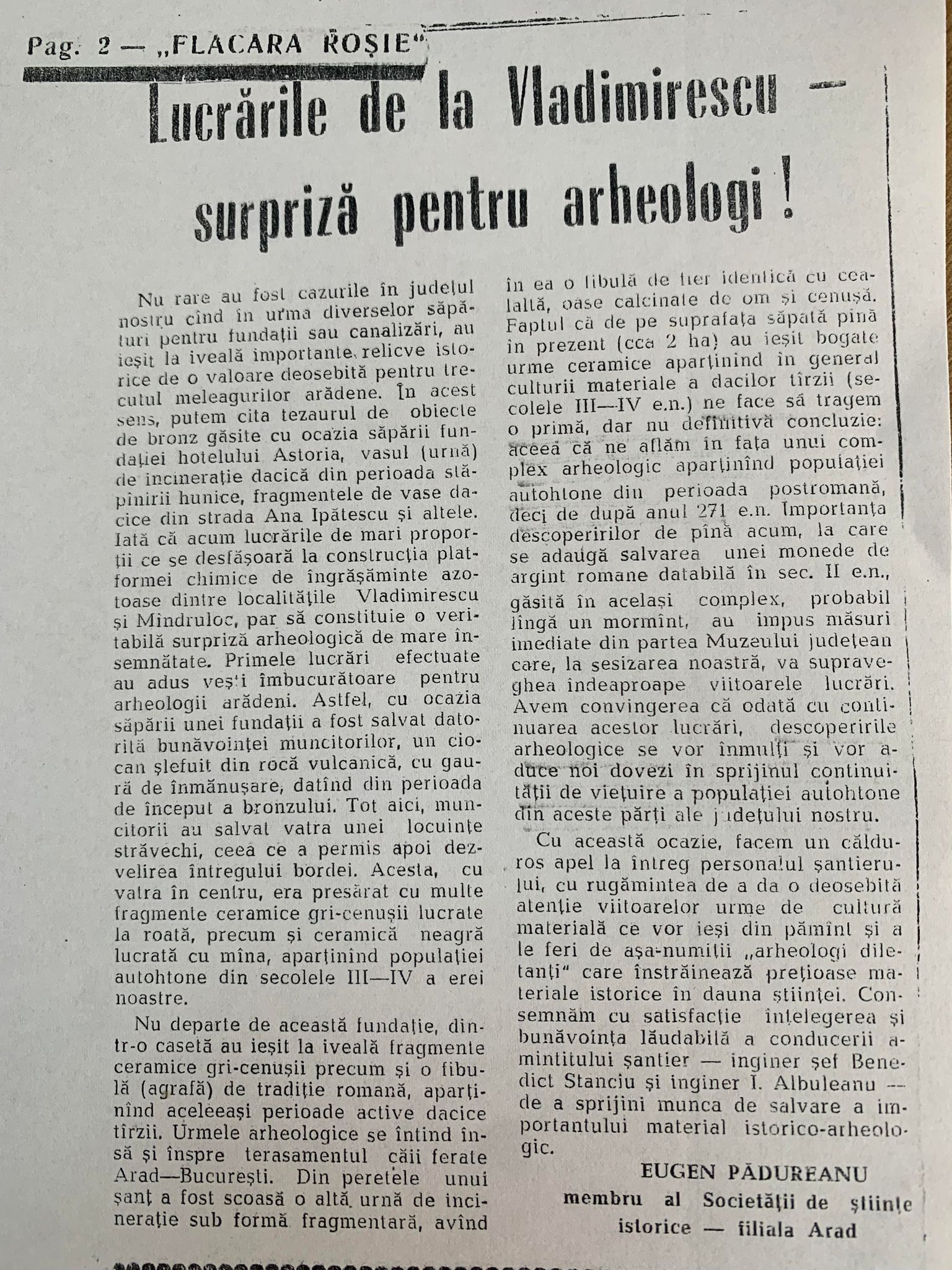 Octavian Lupaș, preocupat de istoria Aradului îl contactează pe istoricul Dan Demșa pentru ca să poată intra în legătură cu arheologul Eugen D. Pădurean. Întâlnirea dintre cei doi, Lupaș și Pădurean, avea să se întâmple în locuința celui din urmă. Lui Octavian Lupaș i-a dat de gândit movila care exista la Vest de comuna Vladimirescu, pe o porțiune mai înălțată înconjurată de vechi brațe ale Mureșului. Octavian Lupaș sugera o importanță istorică a detaliilor de teren din acel loc.