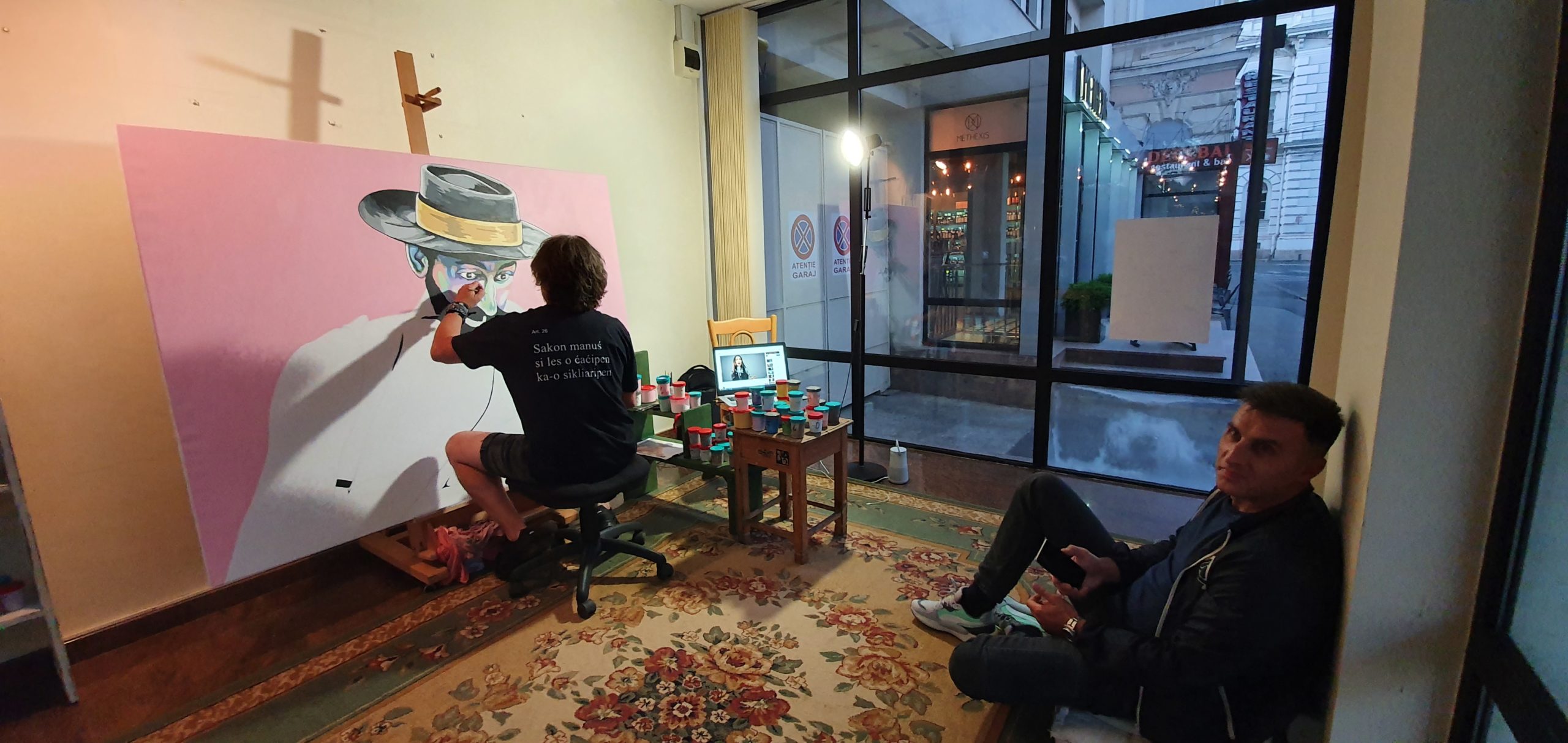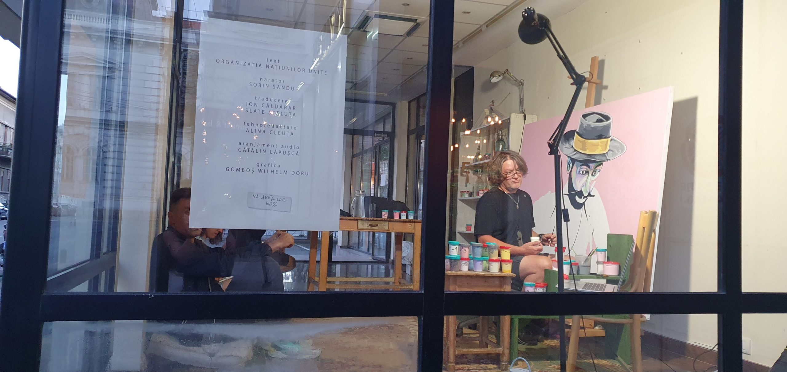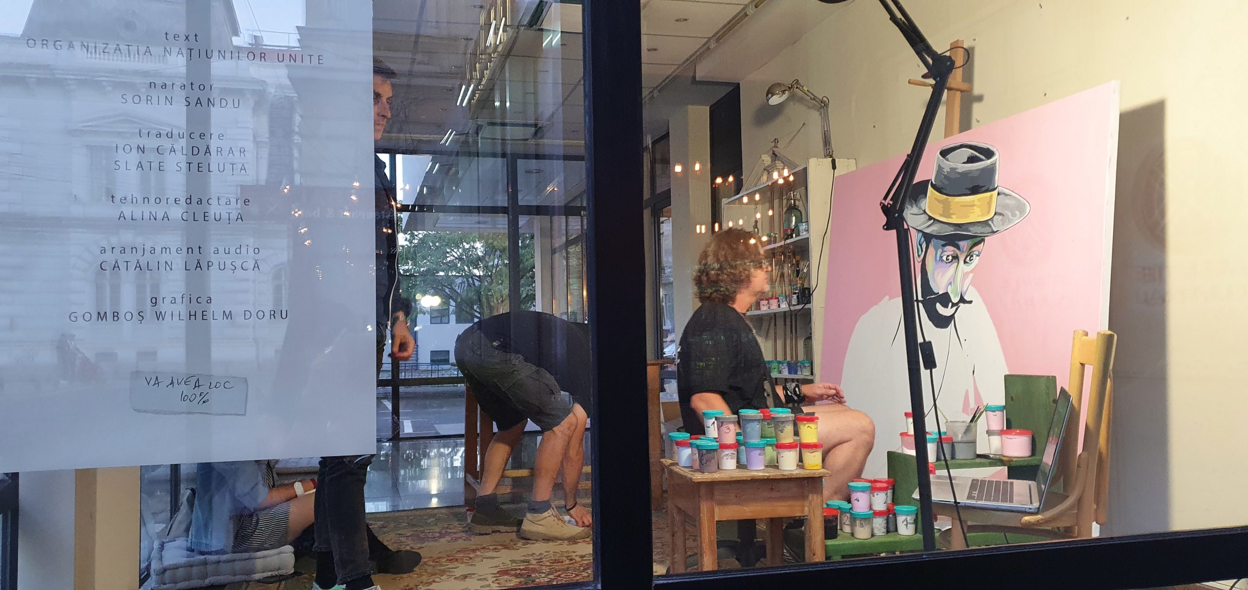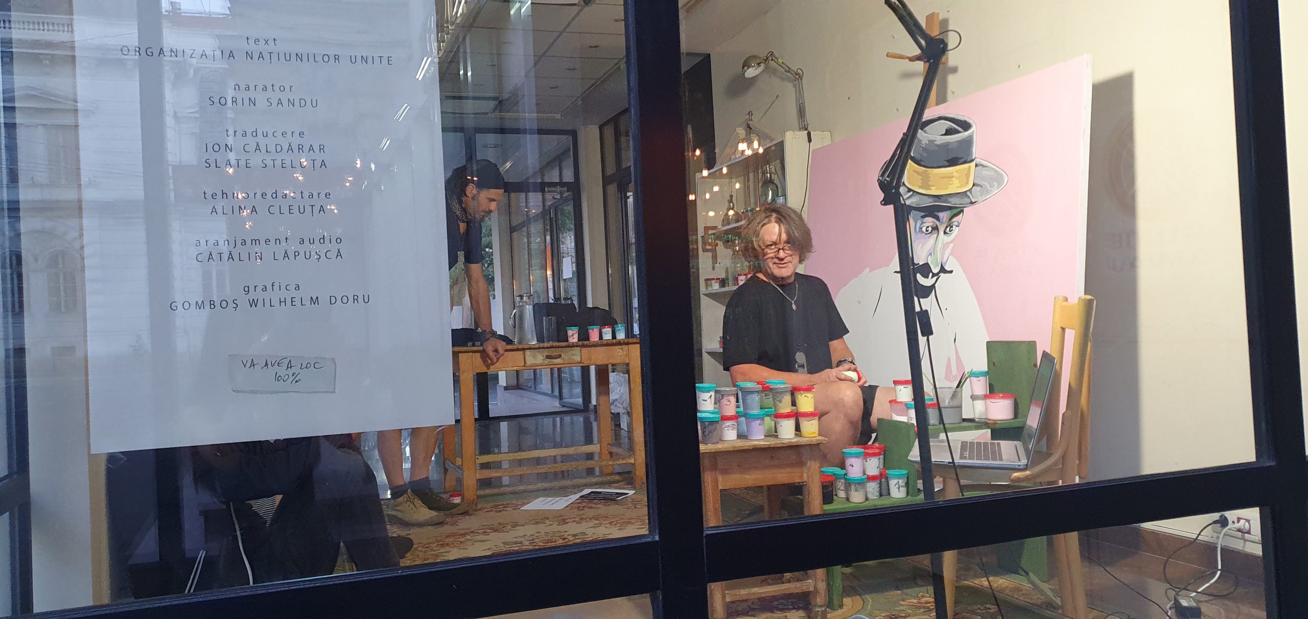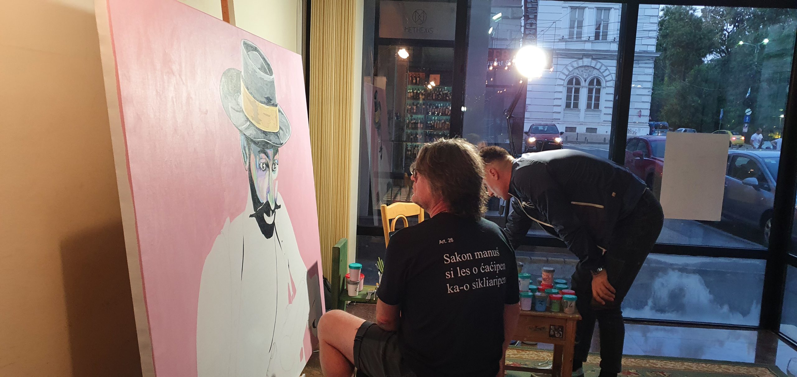 Dacă aici mai sunt aranjate ca la carte mănuși, joben, un taburet elegant, o veioză vintage, în încăperea alăturată, unde pictorul își petrece serile, vezi borcane cu culoare, pensule, o hărmălaie creativă, cu tineri întinși pe jos, stând pe câte o pernă, sau direct pe covorul de spectacol al artistului. Două coli A4 te îndeamnă să le citești: „Art. 23. Orice persoană are dreptul la muncă”. Tricoul pictorului te cheamă și el la lectură: același articol 23, de data aceasta în țigănește:”Sakon manus si les o cacipen ka-i buti”. Știi că va urma o expoziție în care lucrările supradimensionate desprinse din filmul lui Kusturica vor fi însoțite de proiecții, de texte citite în țigănește, de muzică, într-un spațiu inedit, desigur. Dar nu-l întrebi despre expoziția care sigur va avea loc, cândva, îți lași subiectul pentru altă dată. Îl întrebi ce l-ar întreba probabil oricine care trece pe acolo: „De ce te expuiîn vitrină, de ce duci actul creației în public și nu doar creația finală?”.
