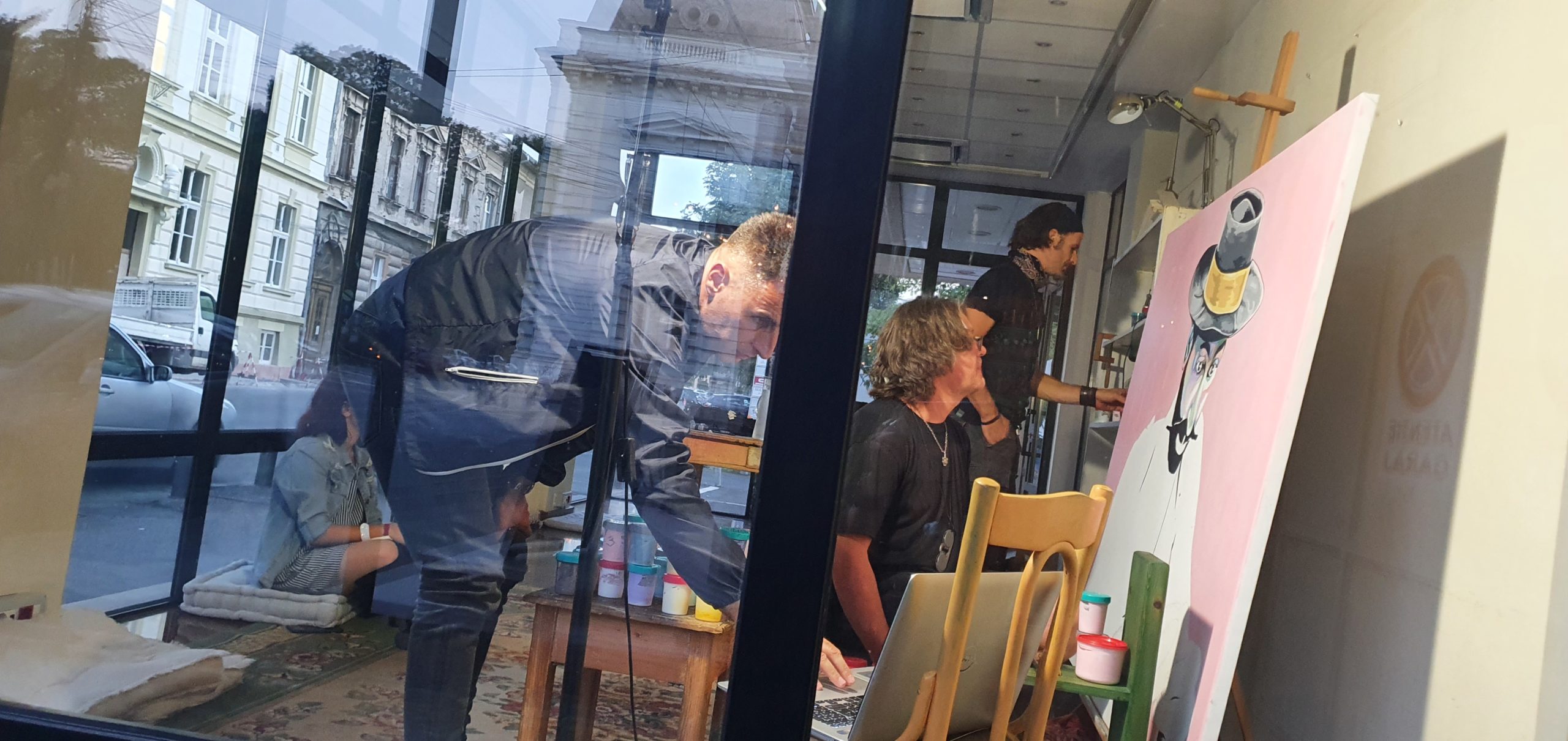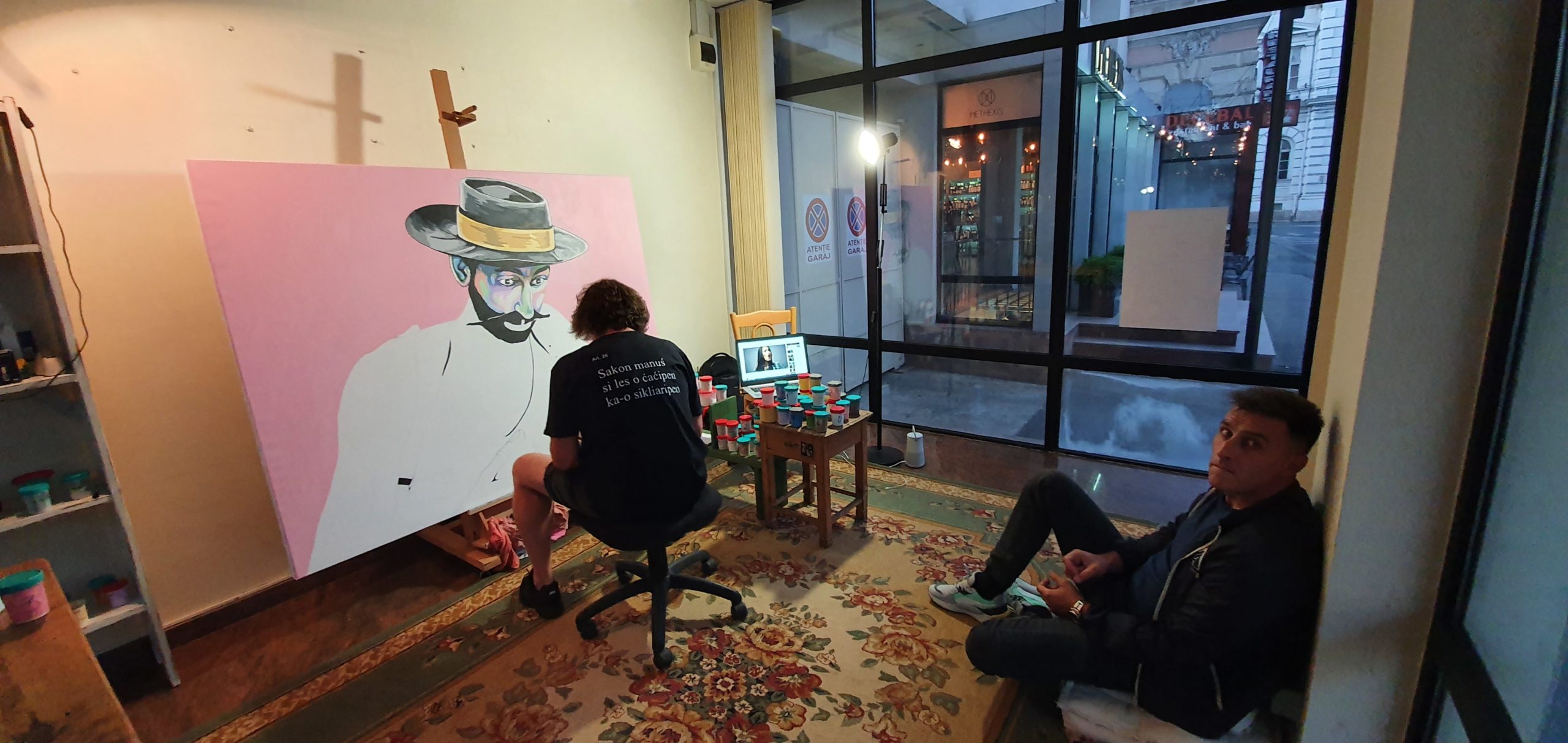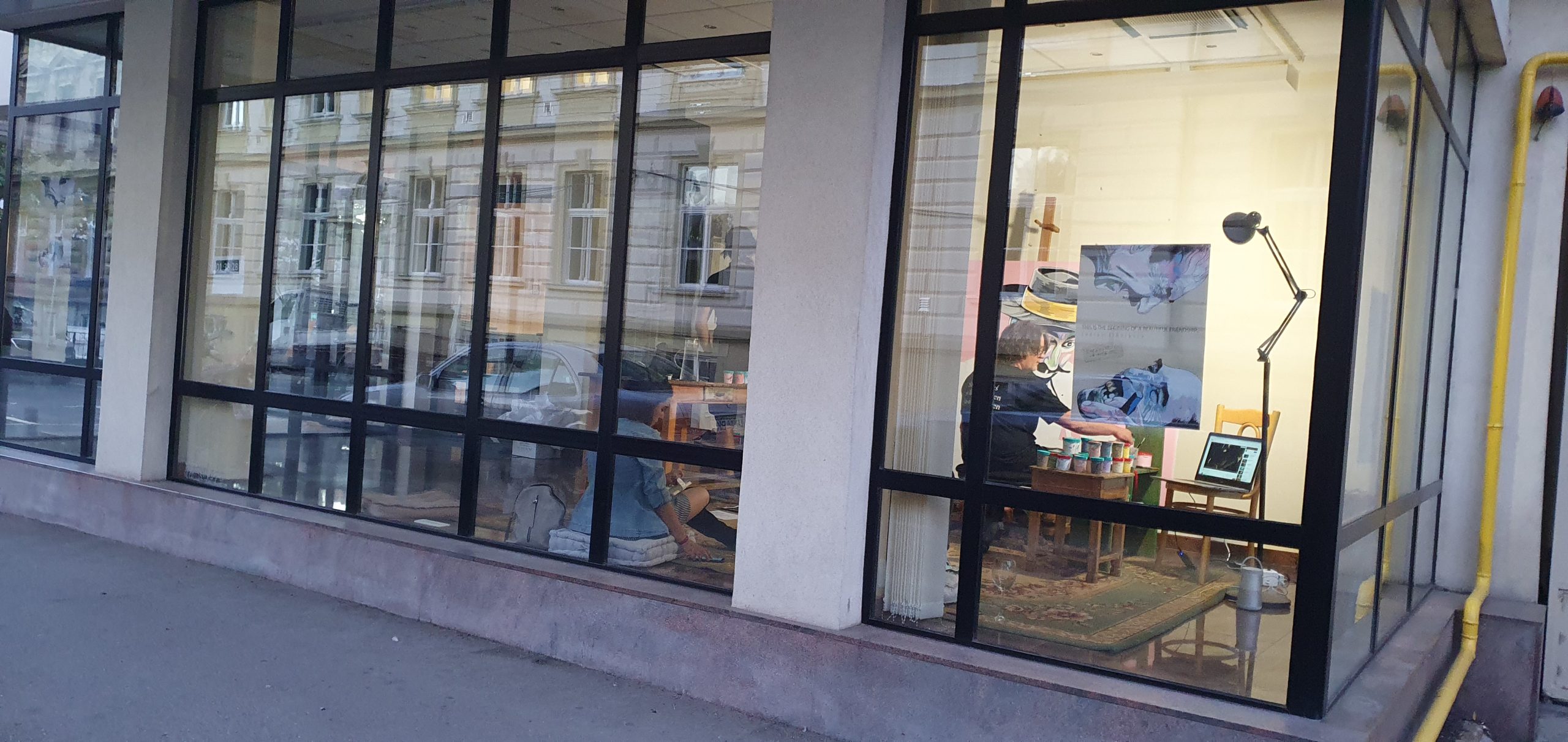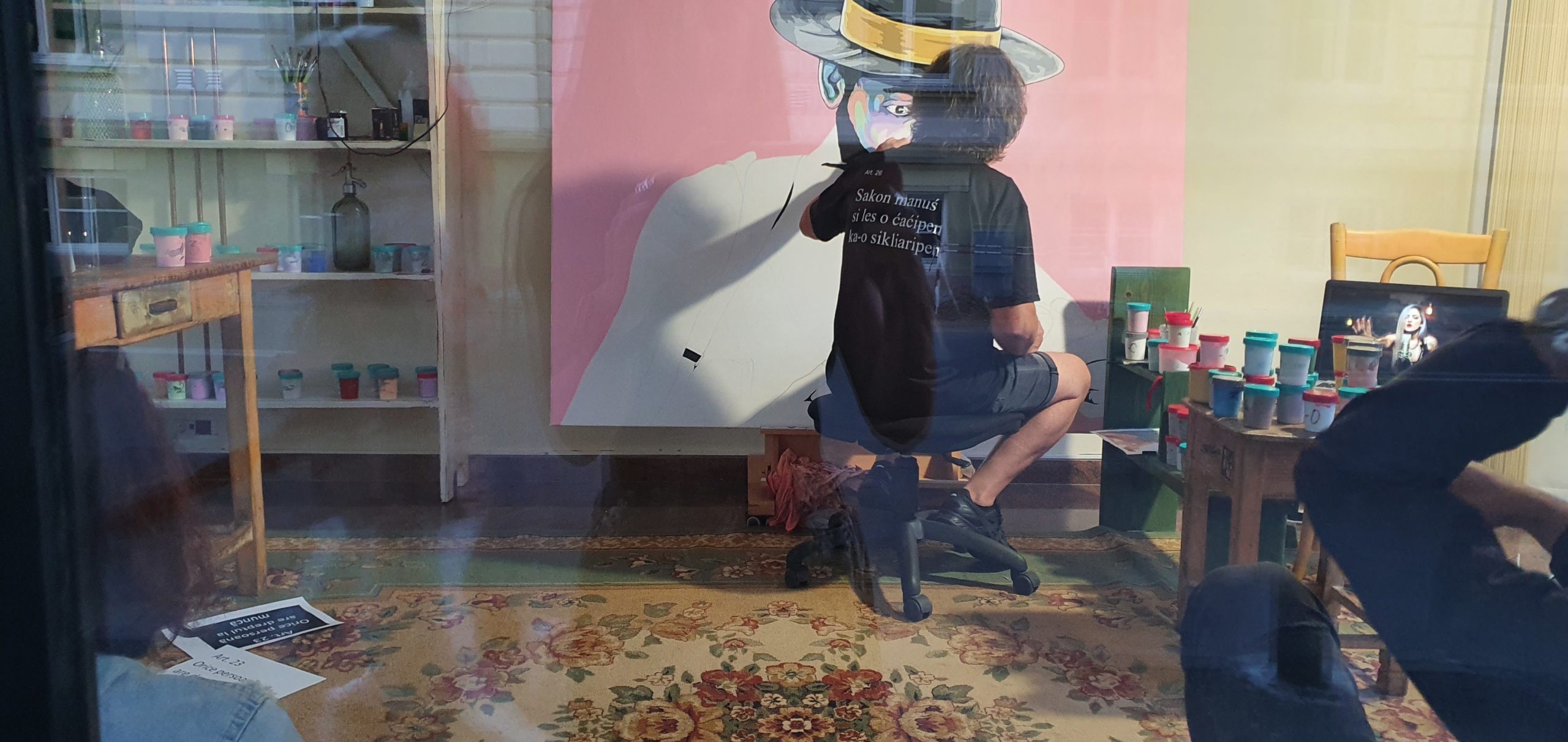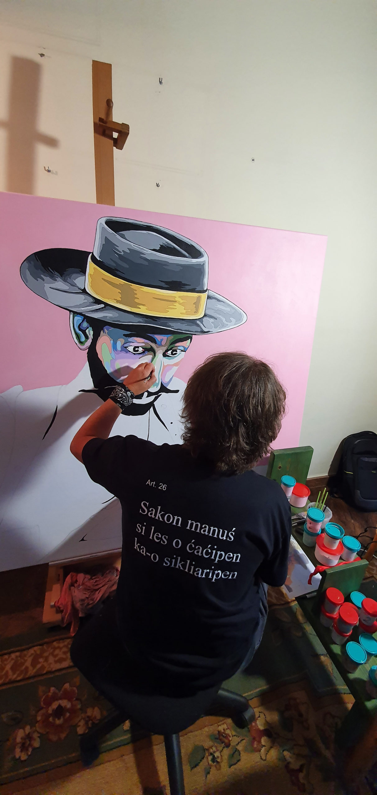 Dacă aici mai sunt aranjate ca la carte mănuși, joben, un taburet elegant, o veioză vintage, în încăperea alăturată, unde pictorul își petrece serile, vezi borcane cu culoare, pensule, o hărmălaie creativă, cu tineri întinși pe jos, stând pe câte o pernă, sau direct pe covorul de spectacol al artistului. Două coli A4 te îndeamnă să le citești: „Art. 23. Orice persoană are dreptul la muncă”. Tricoul pictorului te cheamă și el la lectură: același articol 23, de data aceasta în țigănește:”Sakon manus si les o cacipen ka-i buti”. Știi că va urma o expoziție în care lucrările supradimensionate desprinse din filmul lui Kusturica vor fi însoțite de proiecții, de texte citite în țigănește, de muzică, într-un spațiu inedit, desigur. Dar nu-l întrebi despre expoziția care sigur va avea loc, cândva, îți lași subiectul pentru altă dată. Îl întrebi ce l-ar întreba probabil oricine care trece pe acolo: „De ce te expuiîn vitrină, de ce duci actul creației în public și nu doar creația finală?”.