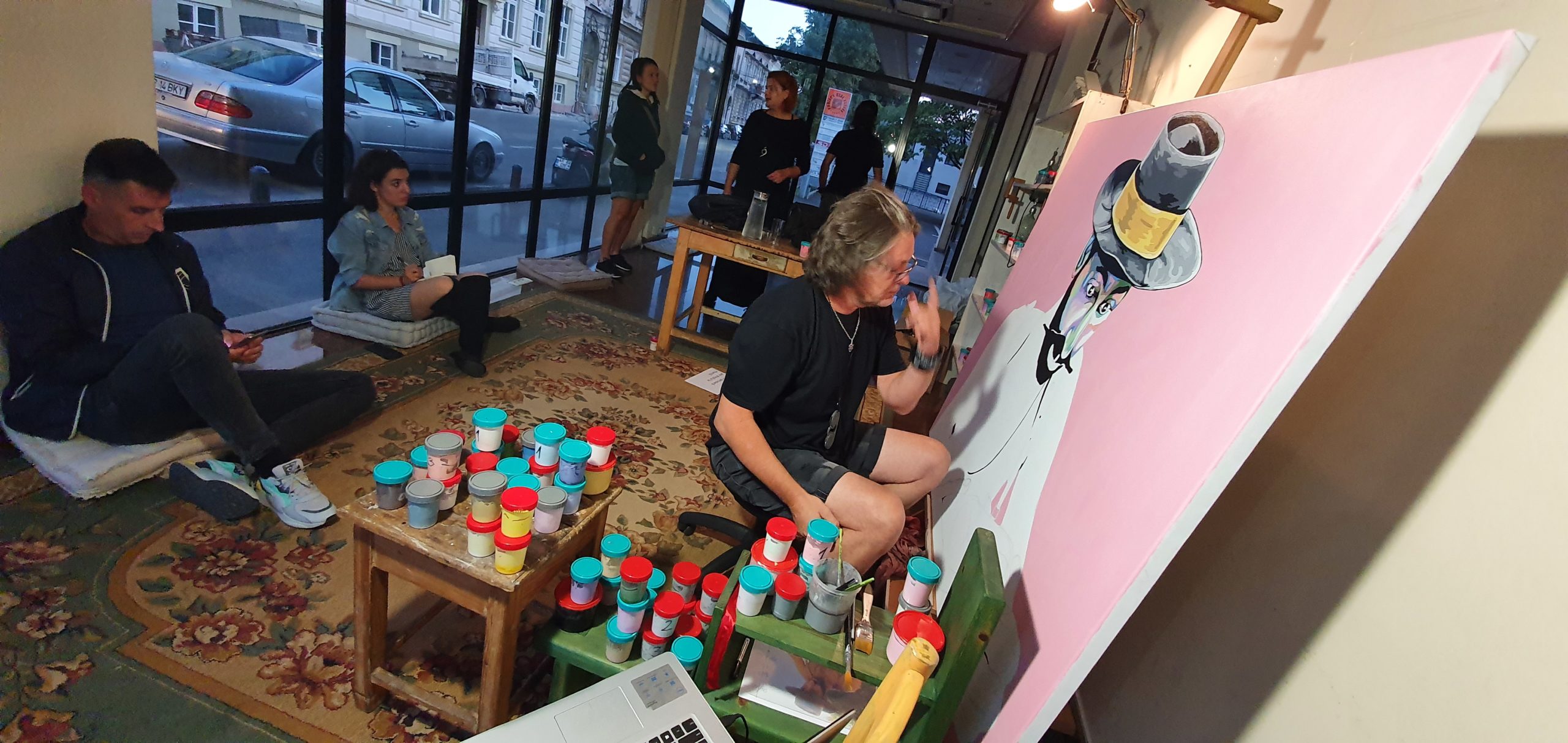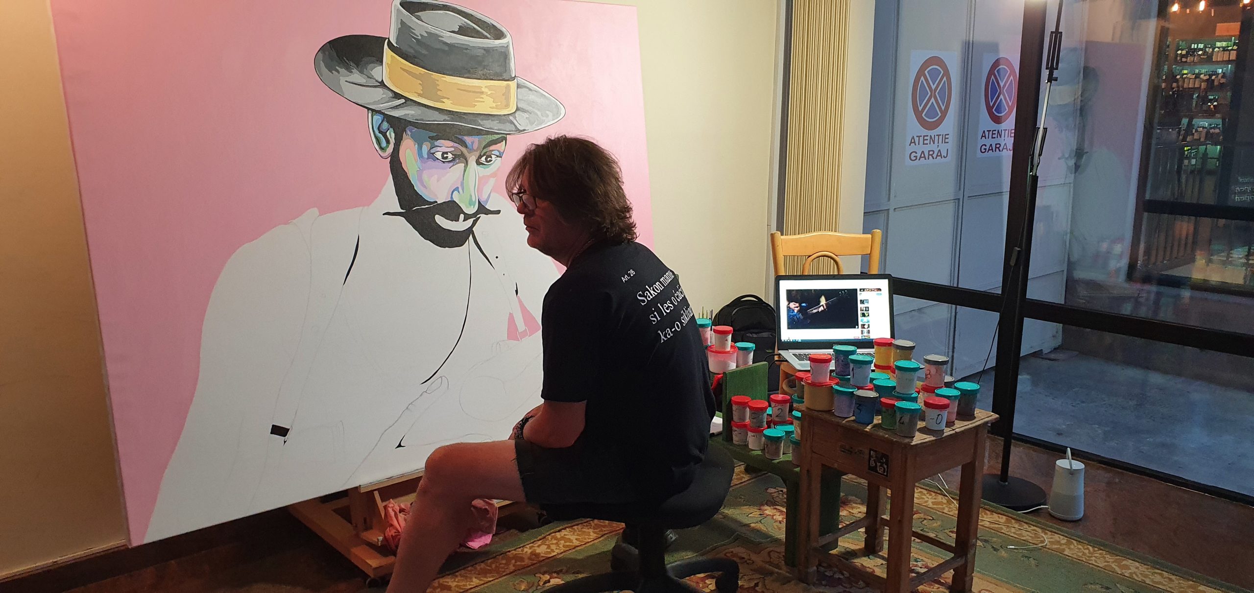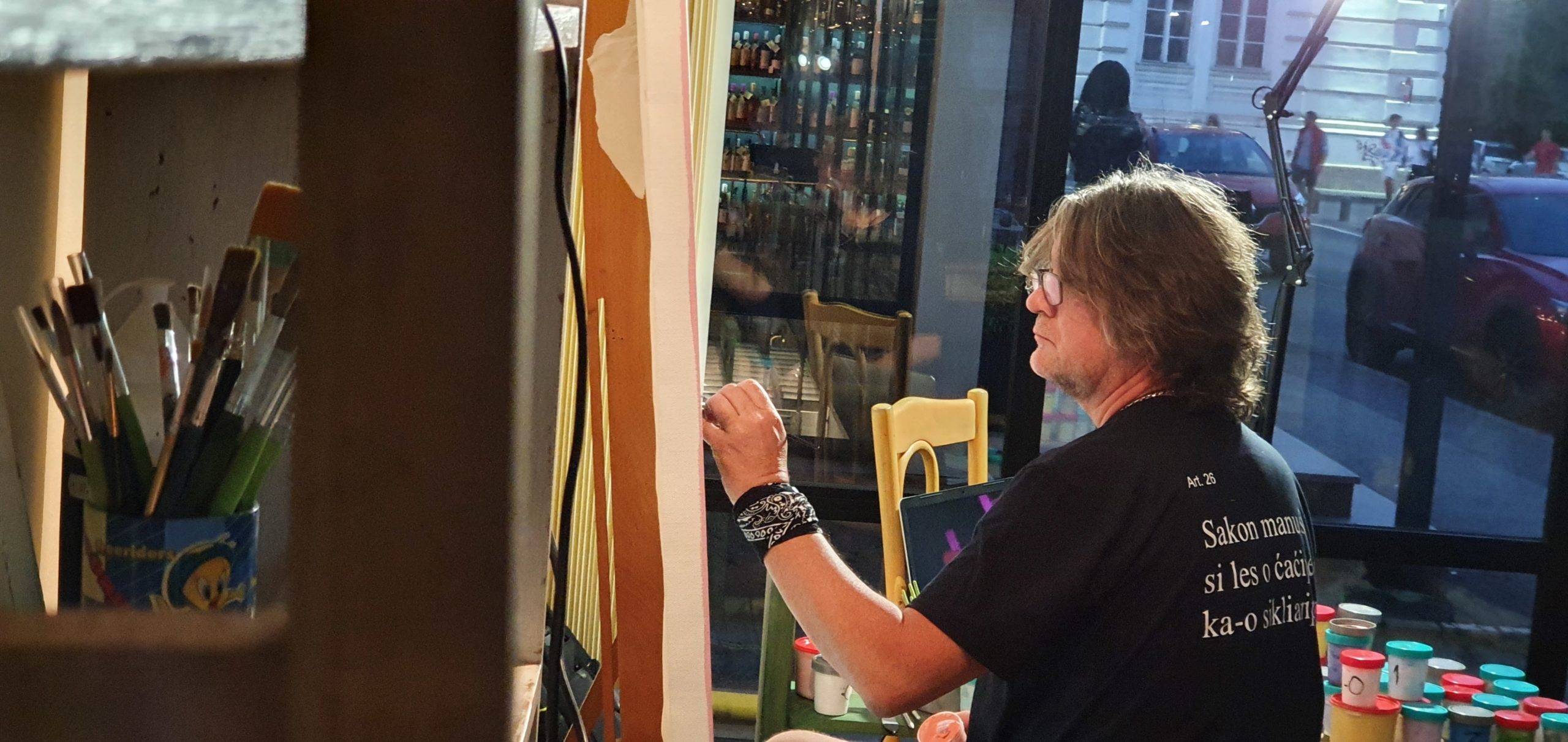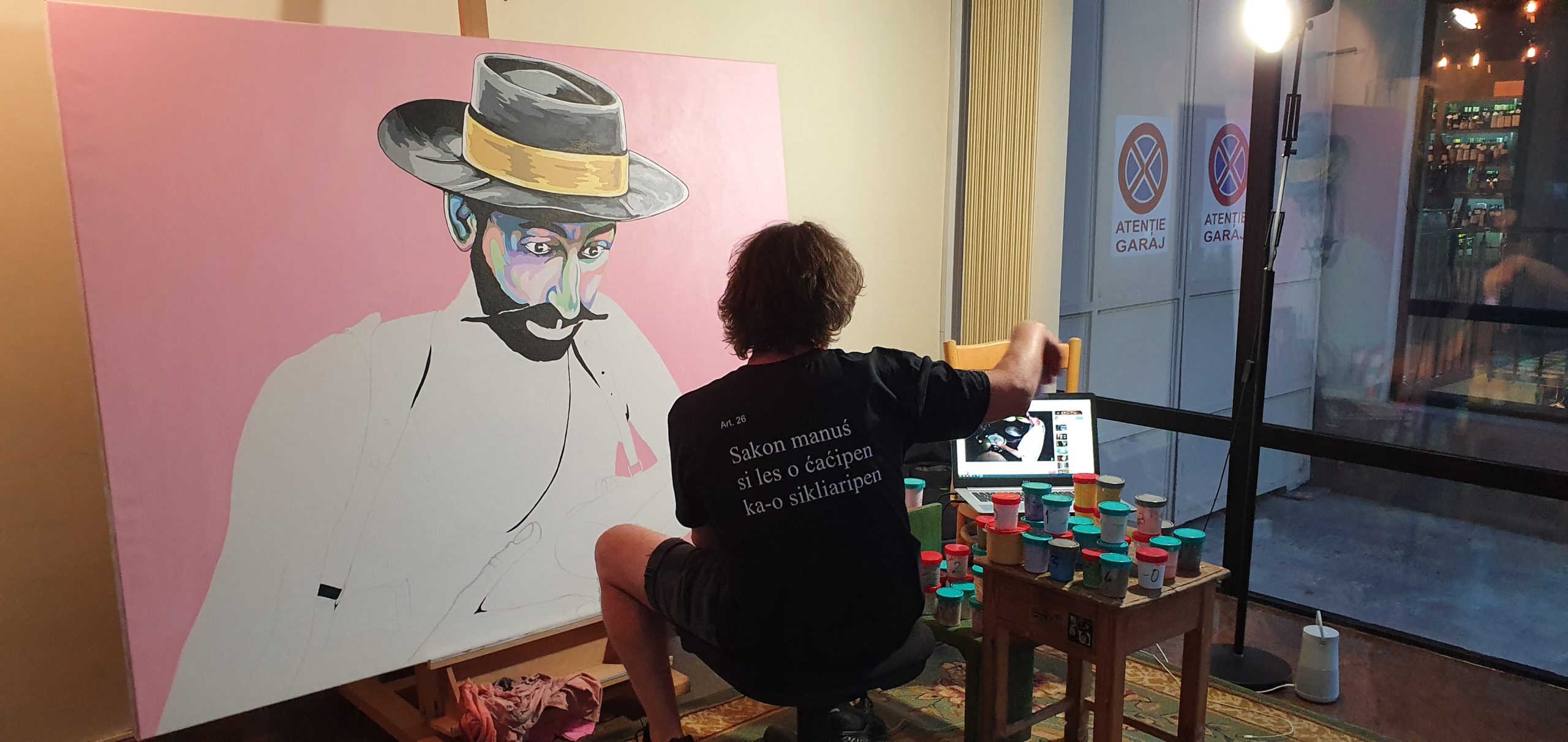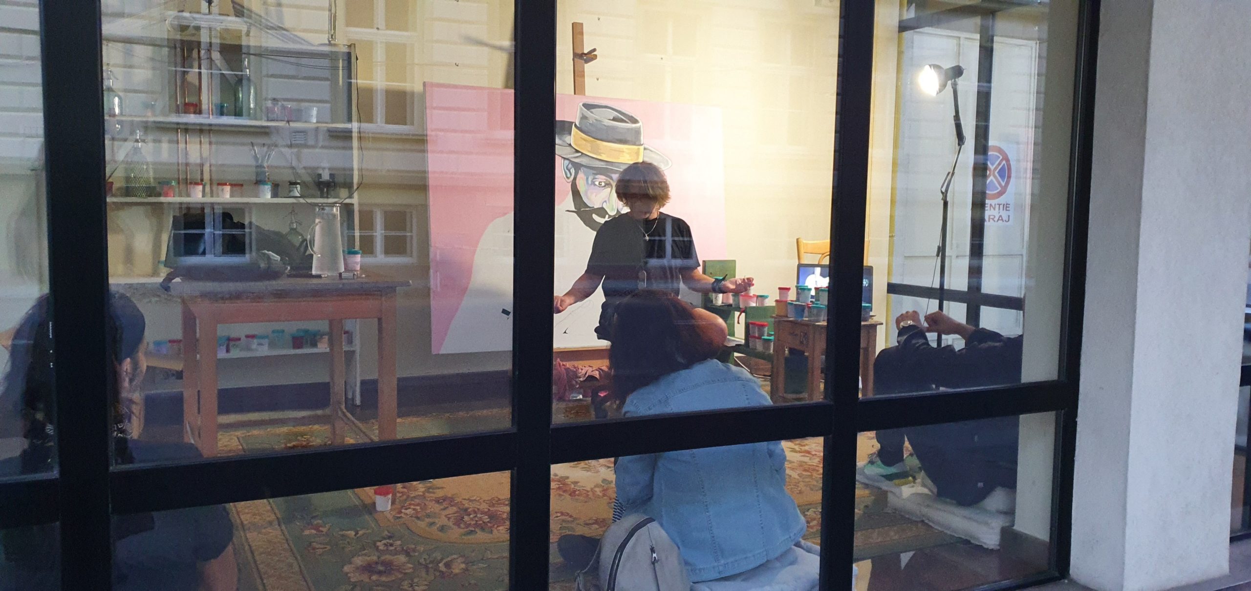 Dacă aici mai sunt aranjate ca la carte mănuși, joben, un taburet elegant, o veioză vintage, în încăperea alăturată, unde pictorul își petrece serile, vezi borcane cu culoare, pensule, o hărmălaie creativă, cu tineri întinși pe jos, stând pe câte o pernă, sau direct pe covorul de spectacol al artistului. Două coli A4 te îndeamnă să le citești: „Art. 23. Orice persoană are dreptul la muncă”. Tricoul pictorului te cheamă și el la lectură: același articol 23, de data aceasta în țigănește:”Sakon manus si les o cacipen ka-i buti”. Știi că va urma o expoziție în care lucrările supradimensionate desprinse din filmul lui Kusturica vor fi însoțite de proiecții, de texte citite în țigănește, de muzică, într-un spațiu inedit, desigur. Dar nu-l întrebi despre expoziția care sigur va avea loc, cândva, îți lași subiectul pentru altă dată. Îl întrebi ce l-ar întreba probabil oricine care trece pe acolo: „De ce te expuiîn vitrină, de ce duci actul creației în public și nu doar creația finală?”.