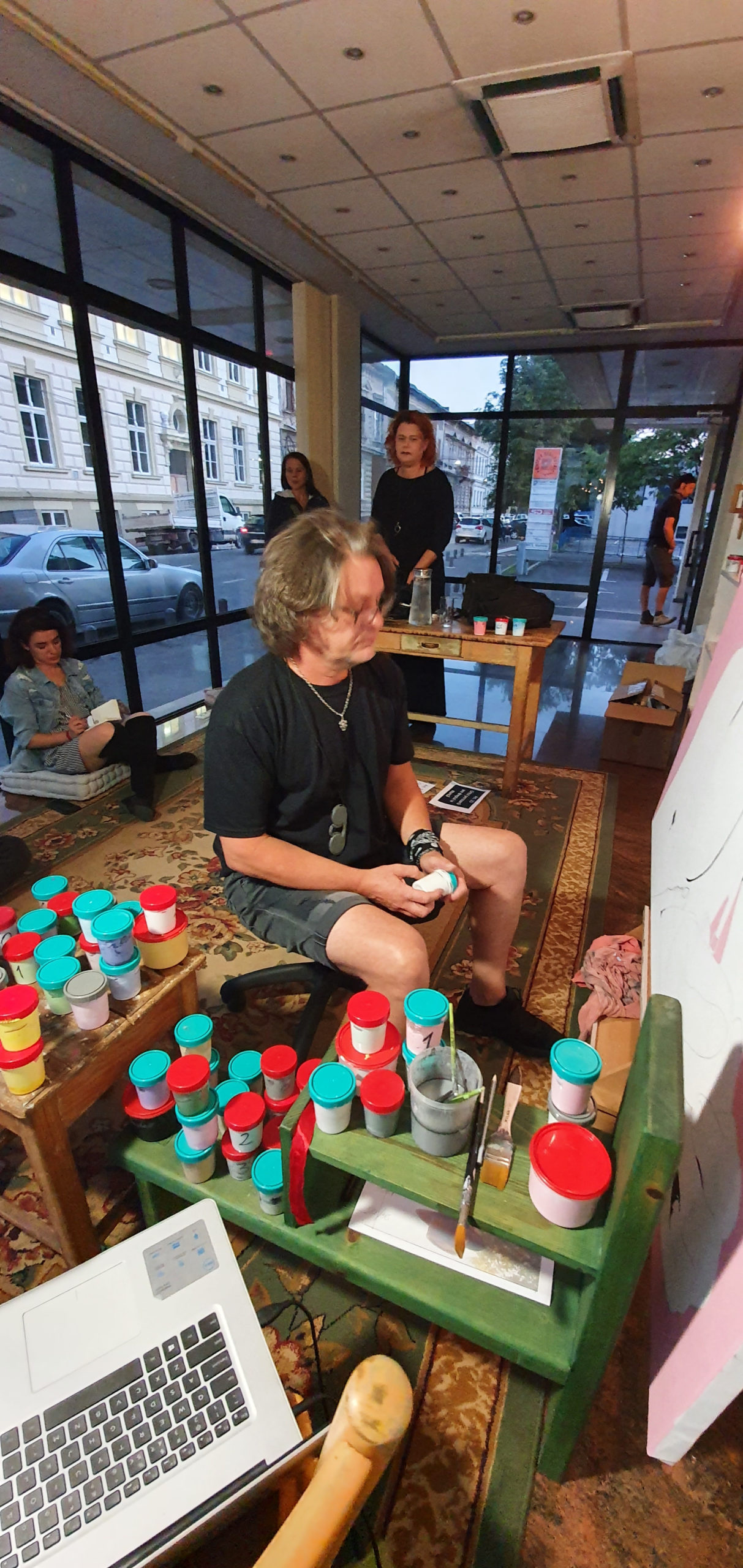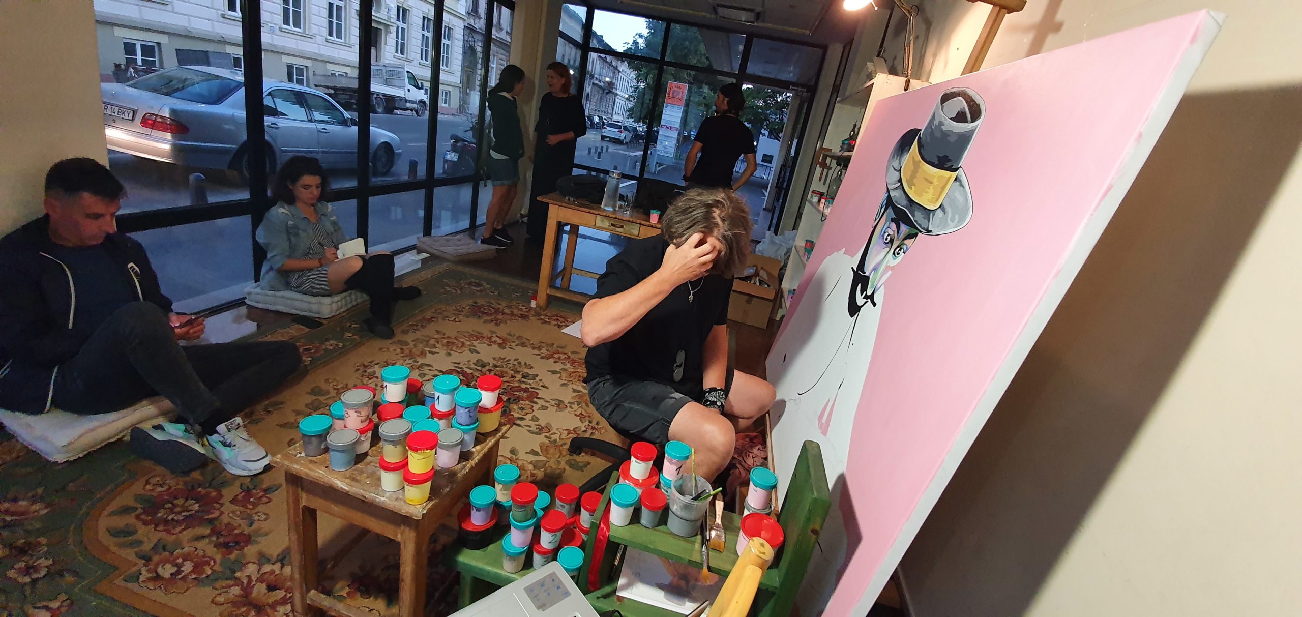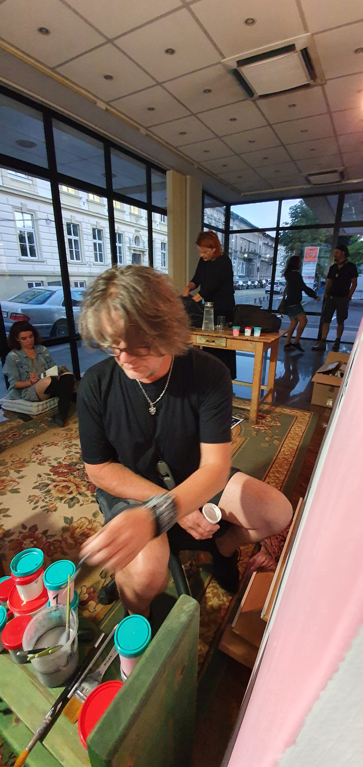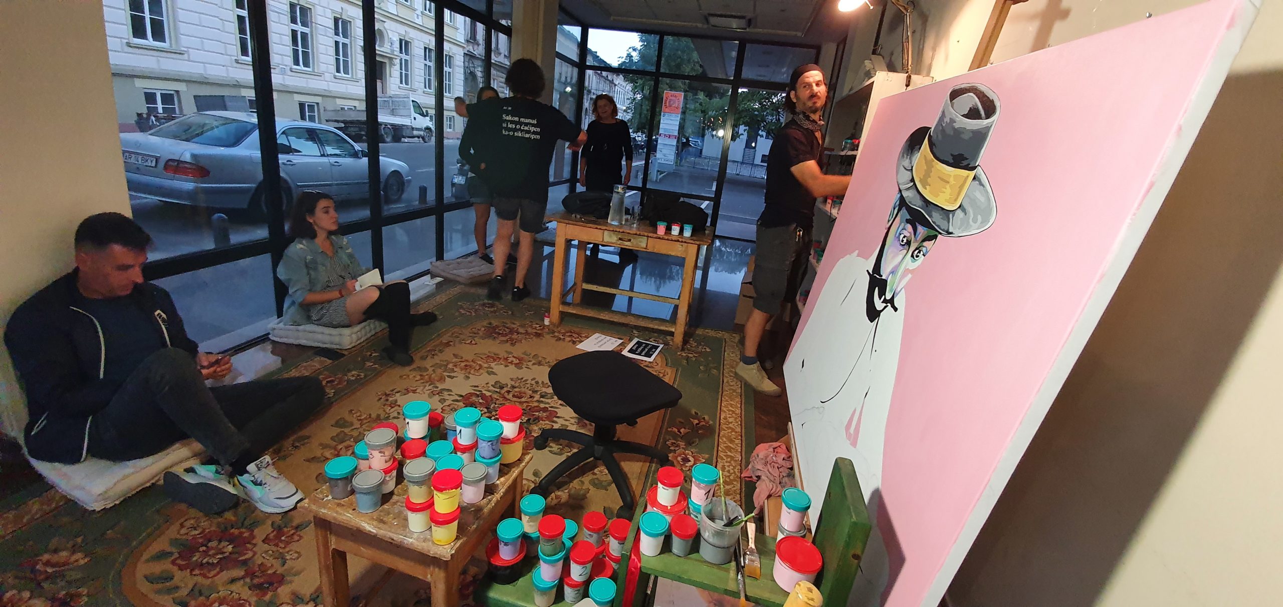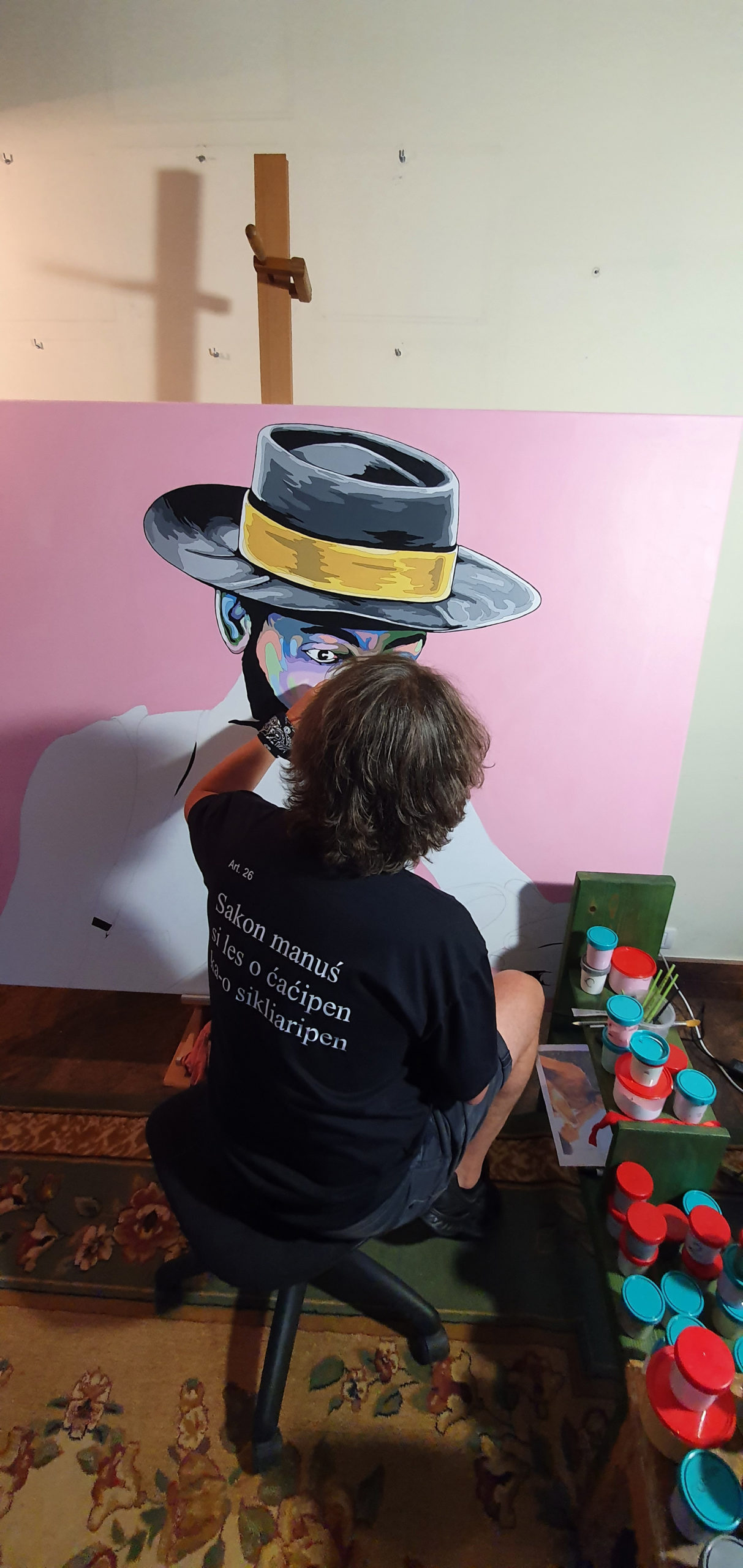 Dacă aici mai sunt aranjate ca la carte mănuși, joben, un taburet elegant, o veioză vintage, în încăperea alăturată, unde pictorul își petrece serile, vezi borcane cu culoare, pensule, o hărmălaie creativă, cu tineri întinși pe jos, stând pe câte o pernă, sau direct pe covorul de spectacol al artistului. Două coli A4 te îndeamnă să le citești: „Art. 23. Orice persoană are dreptul la muncă”. Tricoul pictorului te cheamă și el la lectură: același articol 23, de data aceasta în țigănește:”Sakon manus si les o cacipen ka-i buti”. Știi că va urma o expoziție în care lucrările supradimensionate desprinse din filmul lui Kusturica vor fi însoțite de proiecții, de texte citite în țigănește, de muzică, într-un spațiu inedit, desigur. Dar nu-l întrebi despre expoziția care sigur va avea loc, cândva, îți lași subiectul pentru altă dată. Îl întrebi ce l-ar întreba probabil oricine care trece pe acolo: „De ce te expuiîn vitrină, de ce duci actul creației în public și nu doar creația finală?”.