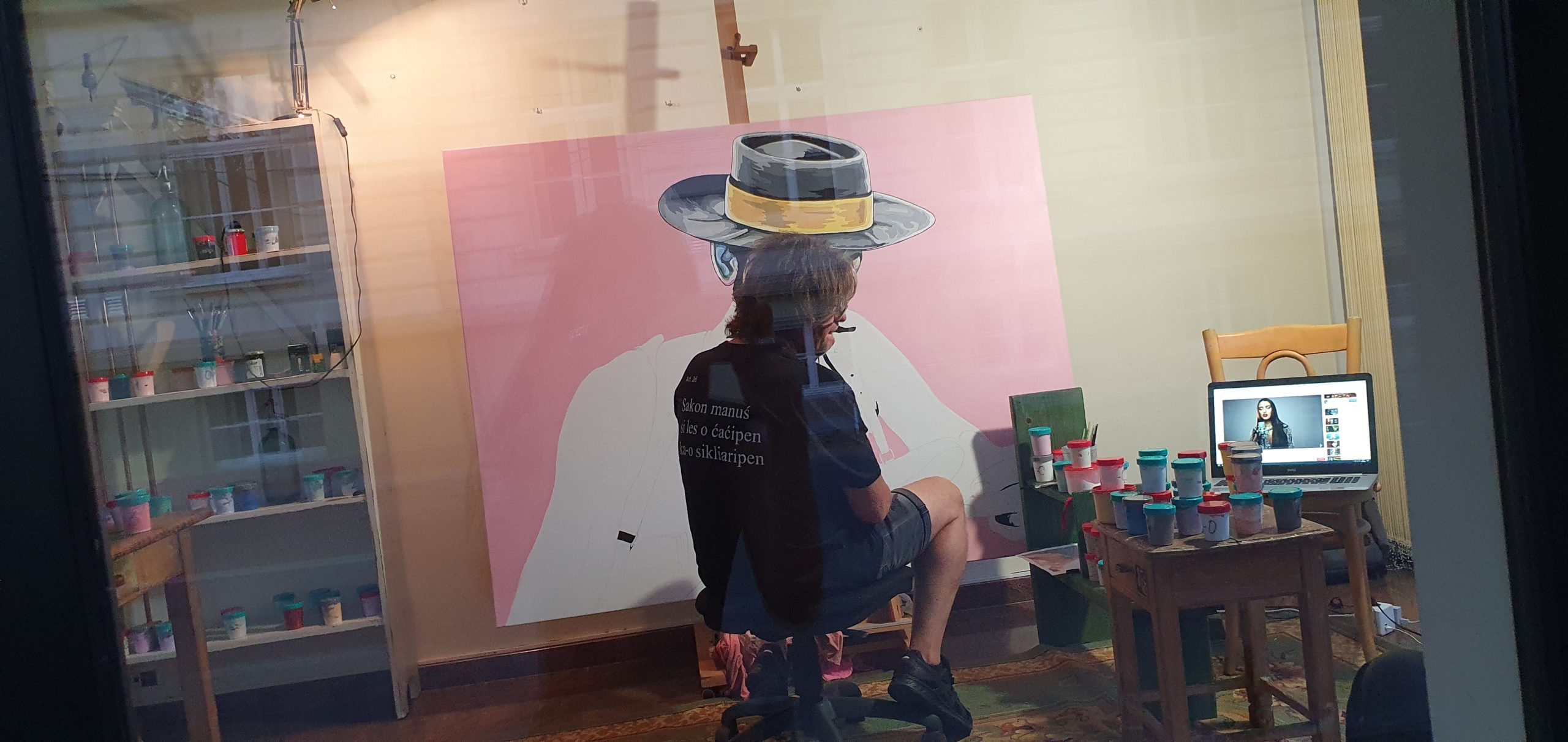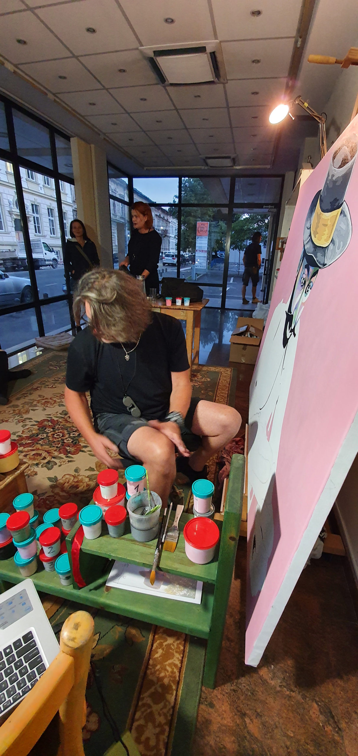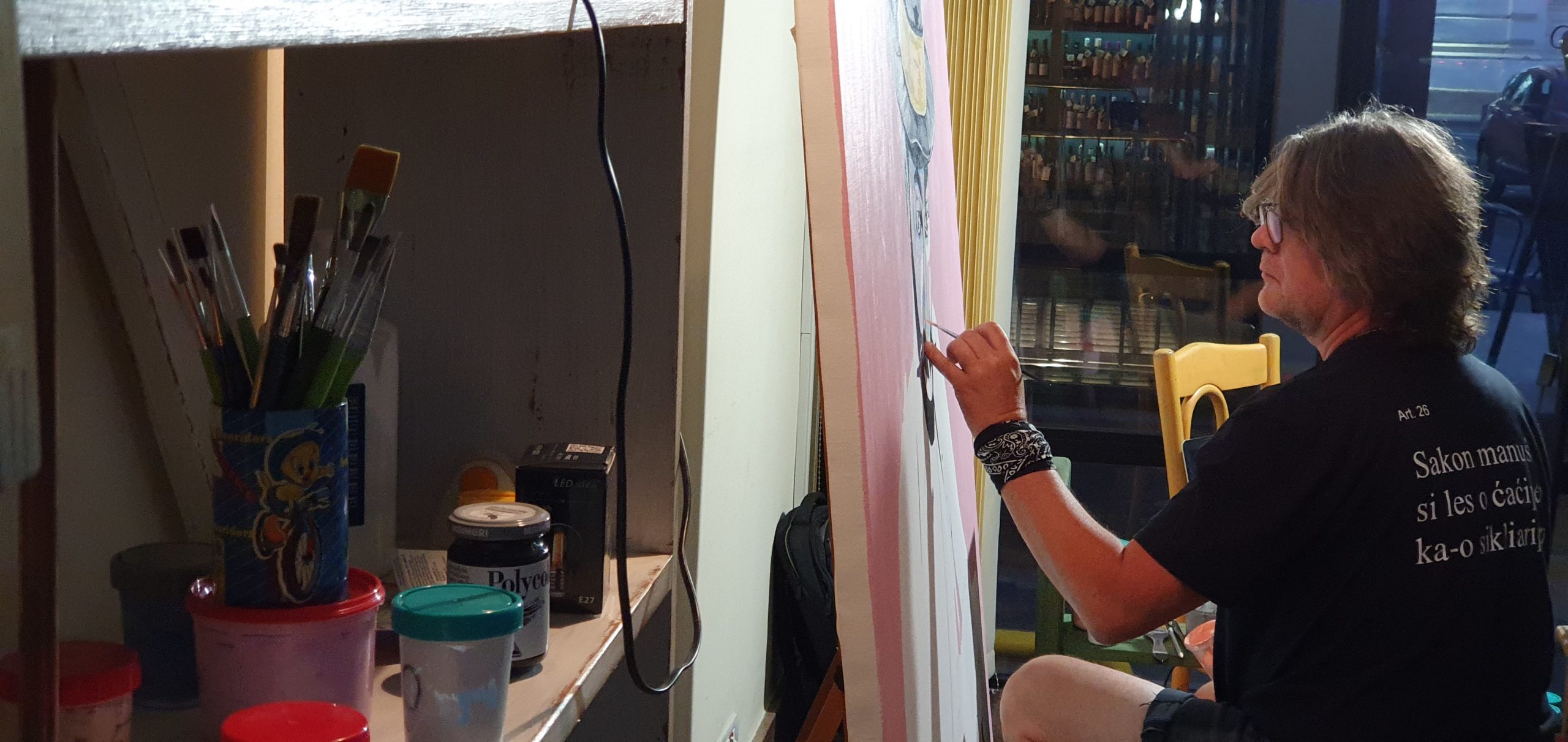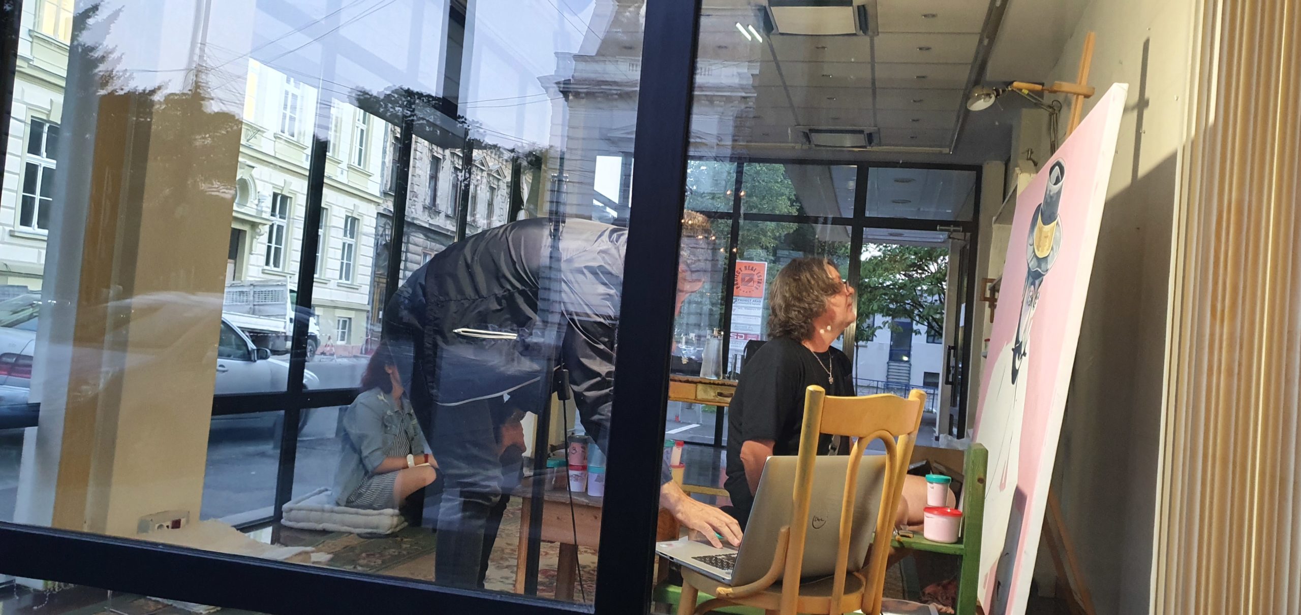 Dacă aici mai sunt aranjate ca la carte mănuși, joben, un taburet elegant, o veioză vintage, în încăperea alăturată, unde pictorul își petrece serile, vezi borcane cu culoare, pensule, o hărmălaie creativă, cu tineri întinși pe jos, stând pe câte o pernă, sau direct pe covorul de spectacol al artistului. Două coli A4 te îndeamnă să le citești: „Art. 23. Orice persoană are dreptul la muncă”. Tricoul pictorului te cheamă și el la lectură: același articol 23, de data aceasta în țigănește:”Sakon manus si les o cacipen ka-i buti”. Știi că va urma o expoziție în care lucrările supradimensionate desprinse din filmul lui Kusturica vor fi însoțite de proiecții, de texte citite în țigănește, de muzică, într-un spațiu inedit, desigur. Dar nu-l întrebi despre expoziția care sigur va avea loc, cândva, îți lași subiectul pentru altă dată. Îl întrebi ce l-ar întreba probabil oricine care trece pe acolo: „De ce te expuiîn vitrină, de ce duci actul creației în public și nu doar creația finală?”.