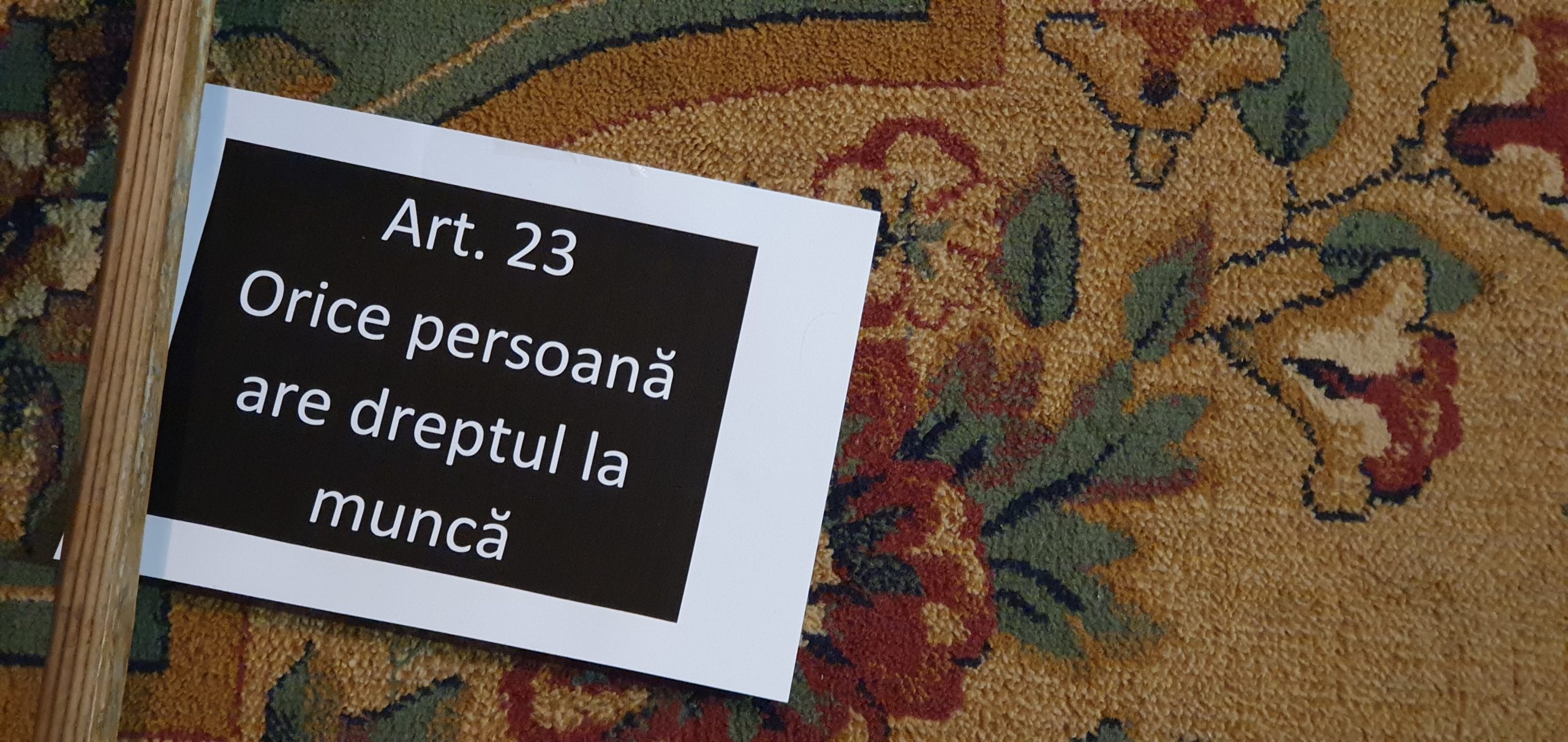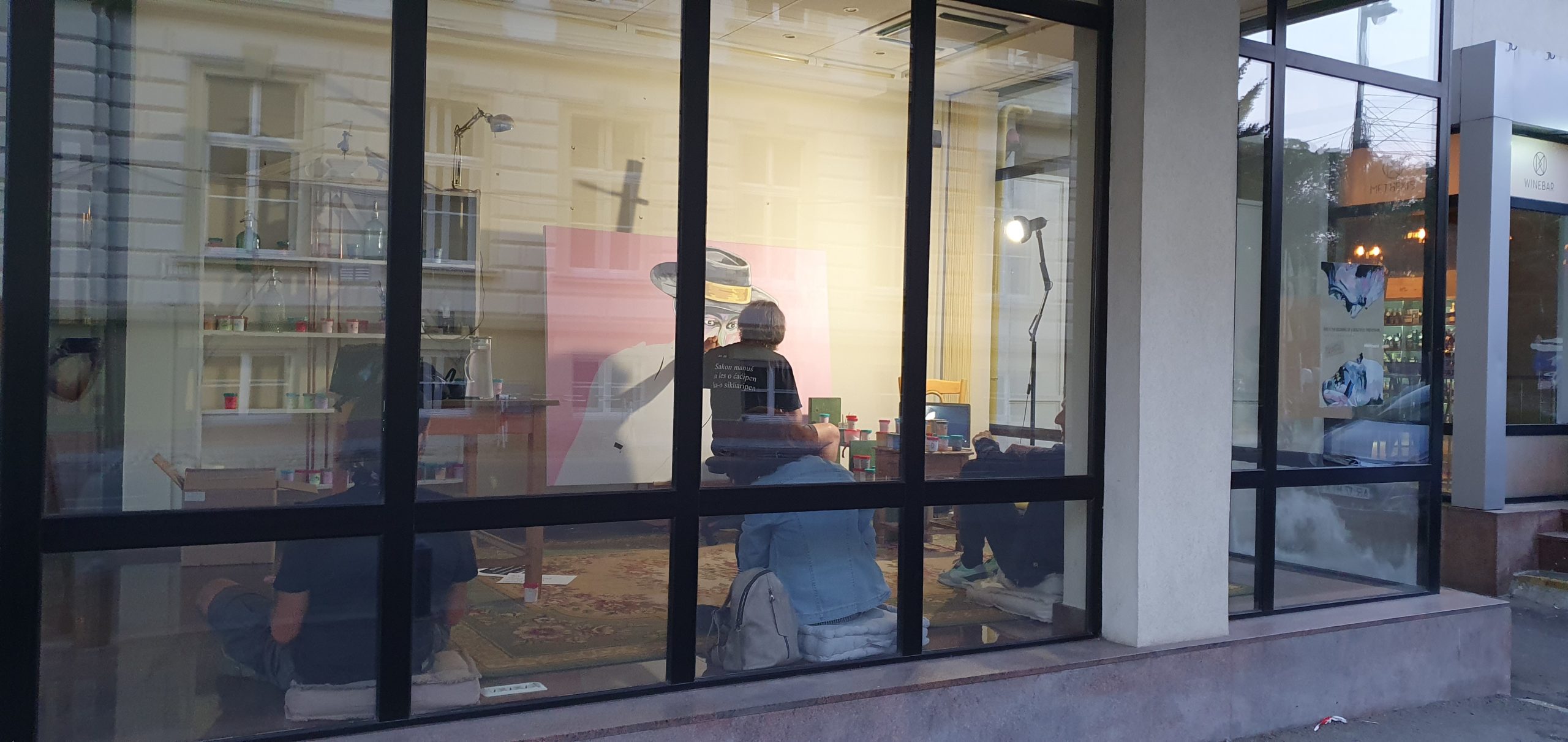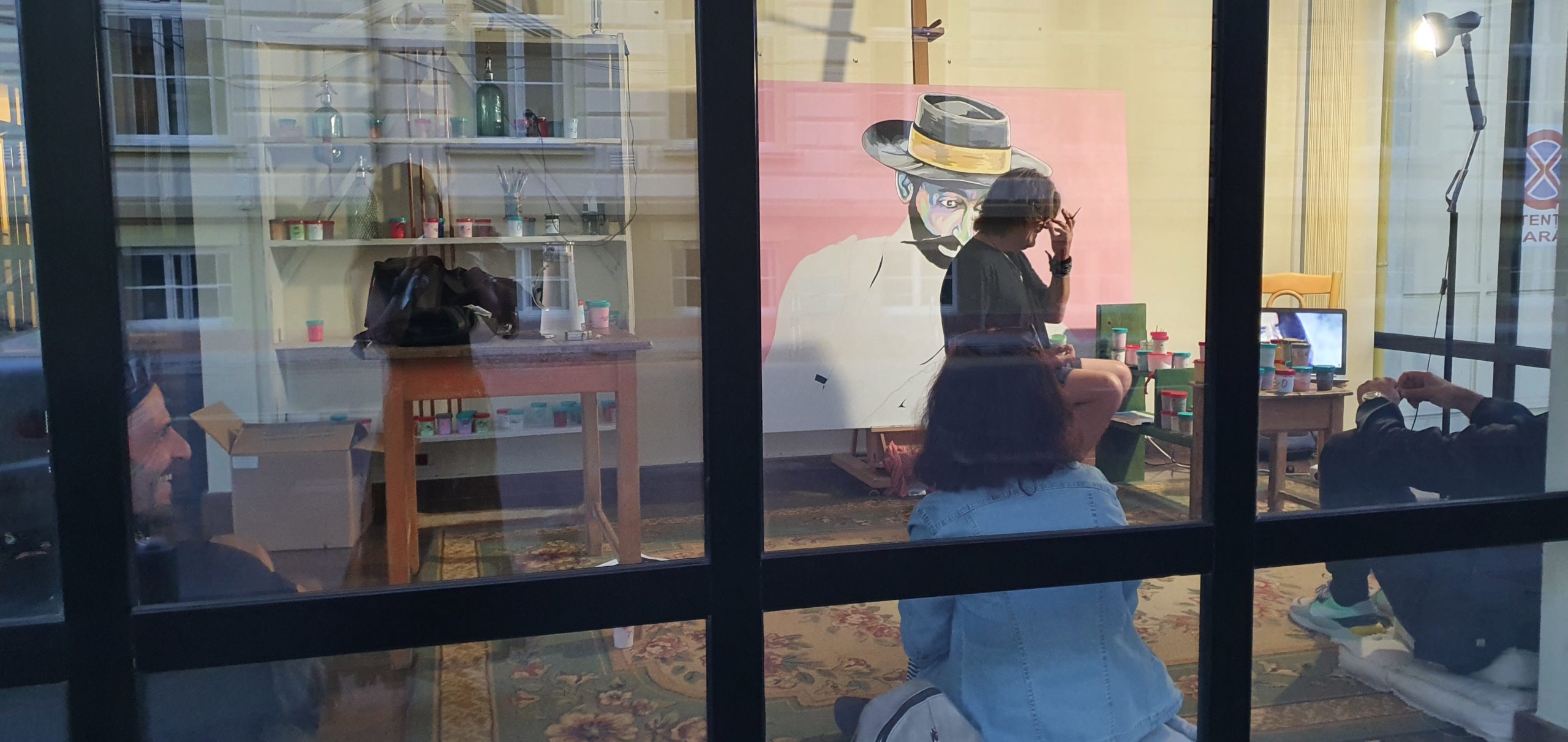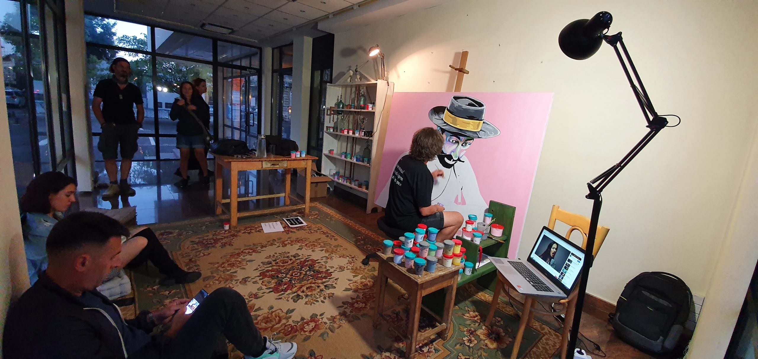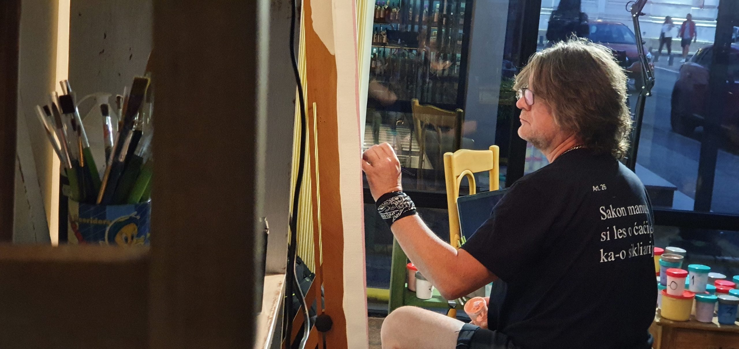 Dacă aici mai sunt aranjate ca la carte mănuși, joben, un taburet elegant, o veioză vintage, în încăperea alăturată, unde pictorul își petrece serile, vezi borcane cu culoare, pensule, o hărmălaie creativă, cu tineri întinși pe jos, stând pe câte o pernă, sau direct pe covorul de spectacol al artistului. Două coli A4 te îndeamnă să le citești: „Art. 23. Orice persoană are dreptul la muncă”. Tricoul pictorului te cheamă și el la lectură: același articol 23, de data aceasta în țigănește:”Sakon manus si les o cacipen ka-i buti”. Știi că va urma o expoziție în care lucrările supradimensionate desprinse din filmul lui Kusturica vor fi însoțite de proiecții, de texte citite în țigănește, de muzică, într-un spațiu inedit, desigur. Dar nu-l întrebi despre expoziția care sigur va avea loc, cândva, îți lași subiectul pentru altă dată. Îl întrebi ce l-ar întreba probabil oricine care trece pe acolo: „De ce te expuiîn vitrină, de ce duci actul creației în public și nu doar creația finală?”.