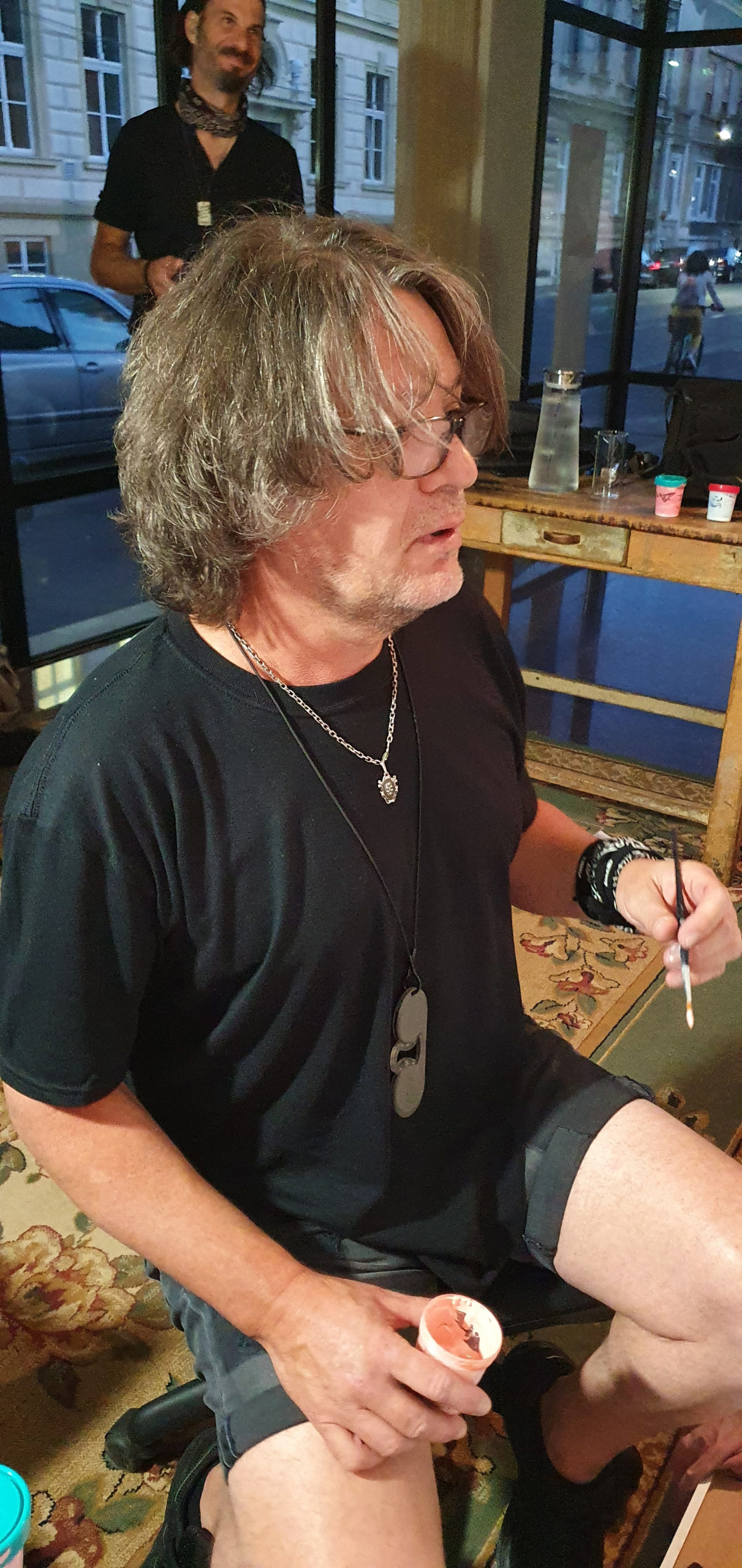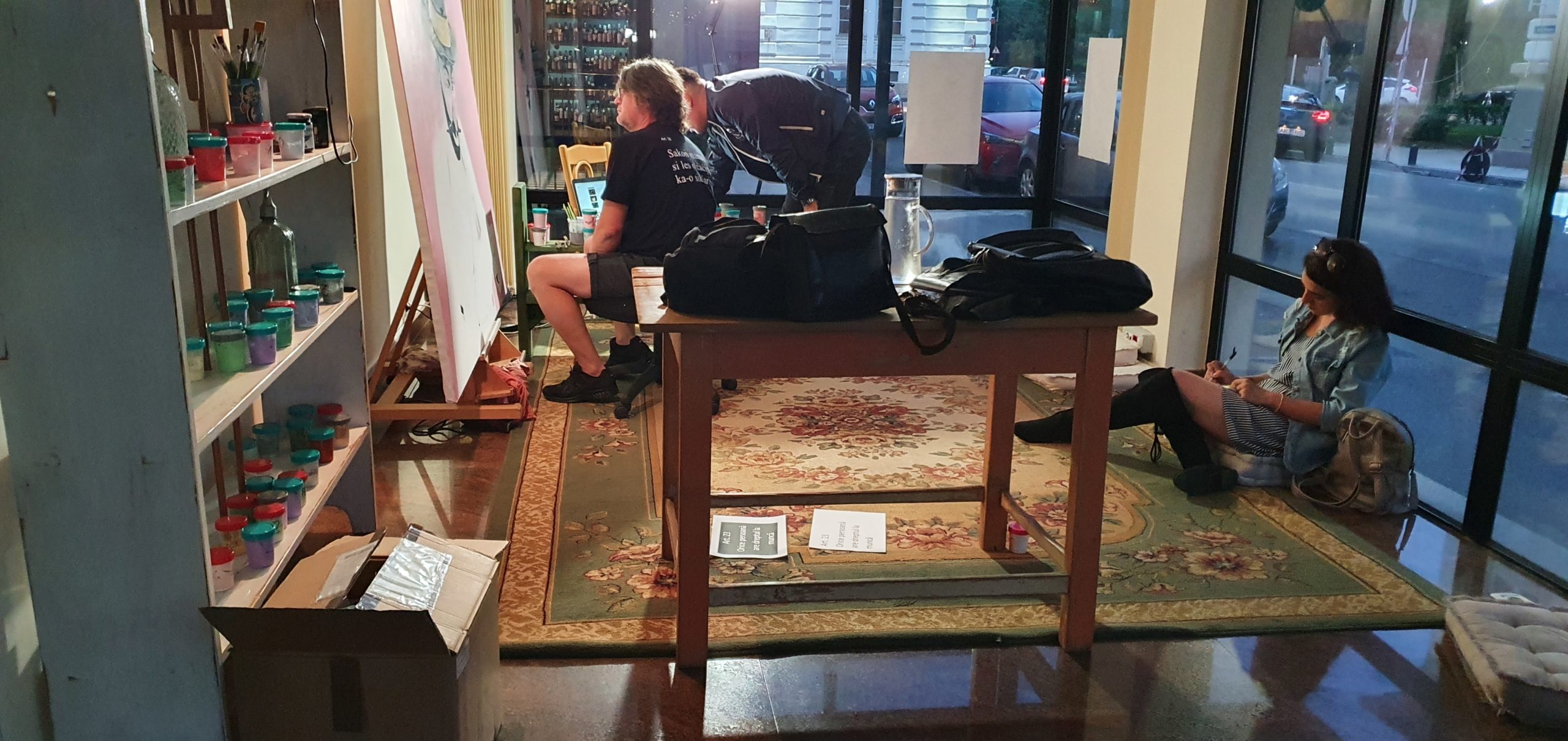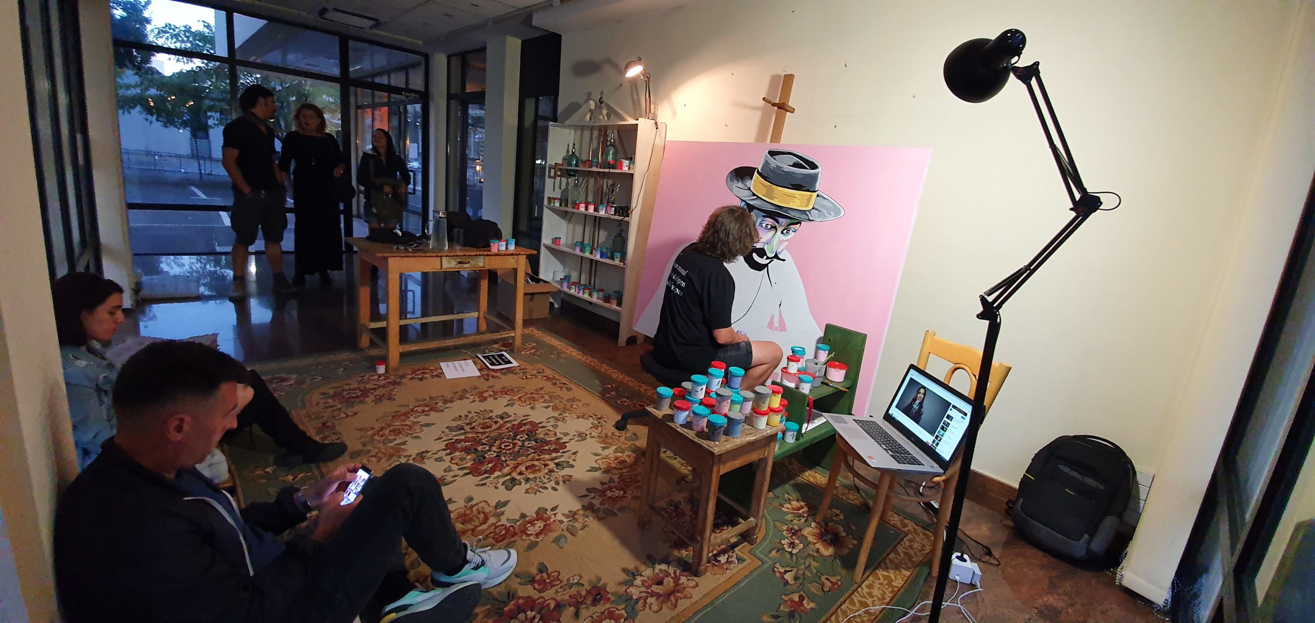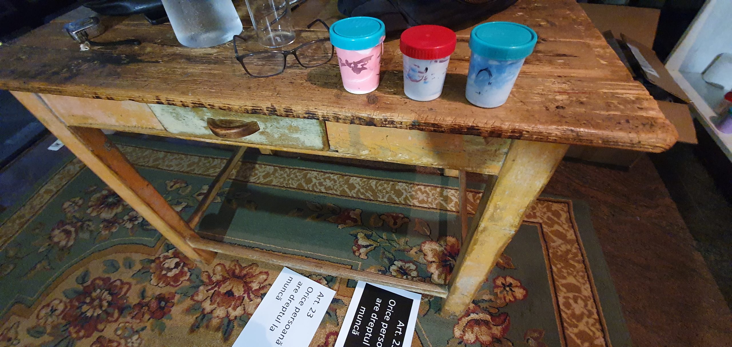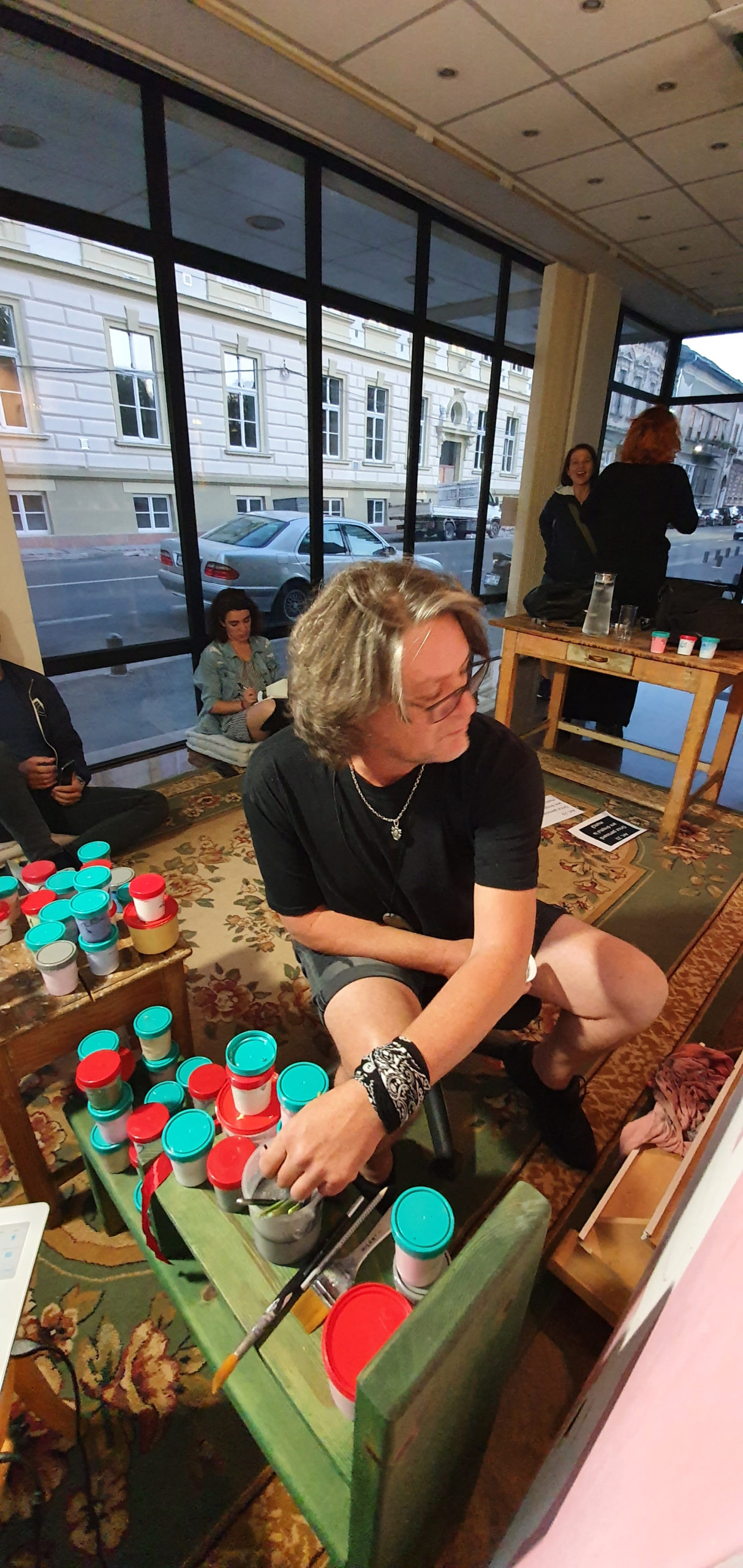Dacă aici mai sunt aranjate ca la carte mănuși, joben, un taburet elegant, o veioză vintage, în încăperea alăturată, unde pictorul își petrece serile, vezi borcane cu culoare, pensule, o hărmălaie creativă, cu tineri întinși pe jos, stând pe câte o pernă, sau direct pe covorul de spectacol al artistului. Două coli A4 te îndeamnă să le citești: „Art. 23. Orice persoană are dreptul la muncă”. Tricoul pictorului te cheamă și el la lectură: același articol 23, de data aceasta în țigănește:”Sakon manus si les o cacipen ka-i buti”. Știi că va urma o expoziție în care lucrările supradimensionate desprinse din filmul lui Kusturica vor fi însoțite de proiecții, de texte citite în țigănește, de muzică, într-un spațiu inedit, desigur. Dar nu-l întrebi despre expoziția care sigur va avea loc, cândva, îți lași subiectul pentru altă dată. Îl întrebi ce l-ar întreba probabil oricine care trece pe acolo: „De ce te expuiîn vitrină, de ce duci actul creației în public și nu doar creația finală?”.