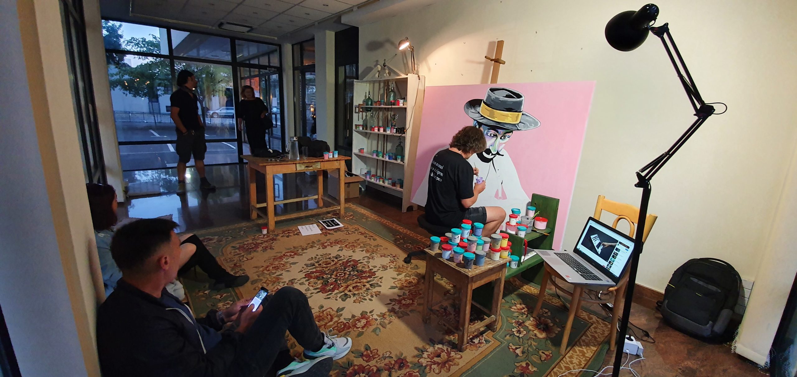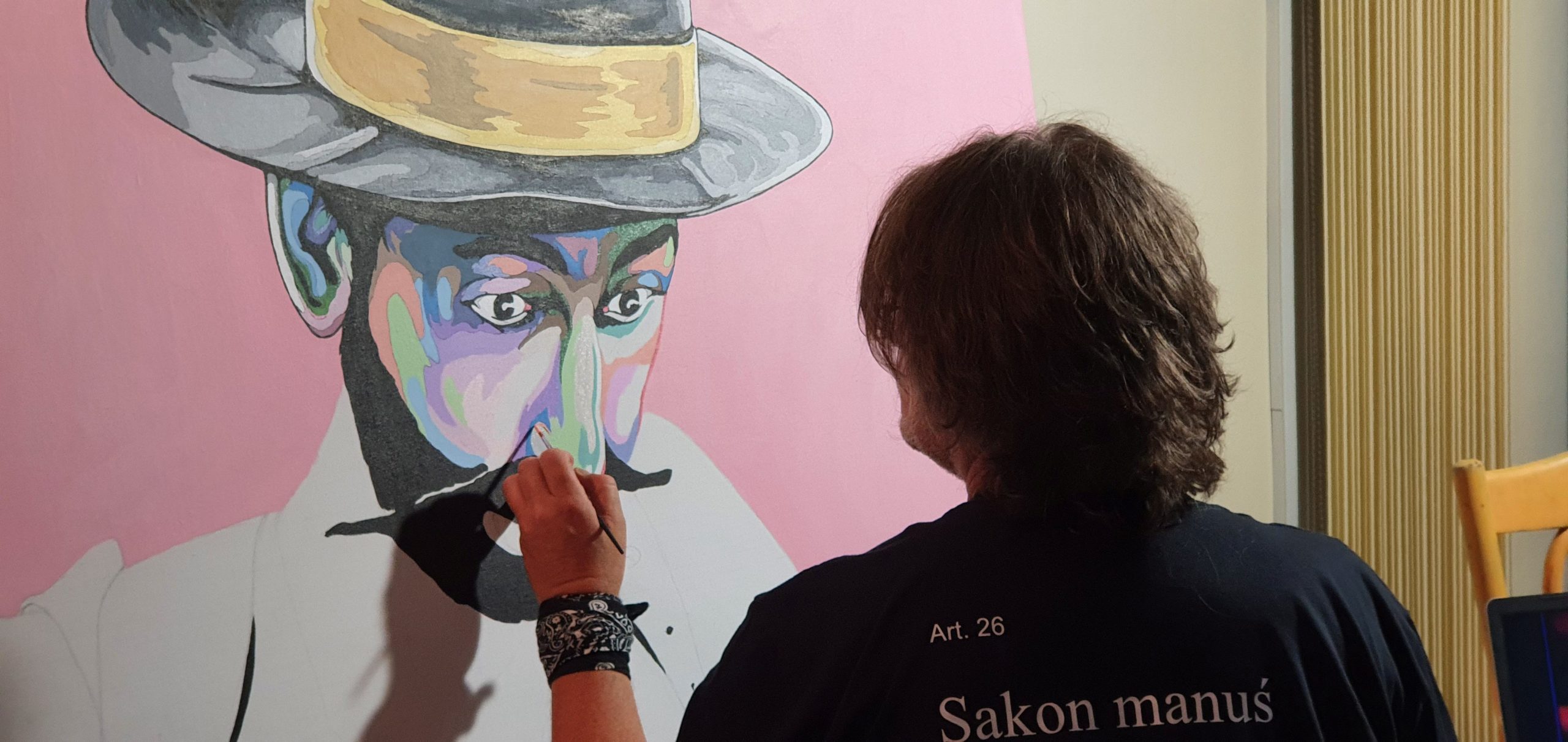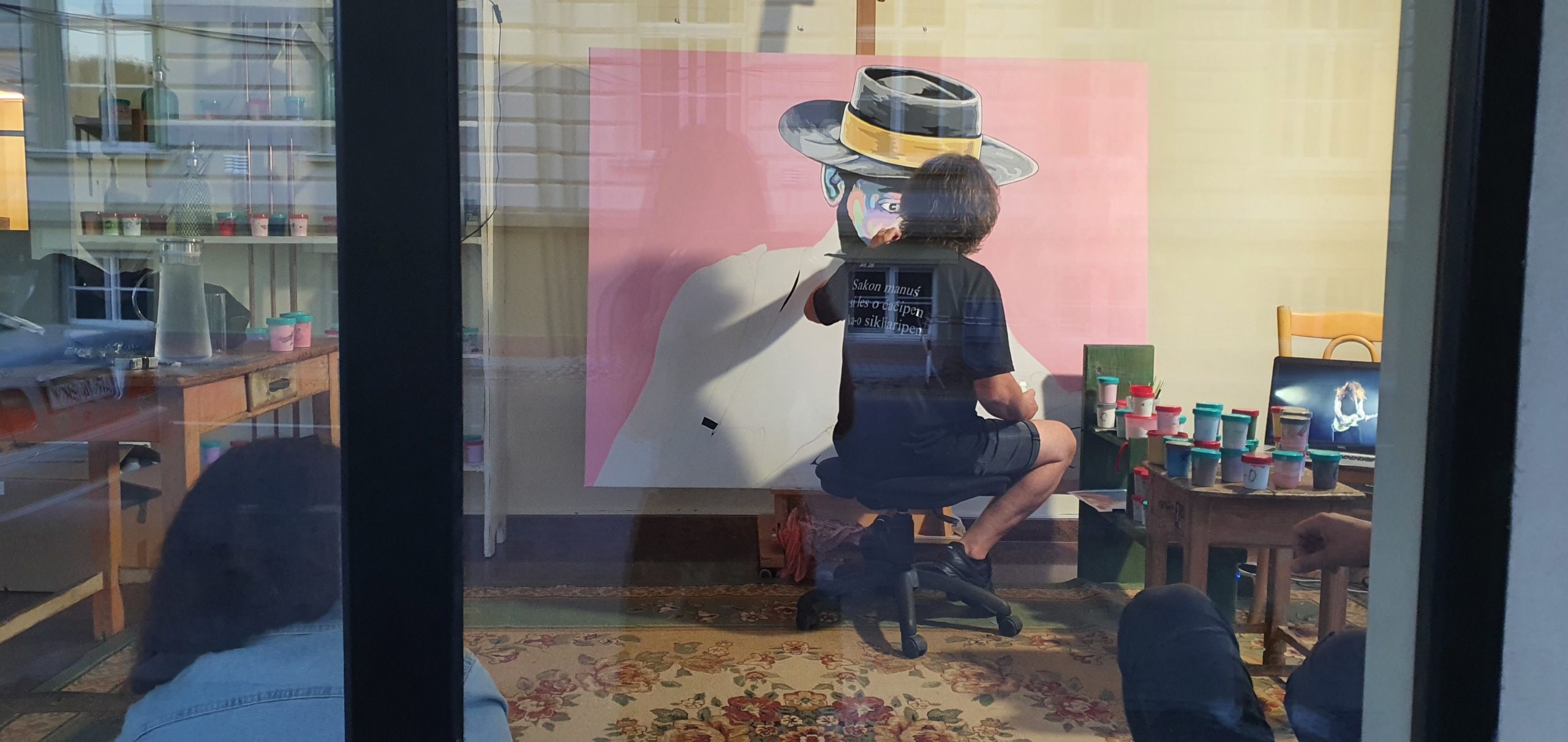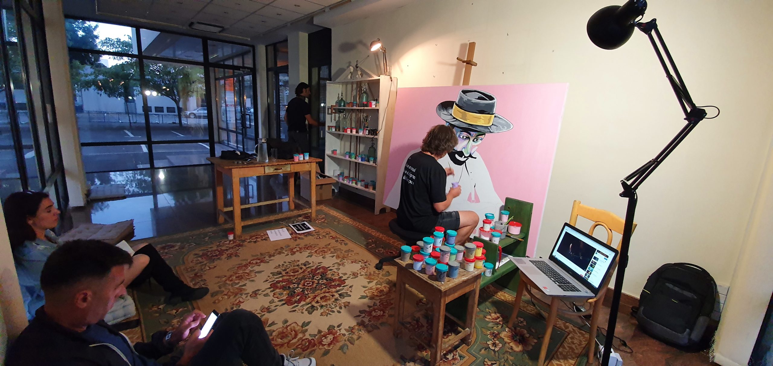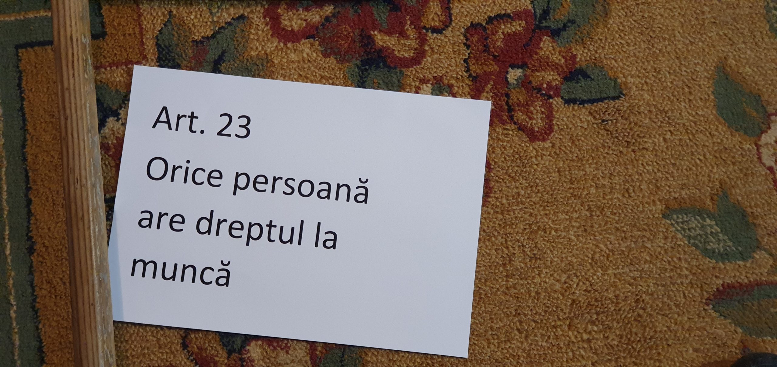 Dacă aici mai sunt aranjate ca la carte mănuși, joben, un taburet elegant, o veioză vintage, în încăperea alăturată, unde pictorul își petrece serile, vezi borcane cu culoare, pensule, o hărmălaie creativă, cu tineri întinși pe jos, stând pe câte o pernă, sau direct pe covorul de spectacol al artistului. Două coli A4 te îndeamnă să le citești: „Art. 23. Orice persoană are dreptul la muncă”. Tricoul pictorului te cheamă și el la lectură: același articol 23, de data aceasta în țigănește:”Sakon manus si les o cacipen ka-i buti”. Știi că va urma o expoziție în care lucrările supradimensionate desprinse din filmul lui Kusturica vor fi însoțite de proiecții, de texte citite în țigănește, de muzică, într-un spațiu inedit, desigur. Dar nu-l întrebi despre expoziția care sigur va avea loc, cândva, îți lași subiectul pentru altă dată. Îl întrebi ce l-ar întreba probabil oricine care trece pe acolo: „De ce te expuiîn vitrină, de ce duci actul creației în public și nu doar creația finală?”.