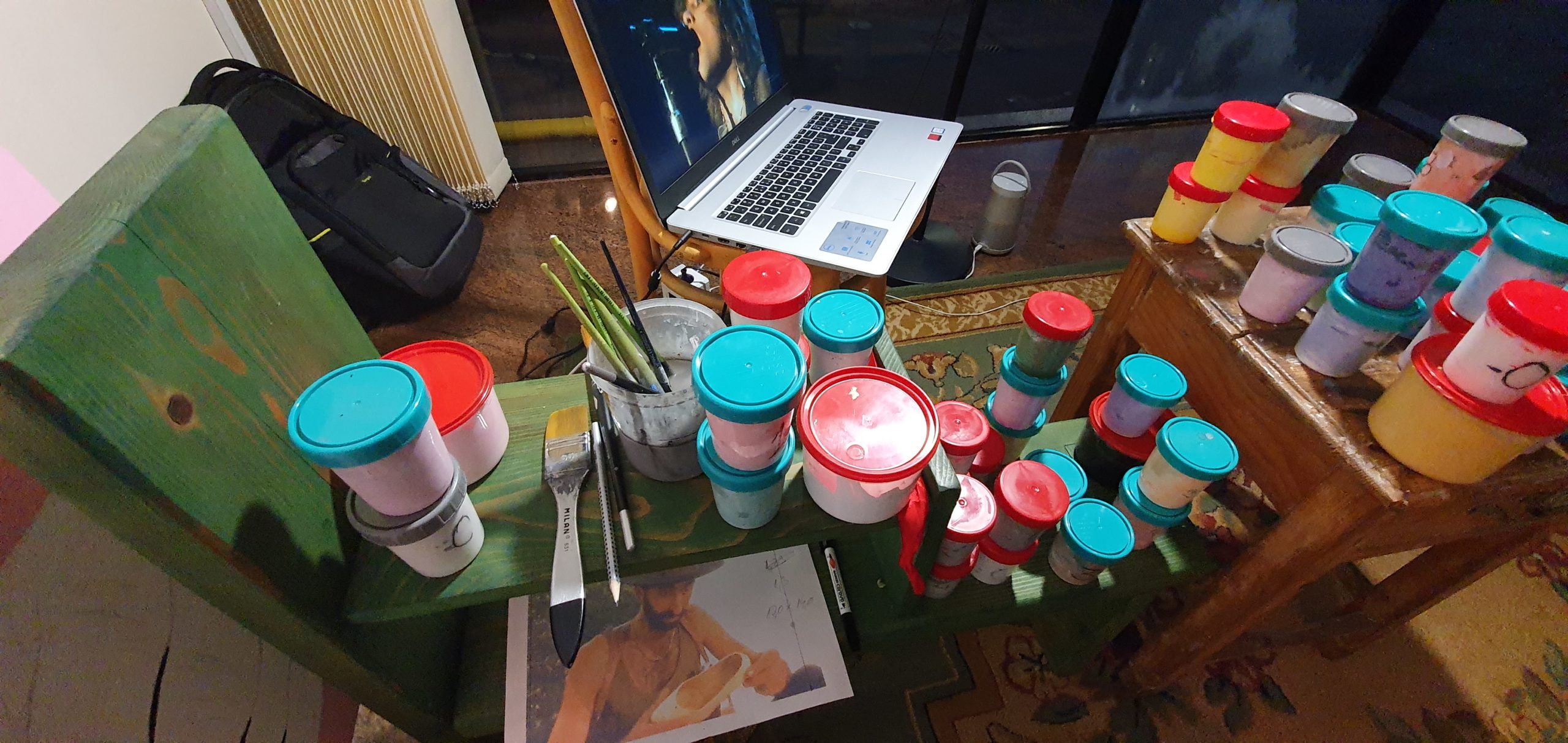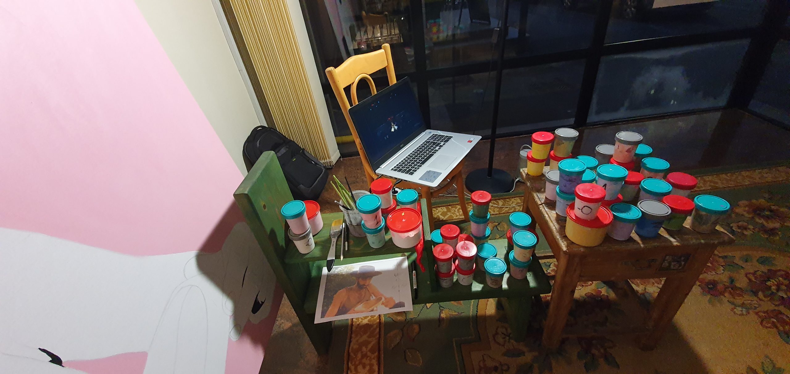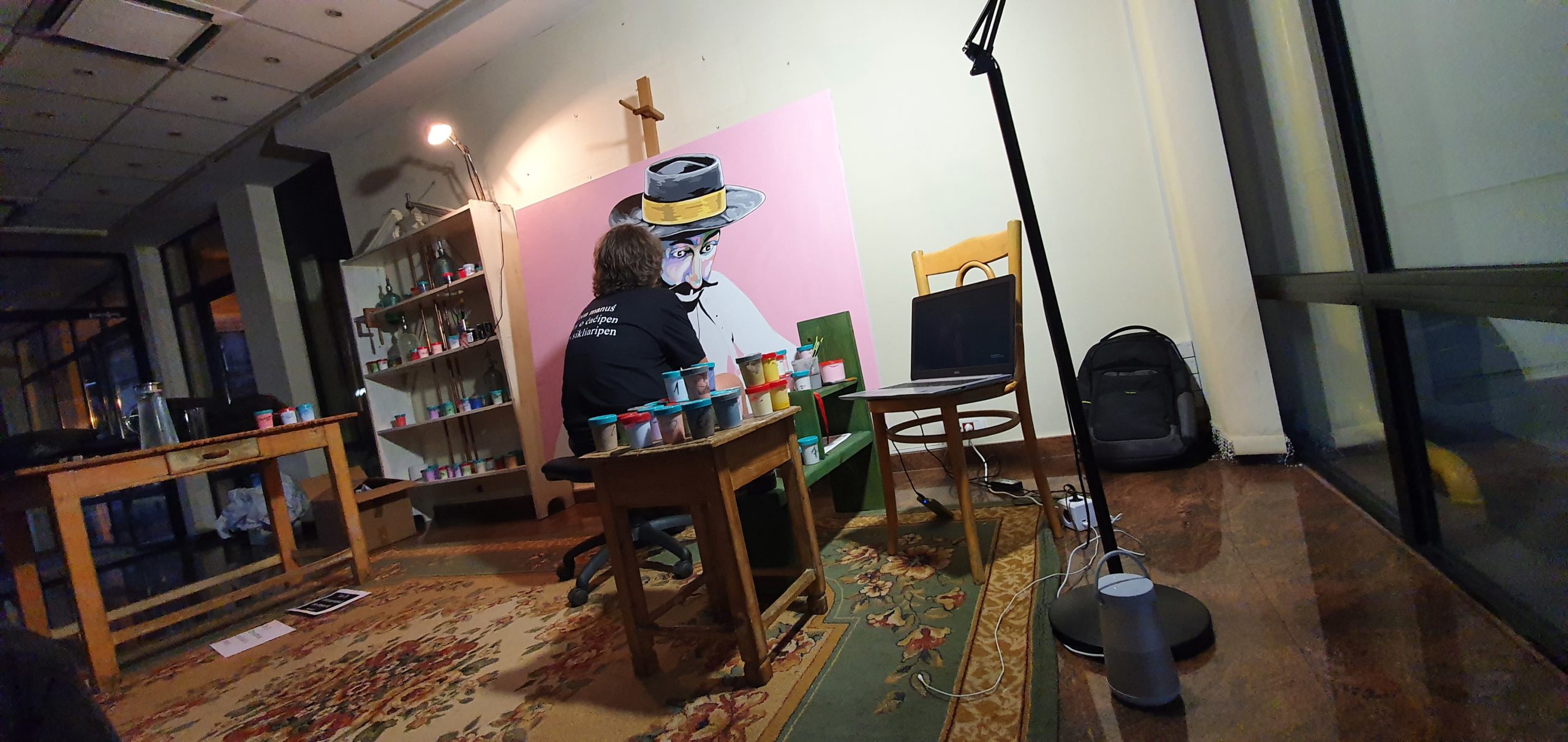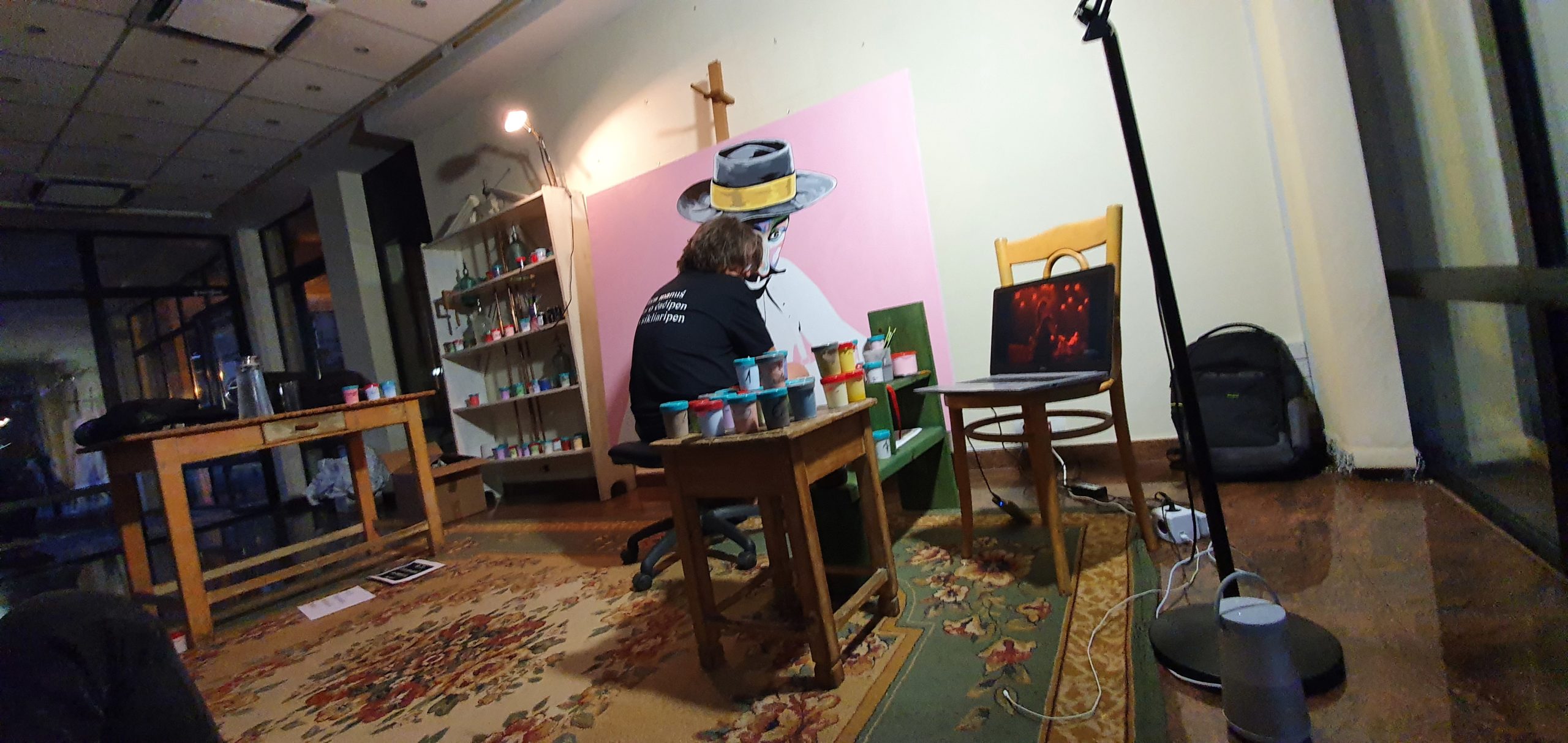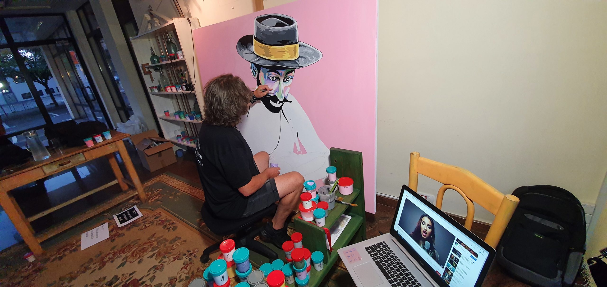 Dacă aici mai sunt aranjate ca la carte mănuși, joben, un taburet elegant, o veioză vintage, în încăperea alăturată, unde pictorul își petrece serile, vezi borcane cu culoare, pensule, o hărmălaie creativă, cu tineri întinși pe jos, stând pe câte o pernă, sau direct pe covorul de spectacol al artistului. Două coli A4 te îndeamnă să le citești: „Art. 23. Orice persoană are dreptul la muncă”. Tricoul pictorului te cheamă și el la lectură: același articol 23, de data aceasta în țigănește:”Sakon manus si les o cacipen ka-i buti”. Știi că va urma o expoziție în care lucrările supradimensionate desprinse din filmul lui Kusturica vor fi însoțite de proiecții, de texte citite în țigănește, de muzică, într-un spațiu inedit, desigur. Dar nu-l întrebi despre expoziția care sigur va avea loc, cândva, îți lași subiectul pentru altă dată. Îl întrebi ce l-ar întreba probabil oricine care trece pe acolo: „De ce te expuiîn vitrină, de ce duci actul creației în public și nu doar creația finală?”.