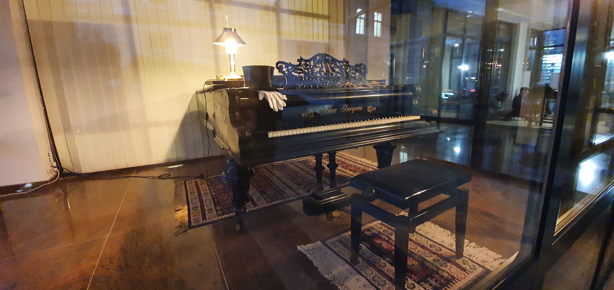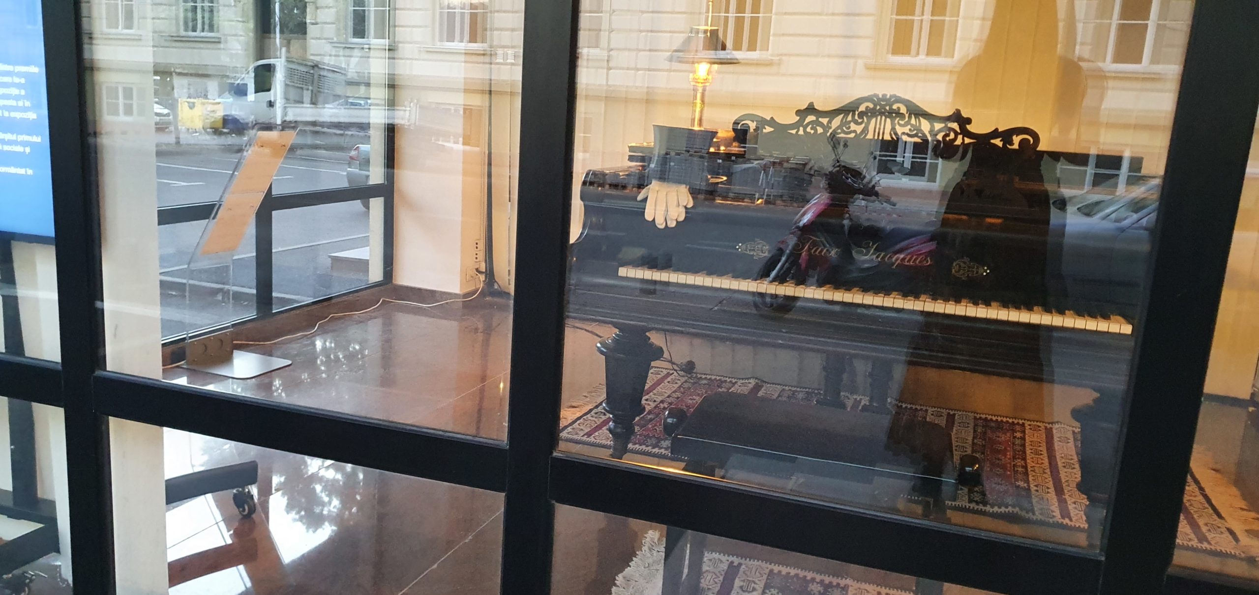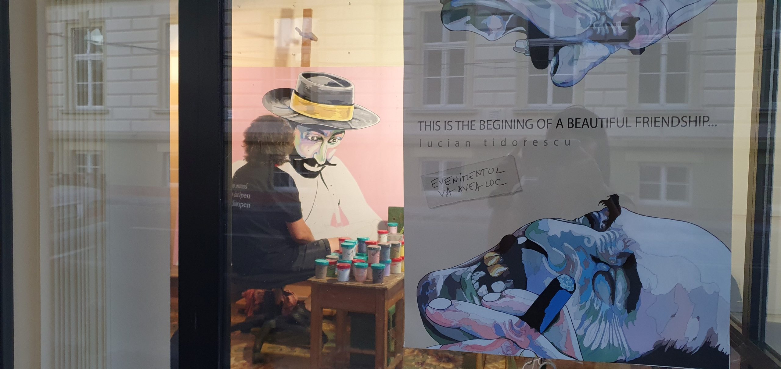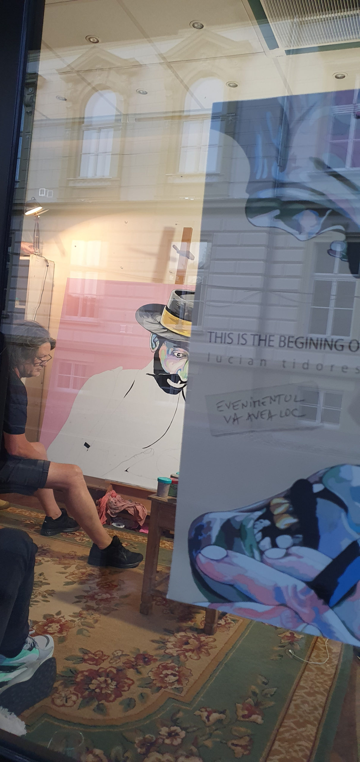 Stă în fața unui portret supradimensionat, care parcă se chinuie să iasă tocmai atunci din lungmetrajul cu țigani al regizorului sârb. Porcul a mâncat deja trabantul, dacă sunteți curioși, așa că această scenă nu-și va spune povestea în vitrină. Dar mai sunt câteva instantanee pe care pictorul Lucian Țidorescu le va picta acolo, pe Decebal nr. 2, sub ochii celor care vor vrea să-l urmărească. Artistul va socializa cu cei prezenți când îi va veni, va pune muzică, doar muzică bună, și te va scoate la o țigară ca să-ți arate că nu doar el stă în vitrină, ci și pianul restaurat de Asociația Concordia și adus în vitrină de același Lucian Țiodrescu, pianul creat de Faix Jacques. Creație din Arad, superbul pian de concerte își spune povestea pentru toți cei care nu o știu, adică marea noastră majoritate, pe un ecran amplasat în aceeași încăpere.