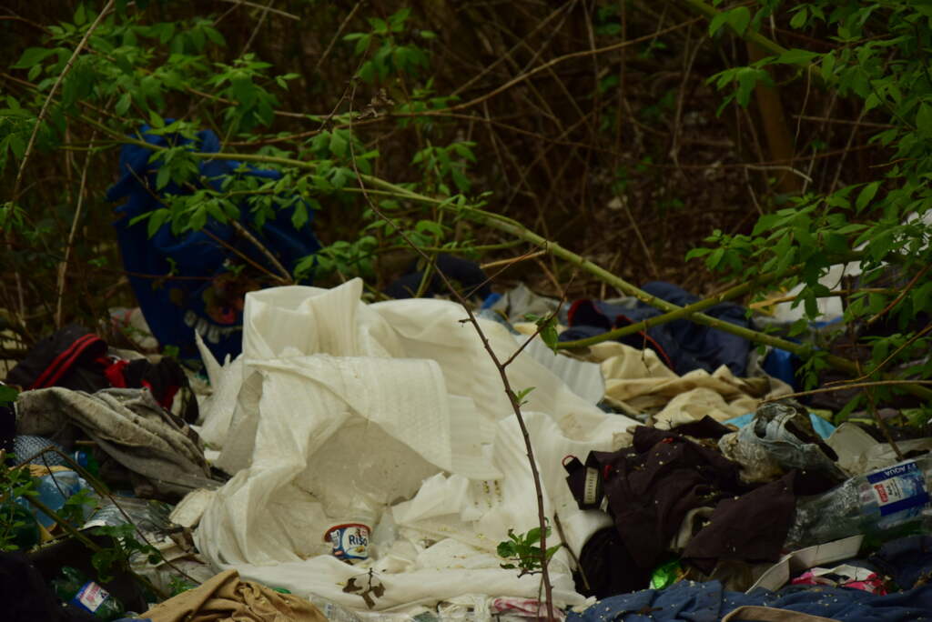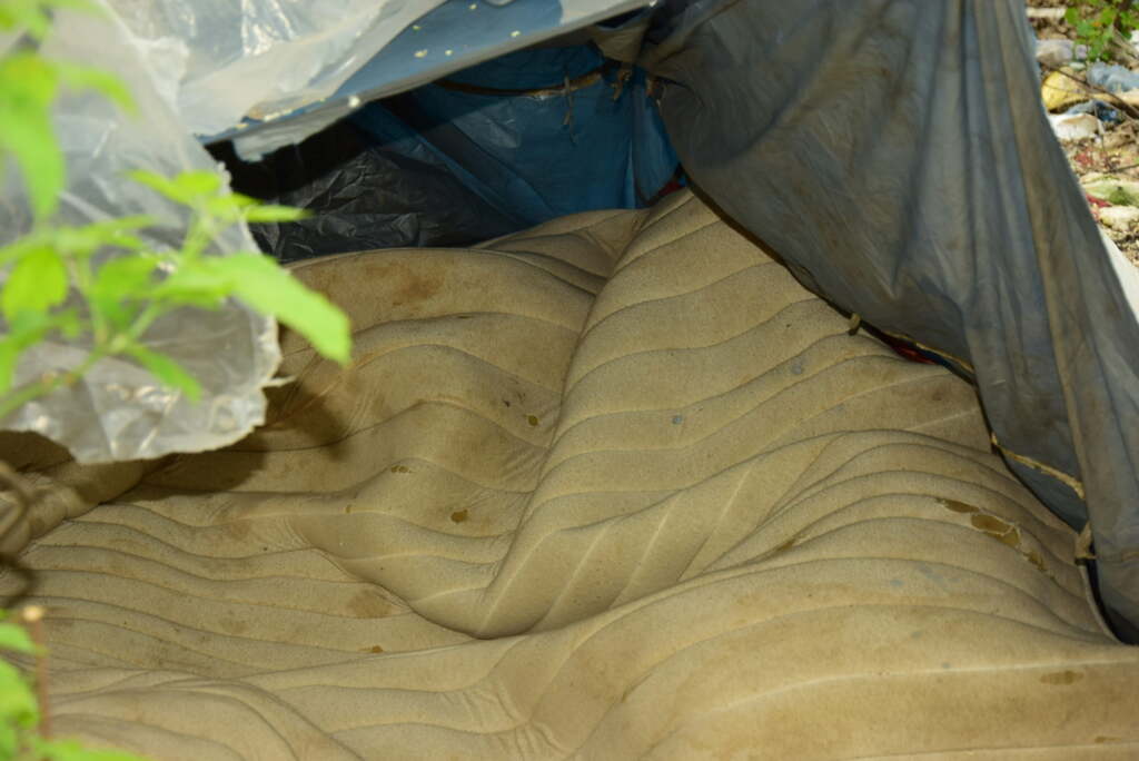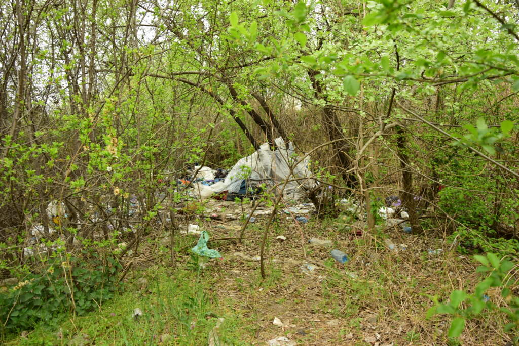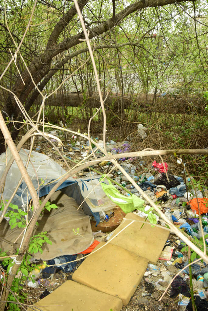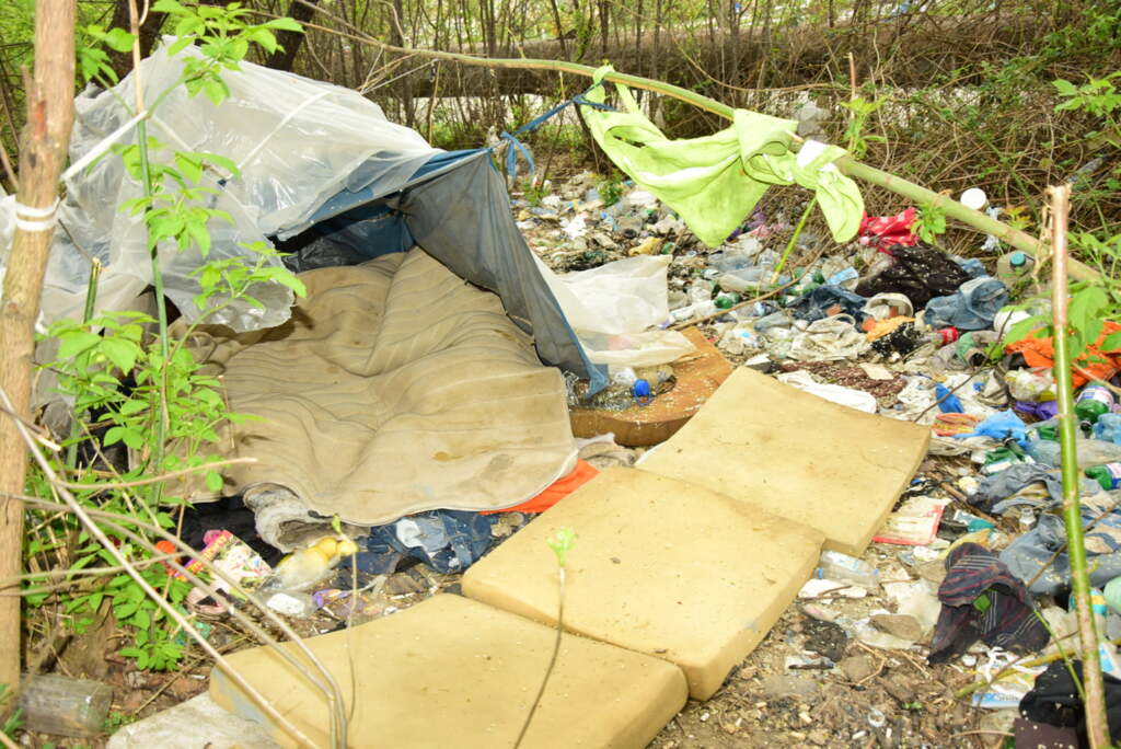 Pe cei care locuiesc acum aici nu i-am găsit la „domiciliu”. Am găsit însă o mizerie de nedescris. Un focar de infecție, zeci de gunoaie. Un cort improvizat în mijlocul pet-urilor, hainelor, sticlelor și gunoaielor de tot felul, un miros insuportabil. Totul se întâmplă lângă Bulevardul Nicolae Titulescu, lângă zecile de blocuri din Micălaca 300