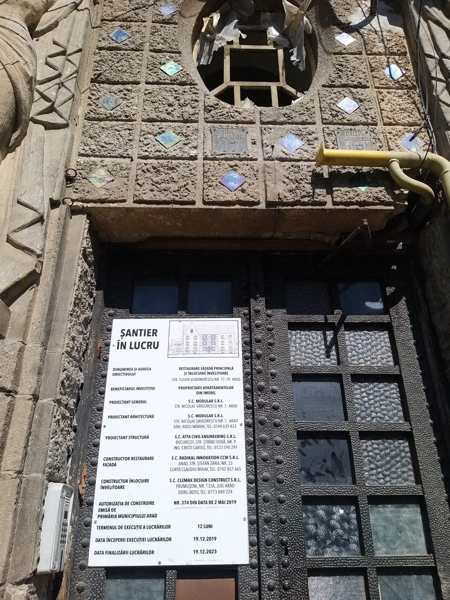 Mai precizăm că clădirea de pe strada Tudor Vladimirescu nr.17-19 se află în plin proces de renovare. Potrivit afişajului de la uşa de intrare, faţada principală a imobilului va fi restaurată iar învelitoarea va fi înlocuită. Practic, aceste lucrări ar fi trebuit să fie deja executate, după cum rezultă de pe acelaşi panou, unde scrie negru pe alb că data de începere a lucrărilor e 19 decembrie 2019, iar termenul de execuţie este de 12 luni…