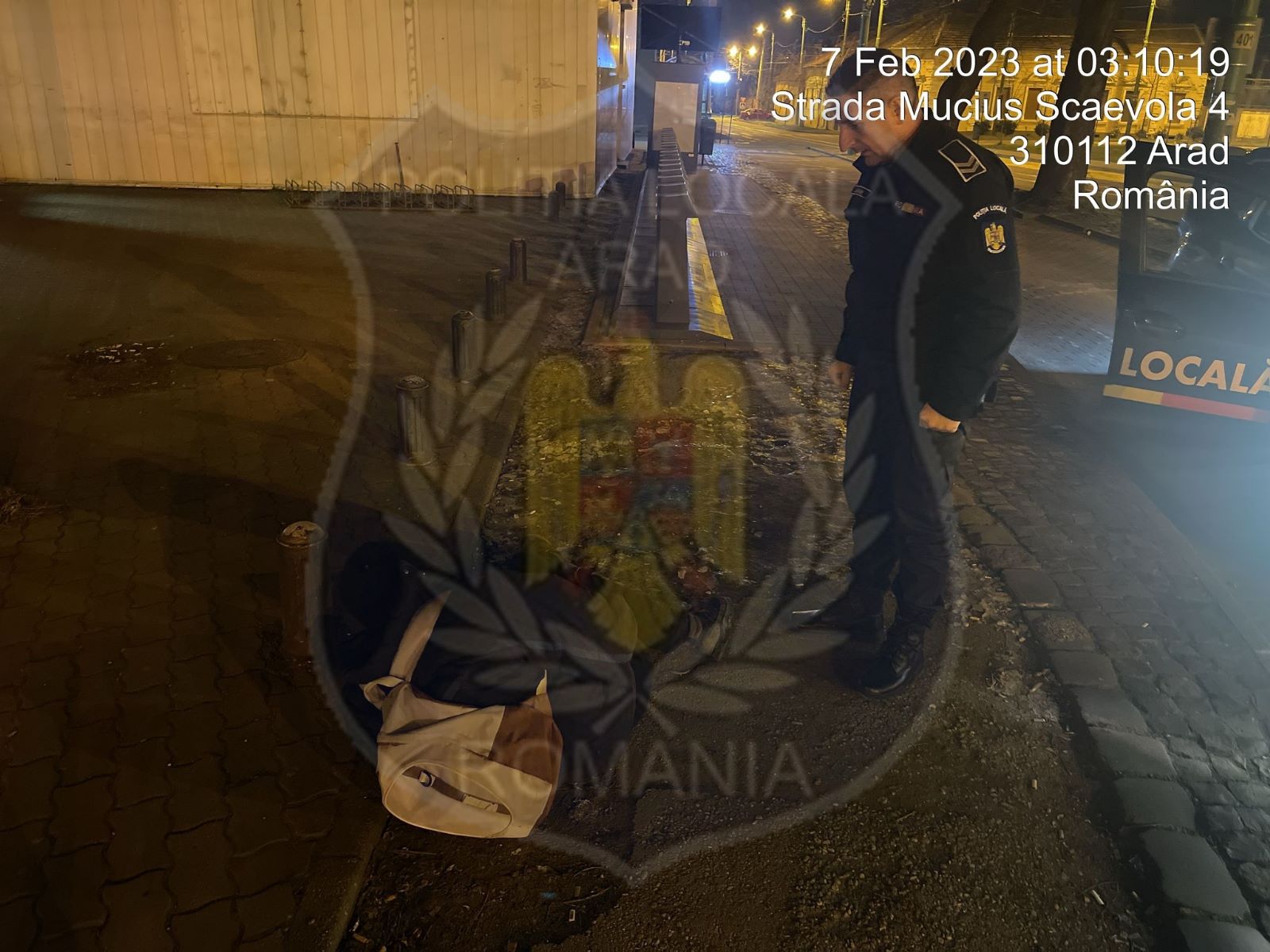 Totodată, alte două persoane care riscau să înghețe pe străzi, au fost descoperite de către polițiștii locali de ordine publică. Astfel, în jurul orei 23:15, a fost solicitată intervenția unui echipaj pe strada Voinicilor, lângă platforma de gunoi, în urma unei sesizări transmise Dispeceratului Poliției Locale de către un cetățean, care semnala existența unei persoane de sex feminin căzută pe stradă. Ajunși la fața locului, polițiștii locali au constatat că persoana, în jurul vârstei de 50 de ani, căreia nu i s-a putut stabili identitatea deoarece nu era coerentă, aflată sub influența băuturilor alcoolice, era de vreo 2 ore în acel loc, acuzând faptul că nu-și poate mișca extremitățile. A fost solicitată o ambulanță, care a transportat femeia la Spitalul Clinic Județean de Urgență Arad, în vederea acordării măsurilor de prim ajutor.