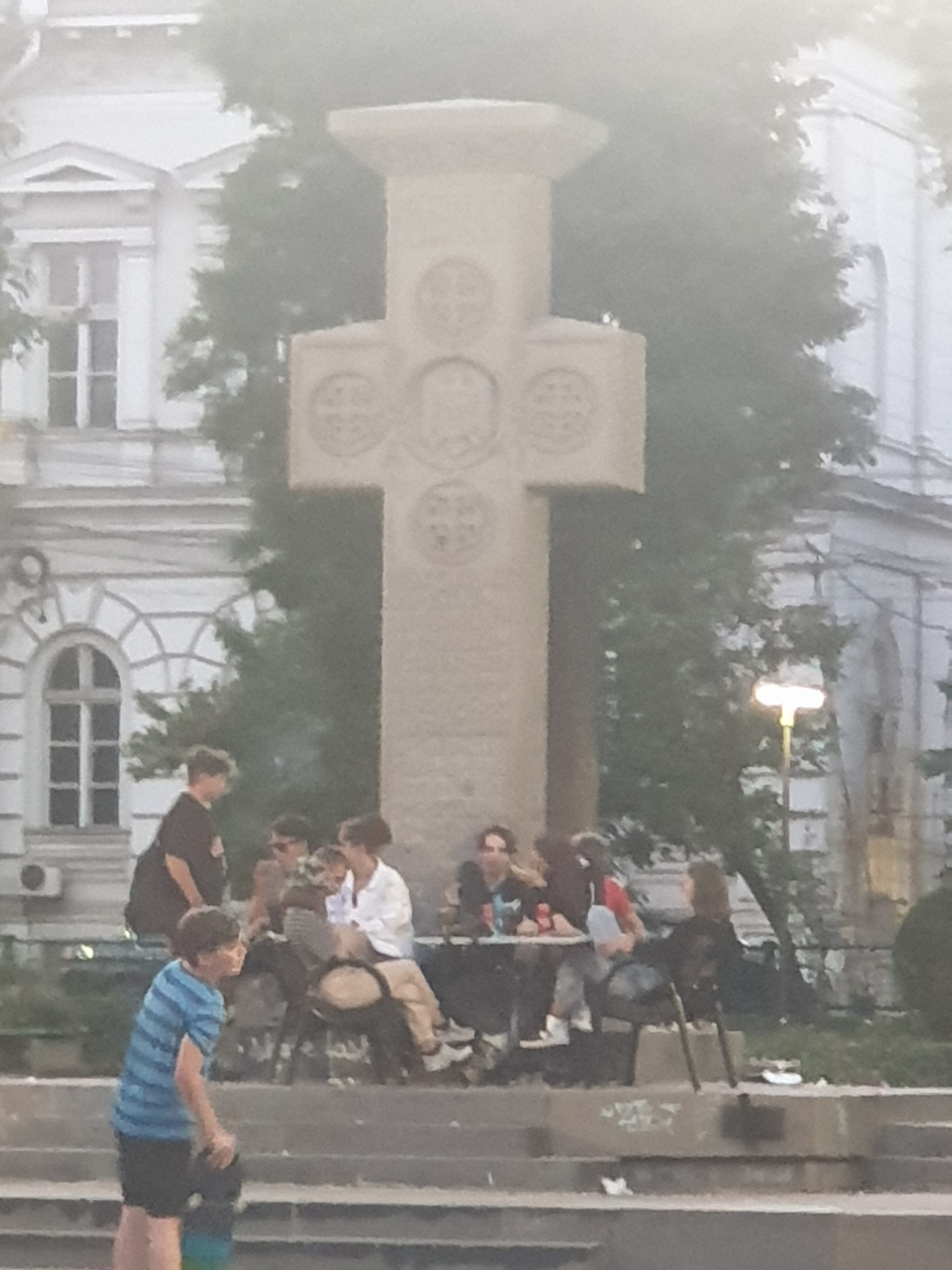 Duminică seară, un grup de tineri au decis că cel mai bun loc pentru a socializa este chiar pe monumentul din Parcul Eminescu. Doar că, tinerii nu s-au limitat în a sta pe treptele Crucii, așa cum se întâmplă seară de seară, ci de această dată și-au creat tot confortul. Au mutat una dintre mesele de șah din Parc și câteva scaune, chiar pe soclul Crucii. Apoi, așezați în liniște pe monumentul realizat în 1936 de arhitectul arădean Silvestru Rafiroiu, tinerii au socializat, au mâncat și au băut. În tot acest timp, arădenii care treceau prin parc îi priveau cu surprindere pe tinerii cocoțați pe monument.