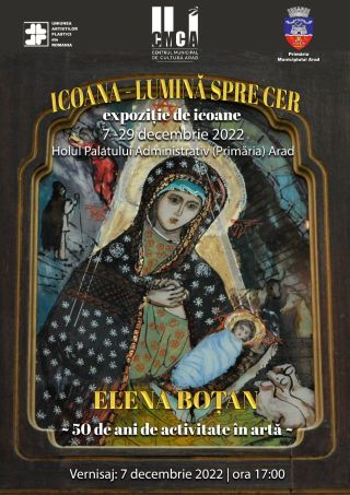 Evenimentul „Icoana – lumină spre cer”, organizat de Primăria Municipiului Arad și Centrul Municipal de Cultură Arad, va avea loc miercuri, 7 decembrie 2022, la ora 17:00, în holul Palatului Administrativ din municipiul Arad. În expoziția care va putea fi vizitată până în 29 decembrie, vor putea fi văzute 30 de lucrări de pictură în acuarelă, respectiv scene iconografice reprezentative pentru Biserica Ortodoxă.
