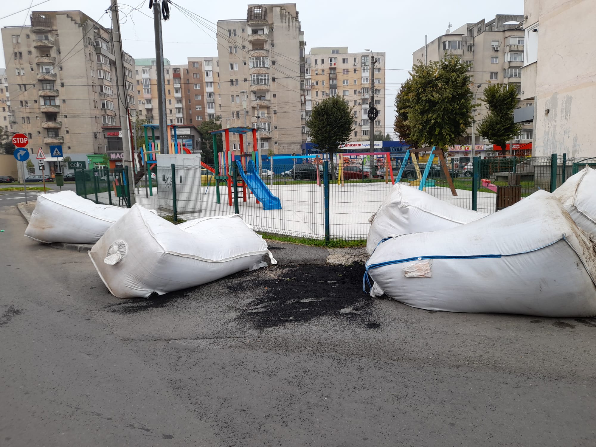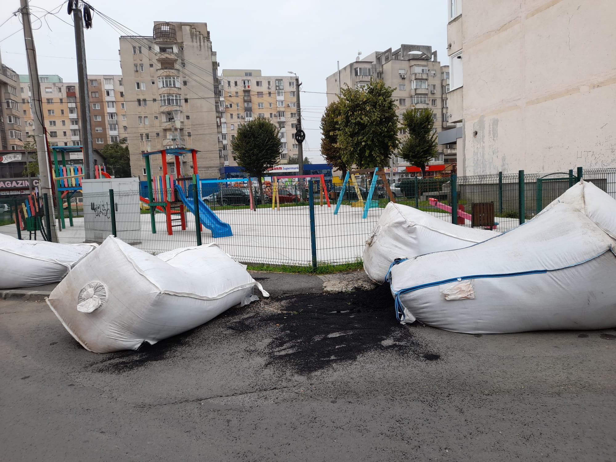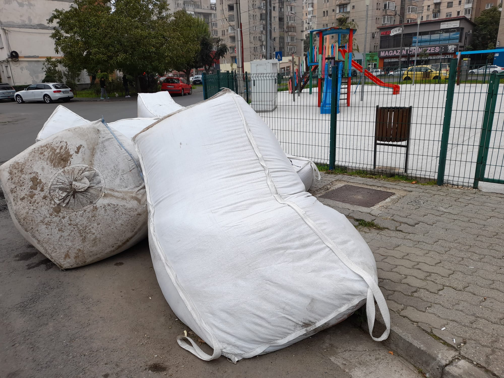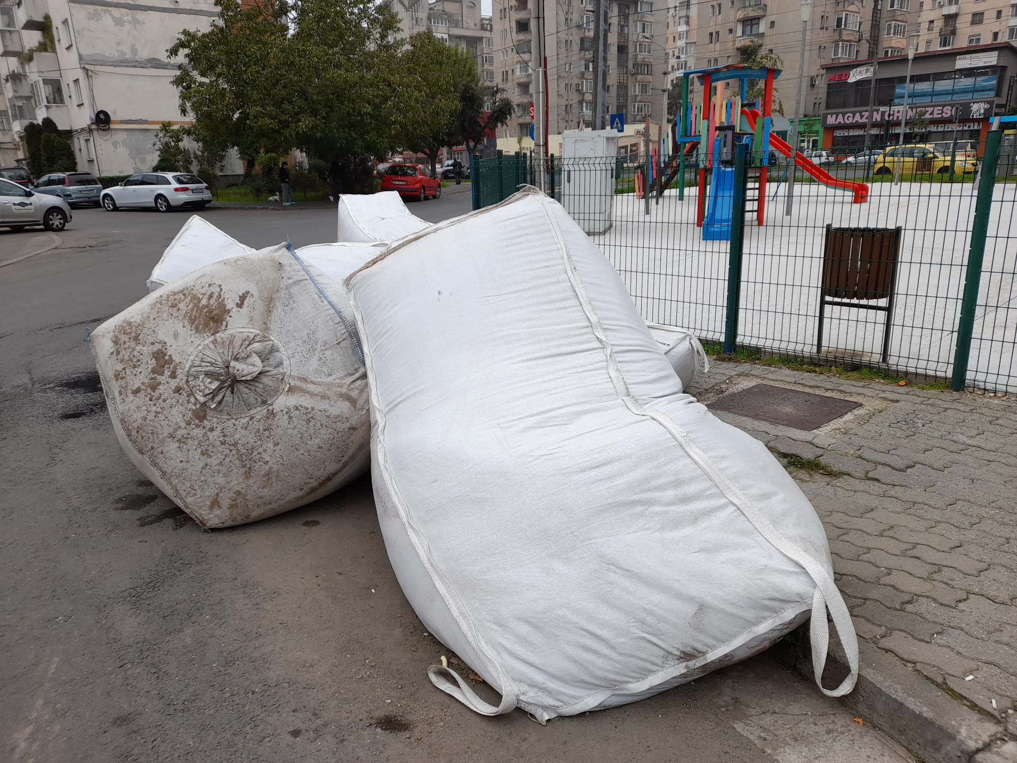 La parcul din apropierea stației Fortuna, sacii zac și pe trotuar, dar ajung și pe stradă, ocupând câteva locuri de parcare. Unii dintre saci sunt deja deterioraţi, iar prin acele găuri a început să curgă materialul izolator. S-a întins atât pe trotuar, cât și pe stradă, ajungând chiar să acopere o gură de canal.