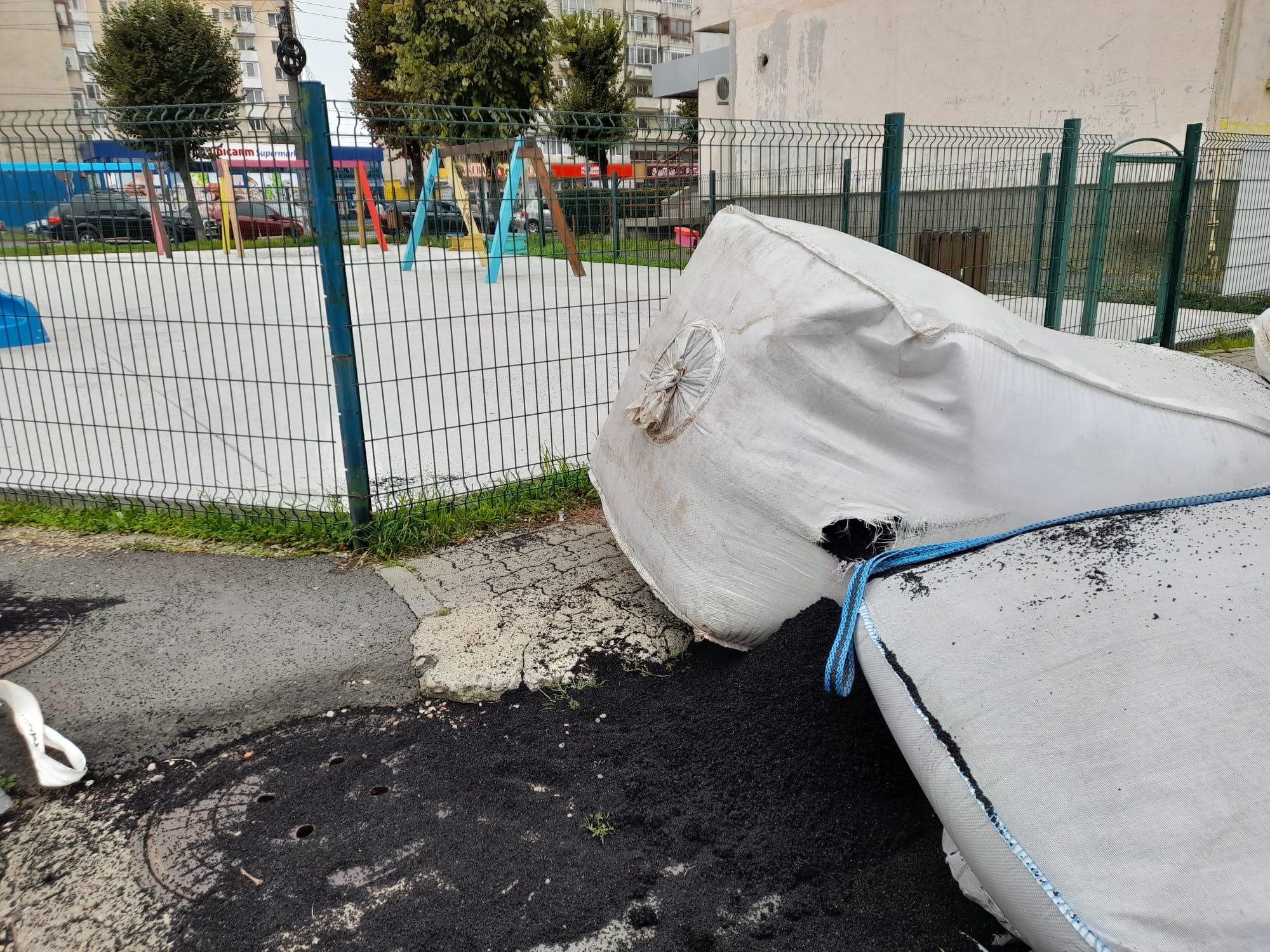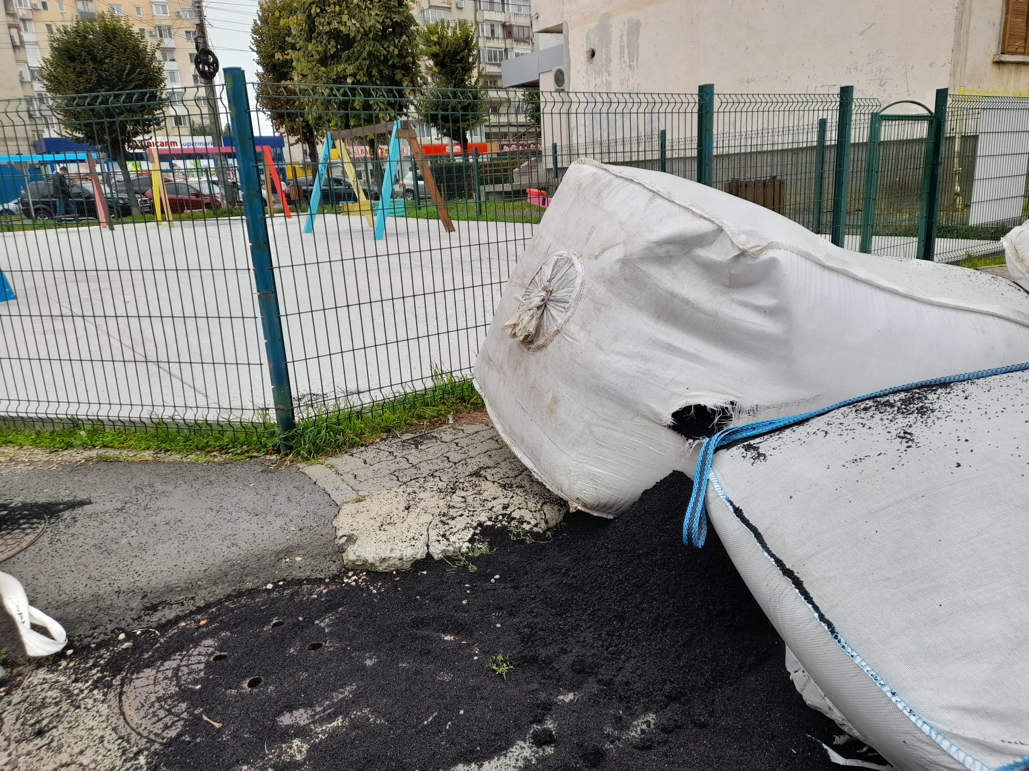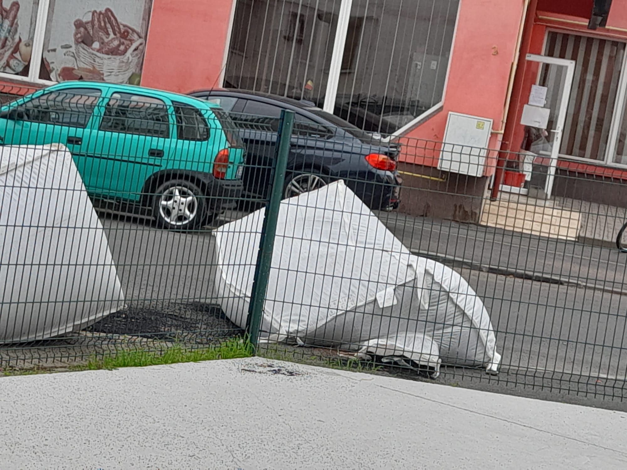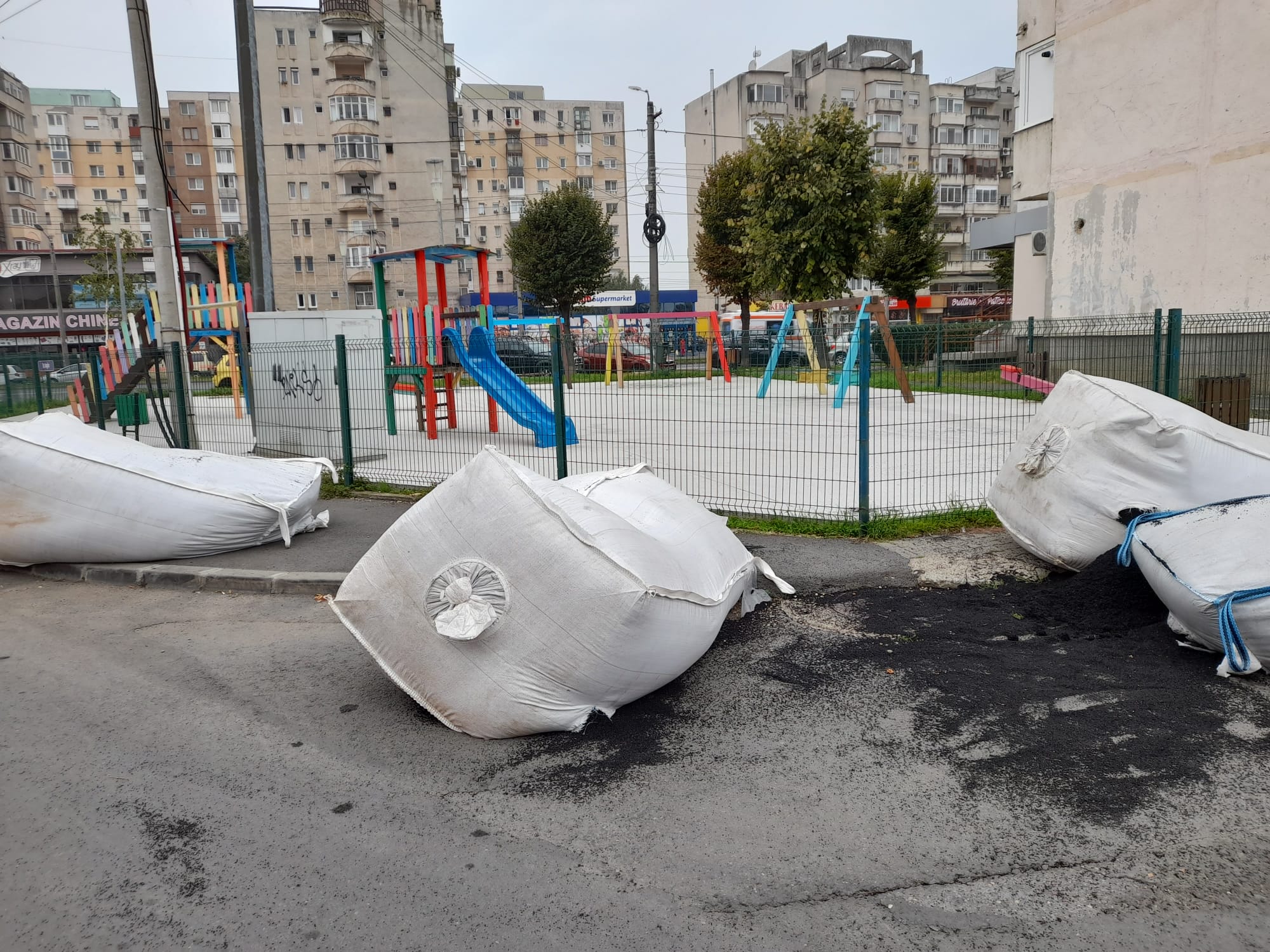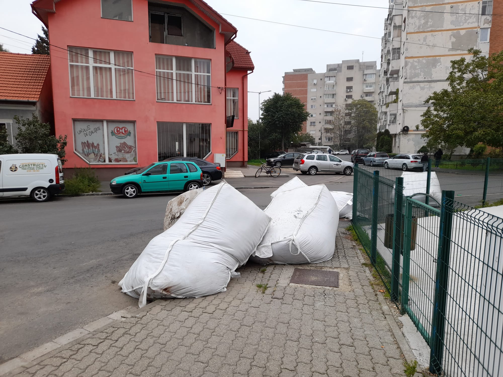La parcul din apropierea stației Fortuna, sacii zac și pe trotuar, dar ajung și pe stradă, ocupând câteva locuri de parcare. Unii dintre saci sunt deja deterioraţi, iar prin acele găuri a început să curgă materialul izolator. S-a întins atât pe trotuar, cât și pe stradă, ajungând chiar să acopere o gură de canal.
