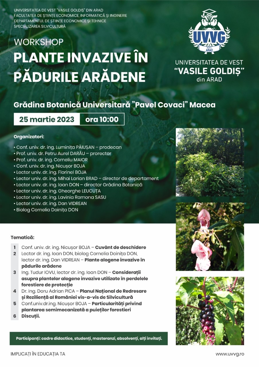 MACEA. Sâmbătă, 25 martie 2023, la Complexul Universitar Macea, al Universității de Vest „Vasile Goldiș” din Arad, Facultatea de Științe Economice, Informatică și Inginerie, prin programul de studii Silvicultură, a organizat workshopul: Plante invazive în pădurile arădene.
