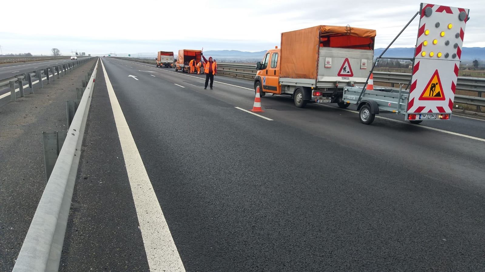 Acest tip de lucrări, cu mixtură la rece, se efectuează şi pe autostrada Arad-Timişoara. Pe alocuri, circulaţia este îngreunată, pe o singură bandă, iar drumarii anunţă că aceste plombări vor continua şi în zilele viitoare.