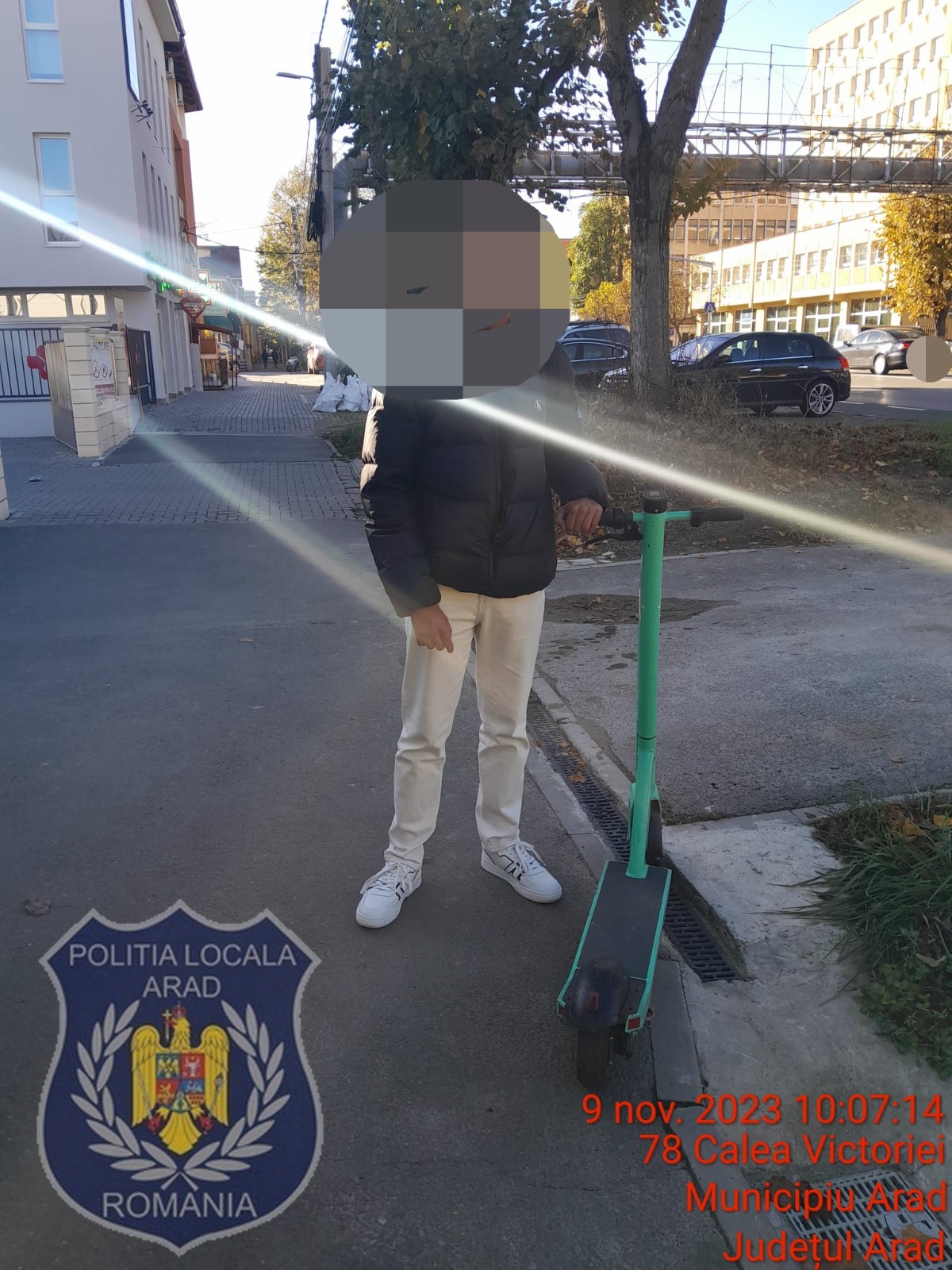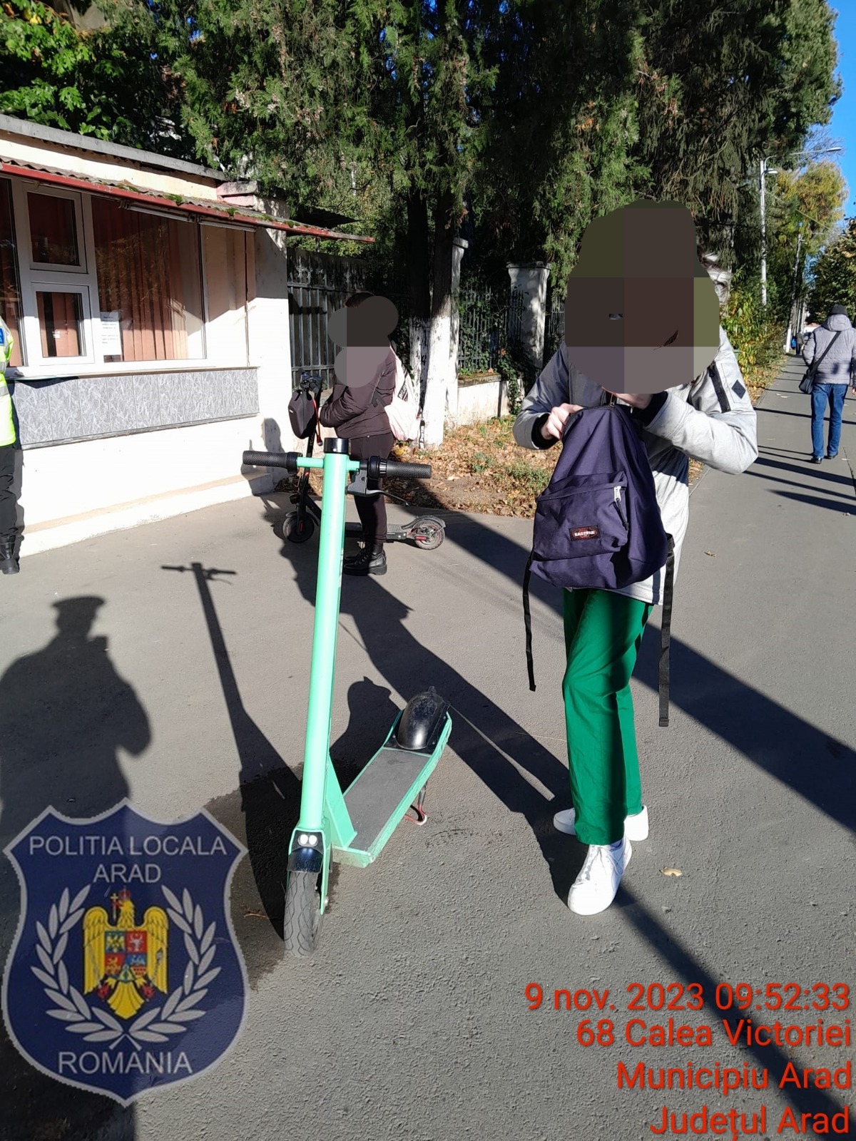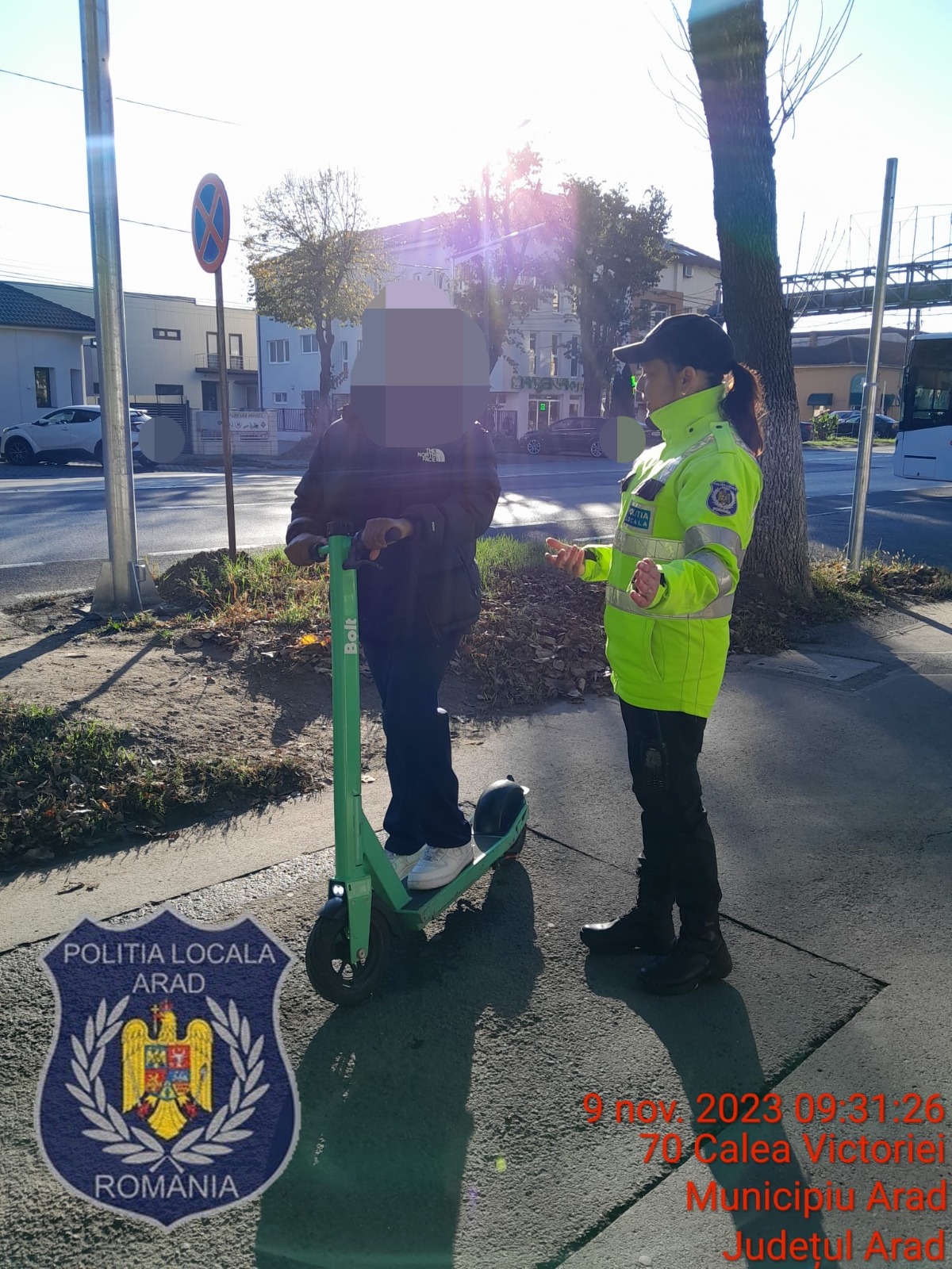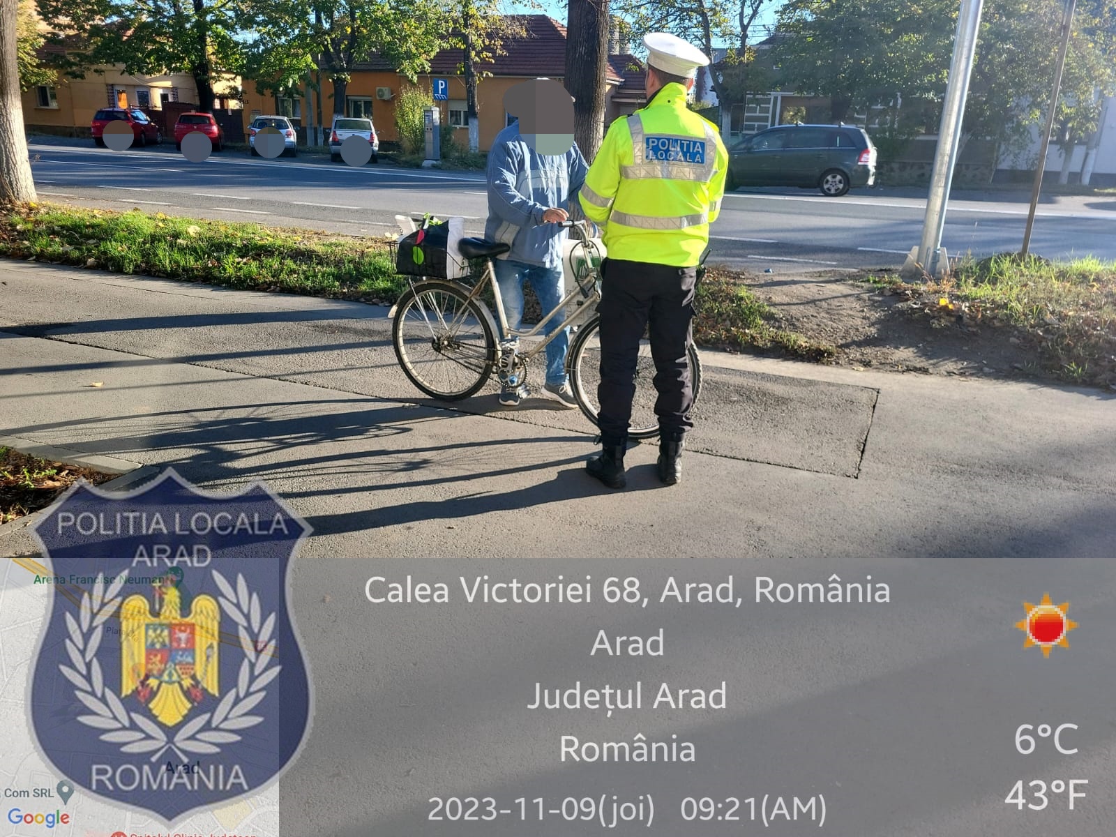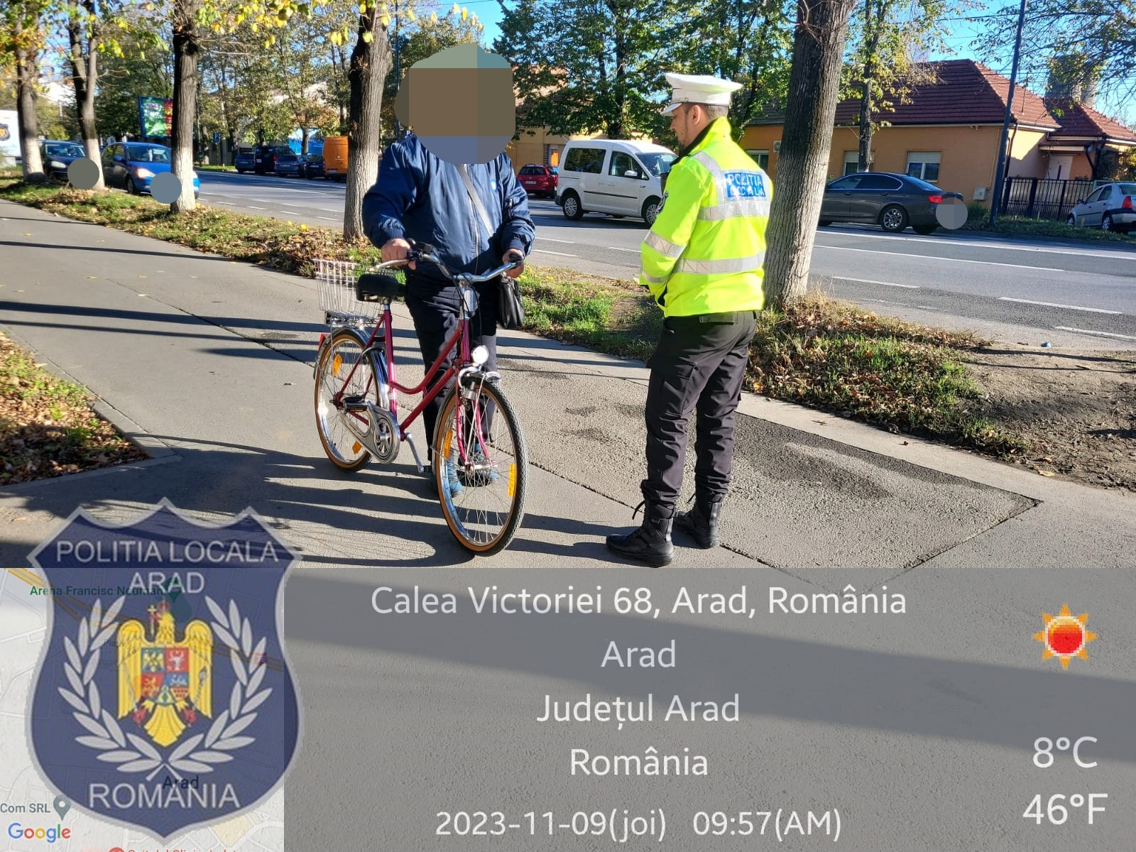 “Astfel, 16 utilizatori de biciclete au circulat pe trotuare, deranjând pietonii, deși legislația în vigoare interzice circulația bicicletelor pe trotuare, cu excepția cazului când pe acestea sunt amenajate piste pentru biciclete, respectiv 2 persoane au ales să transporte pasageri pe trotinetele folosite ca mijloace de transport, ignorând prevederile legale. Amenzile aplicate de echipajele din teren cumulează 5.365 lei. Direcția Generală Poliția Locală Arad recomandă utilizatorilor vehiculelor de tip bicicletă și trotinetă electrică, în vederea prevenirii evenimentelor rutiere cu consecințe grave în care pot fi implicate aceste tipuri de vehicule: să se informeze privind regulile de bază ale utilizării bicicletelor/trotinetelor electrice pe drumurile publice; să se asigure întotdeauna că intenția de schimbare a direcției de mers a fost observată de ceilalți participanți la trafic, având în vedere faptul că spre deosebire de regulile stabilite pentru conducătorii de biciclete, în cazul trotinetelor electrice, schimbarea direcției de mers se face prin deplasarea conducătorilor pe lângă acestea”, informează Poliția Locală.