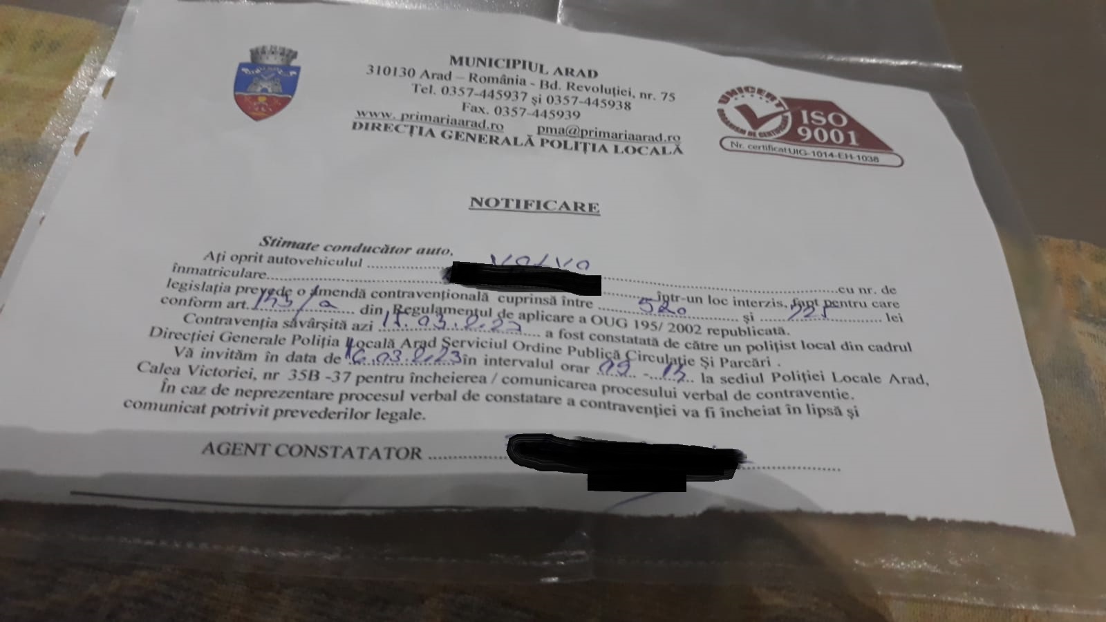 ARAD. Din nou, acuzații la adresa agenților din cadrul Direcției Generale Poliția Locală Arad, care se ocupă de parcări și care au aplicat o amendă considerată a fi total nejustificată de către persoana care s-a ales cu notificarea în parbriz, pentru staționare neregulamentară.