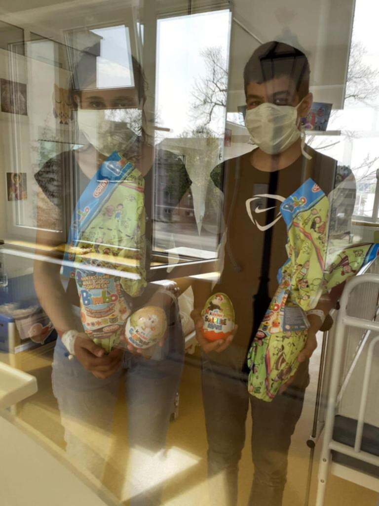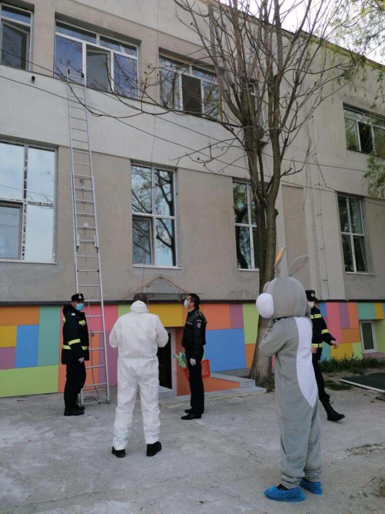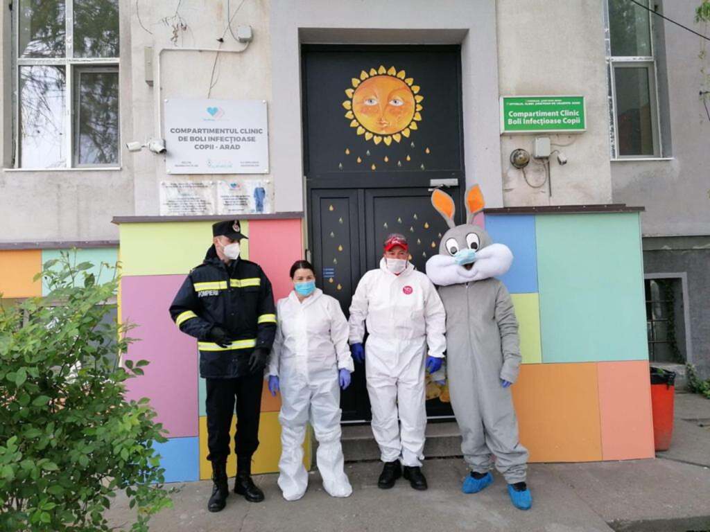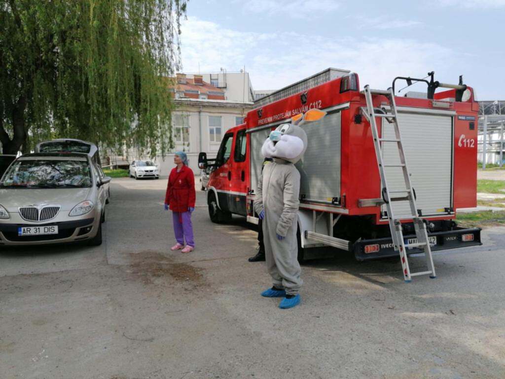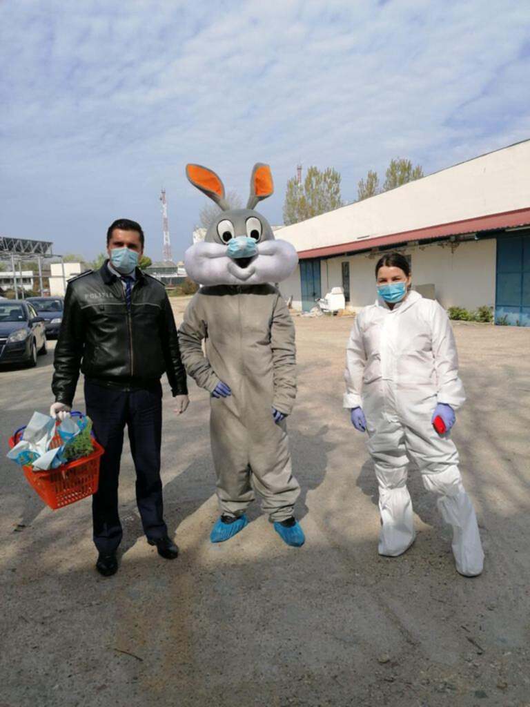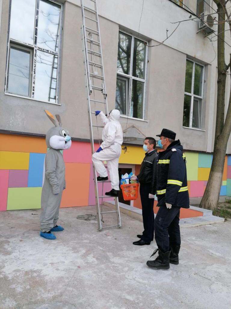„Cu sprijinul autospecialei pompierilor, sub supravegherea personalului medical, iepurașul a urcat până la geam, unde 50 de pachete au fost preluate, dezinfectate și apoi înmânate copiilor.