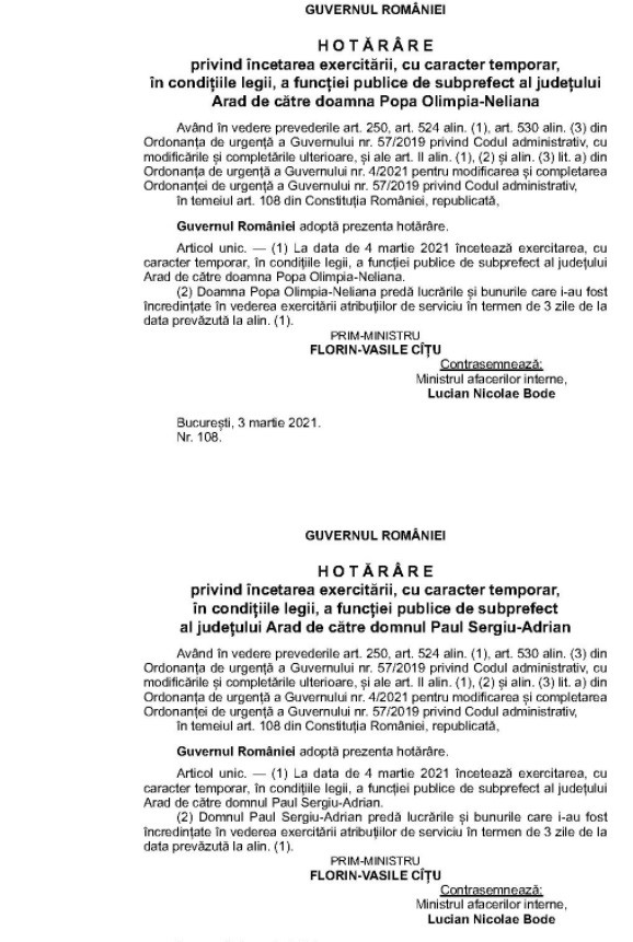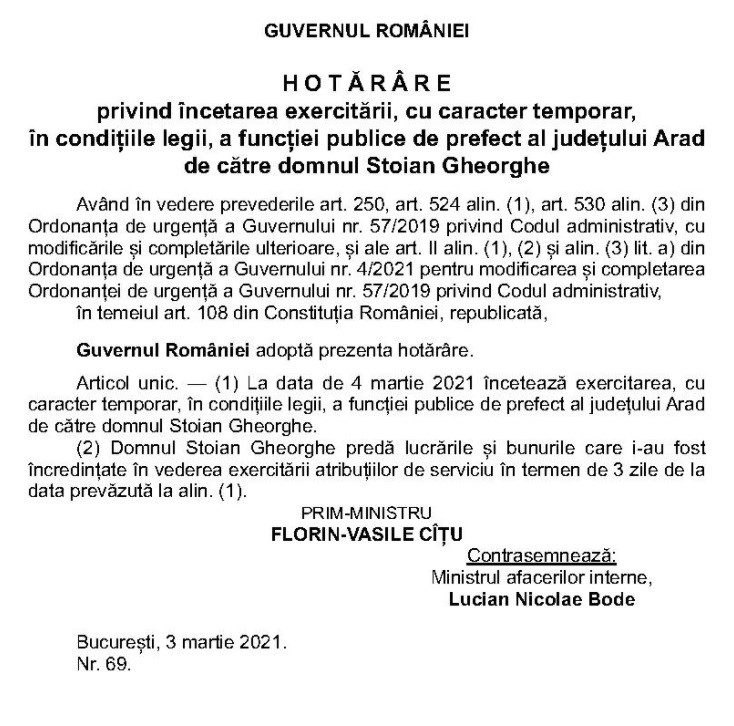 „La data de 4 martie 2021 încetează exercitarea, cu caracter temporar, în condițiile legii, a funcției publice de prefect al județului Arad de către domnul Stoian Gheorghe. Domnul Stoian Gheorghe predă lucrările și bunurile care i-au fost încredințate în vederea exercitării atribuțiilor de serviciu în termen de 3 zile de la data prevăzută”, se arată în hotărârea adoptată de Guvern.