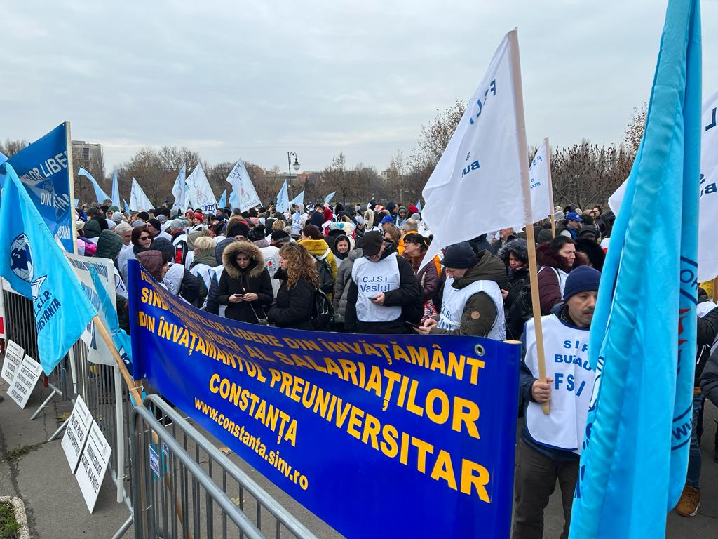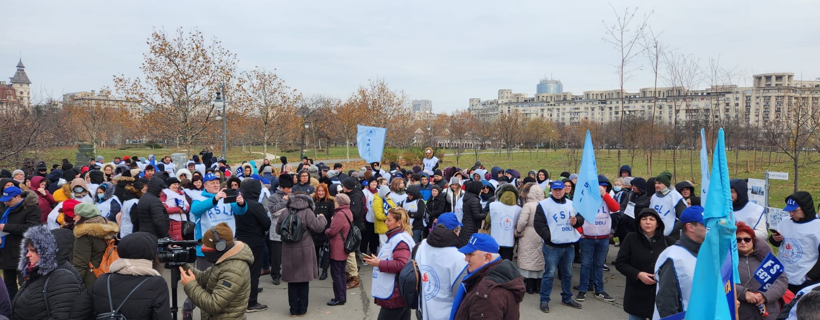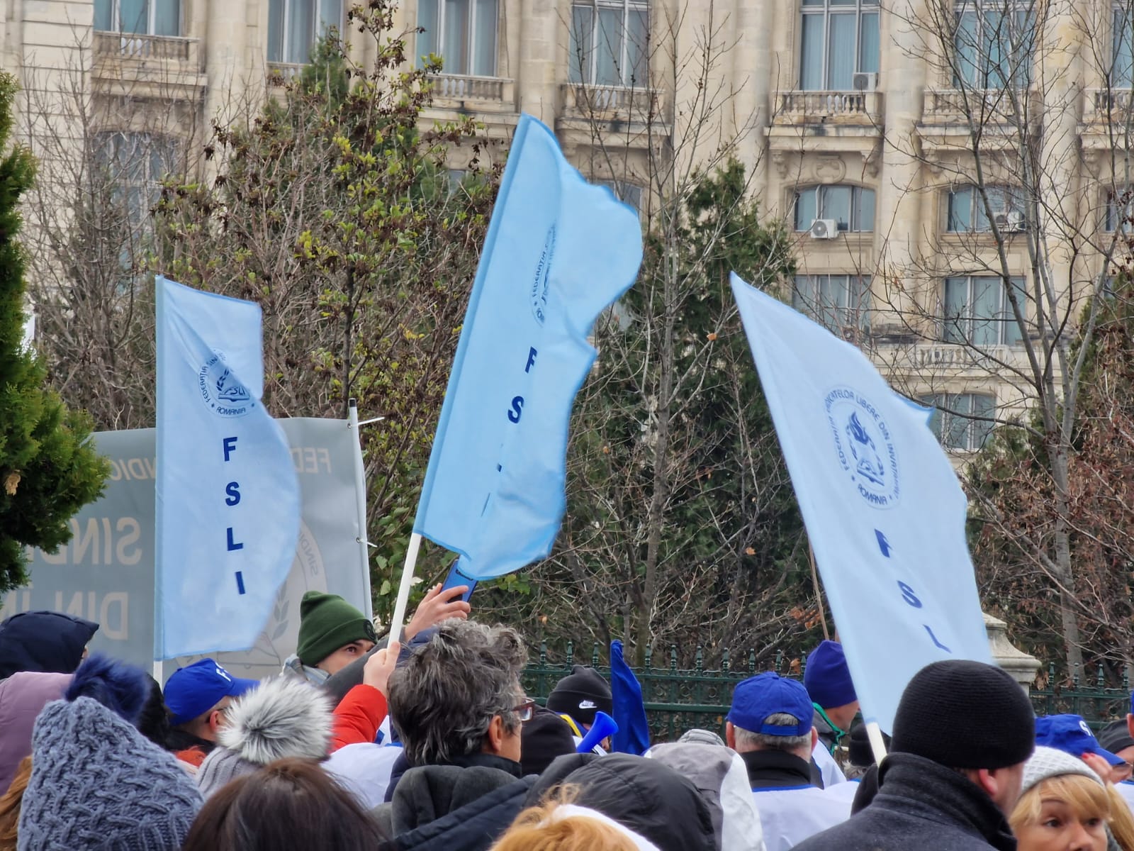 BUCUREŞTI. Președintele Sindicatului Democratic Învățământ Arad, Dănuț Ieneșescu, a participat miercuri, alături de câteva sute de sindicalişti din toată ţara, la protestul organizat de FSLI în faţa Palatului Parlamentului.