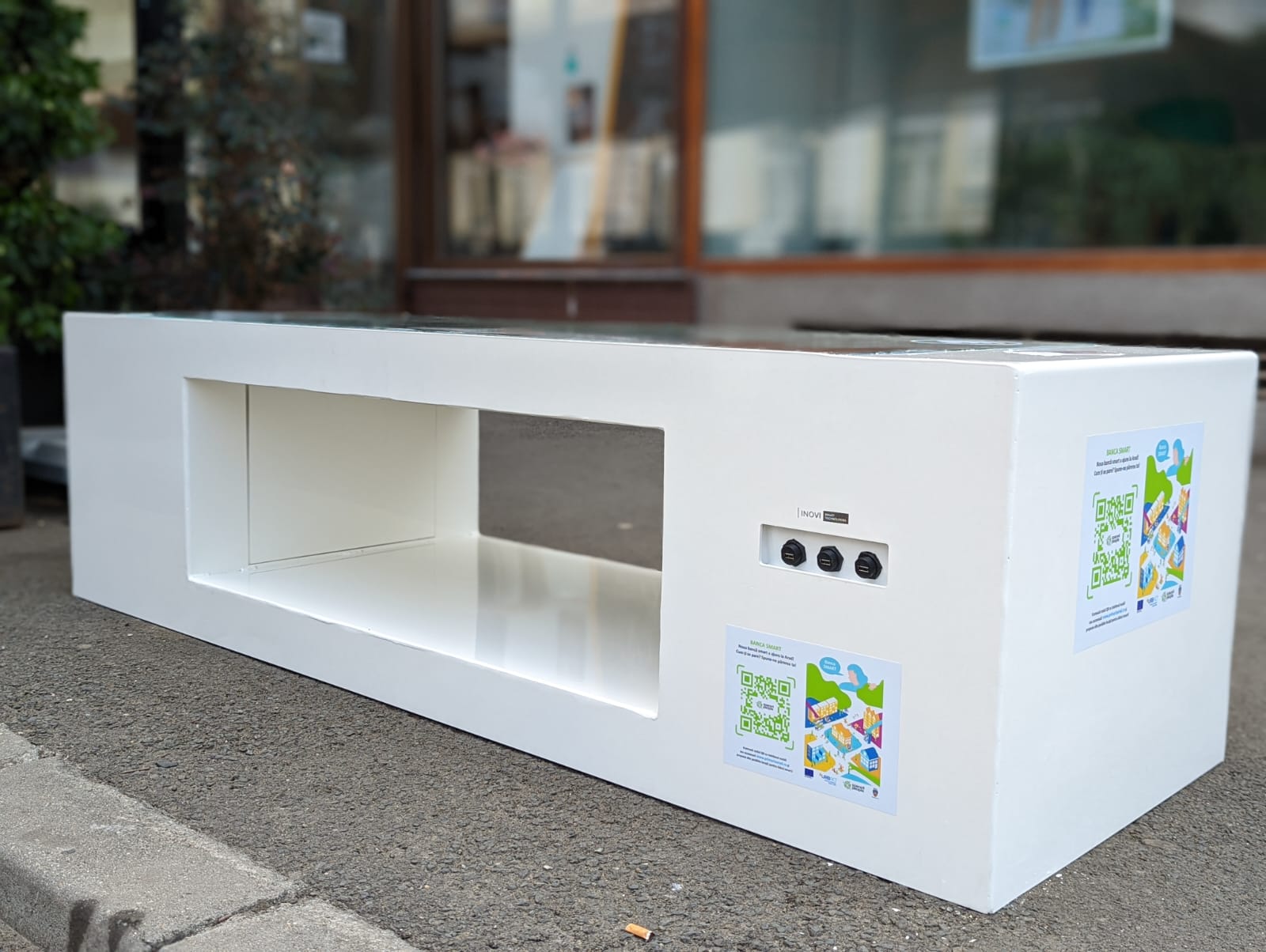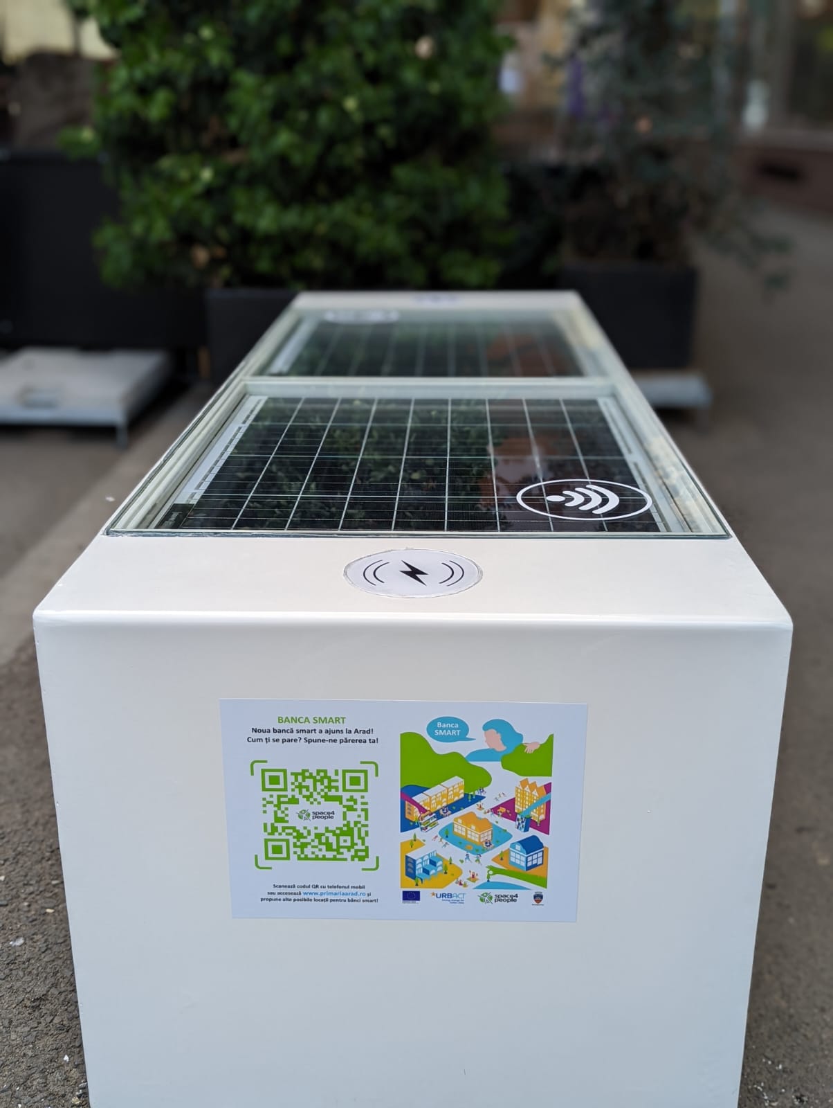 Banca smart este prevăzută cu două panouri solare, un acumulator pentru înmagazinarea energiei electrice și utilizarea ei în zile fără soare și pe timp de noapte, trei porturi USB, două încărcătoare wireless și WiFi 4G gratuit. Investiția se ridică la 20.000 de lei (4.000 de euro) şi a fost realizată din fonduri europene, în cadrul proiectului Space4People.