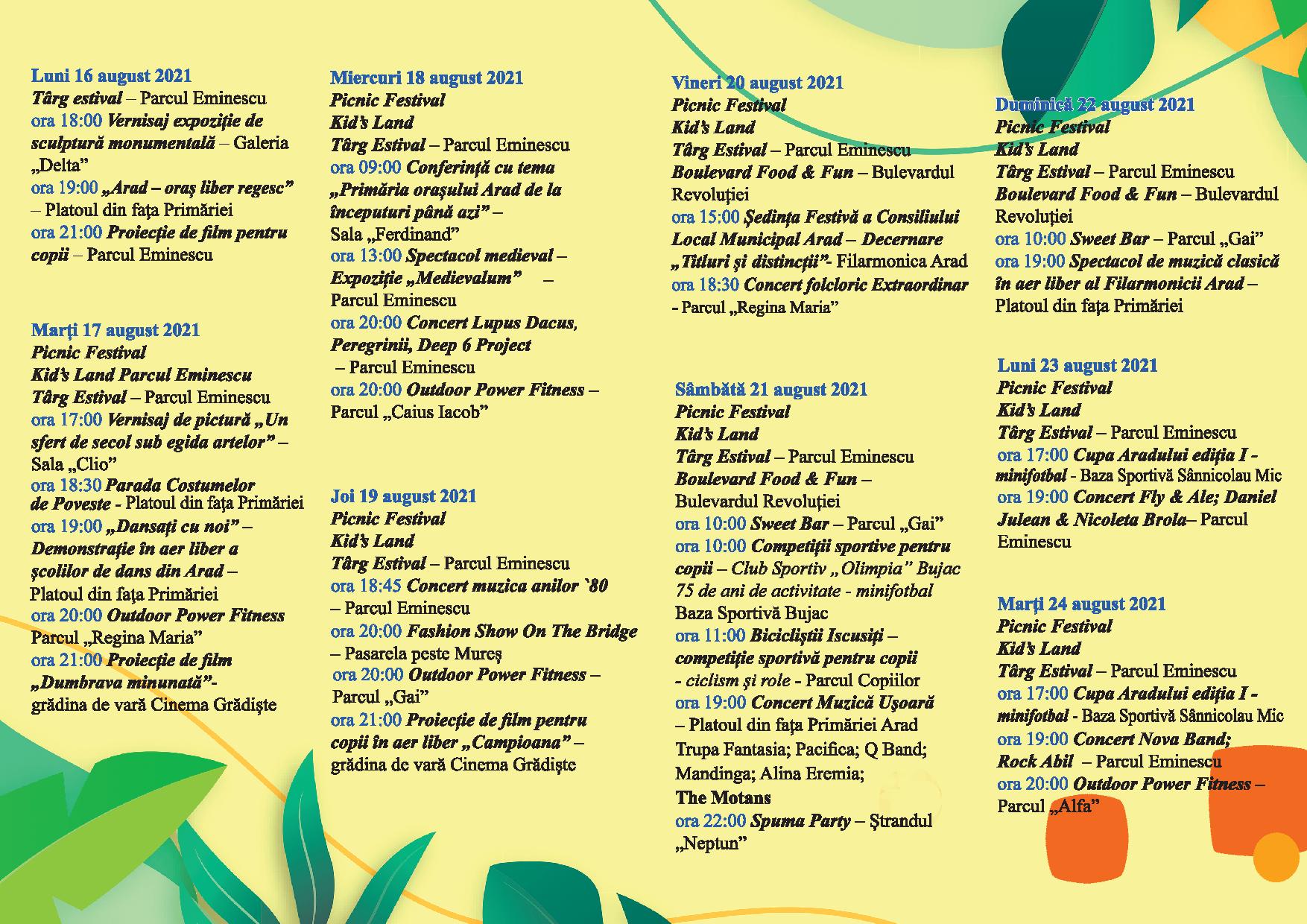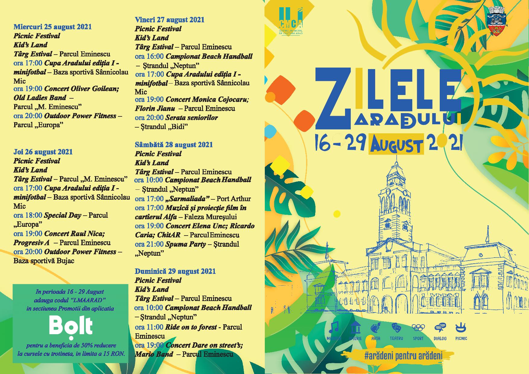 Au fost păstrate în program evenimentele tradiţionale, precum: Ședința Festivă a Consiliului Local Municipal, Târgul Estival, Picnic Festival, concertul de muzică ușoară și cel folcloric, dar și petrecerile cu spumă de pe Ștrandul Neptun. Dar au fost introduse şi o serie de evenimente în premieră, precum: Fashion on the bridge, Boulevard Food and Fun, Sarmaliada, Sweet Bar, Ride on to Forest, Cupa Aradului la minifotbal, Campionatul Beach Handball sau Outdoor Power Fitness. Tot la capitolul noutăți, amintim Special Day – un eveniment dedicat copiilor cu dizabilități și familiilor acestora, care va avea loc pe 26 august, în Parcul Europa. Pe 27 august, seniorii vor avea parte de o serată de neuitat la Băile Termale Bidi.