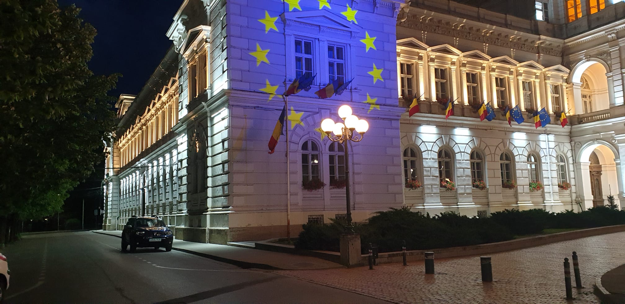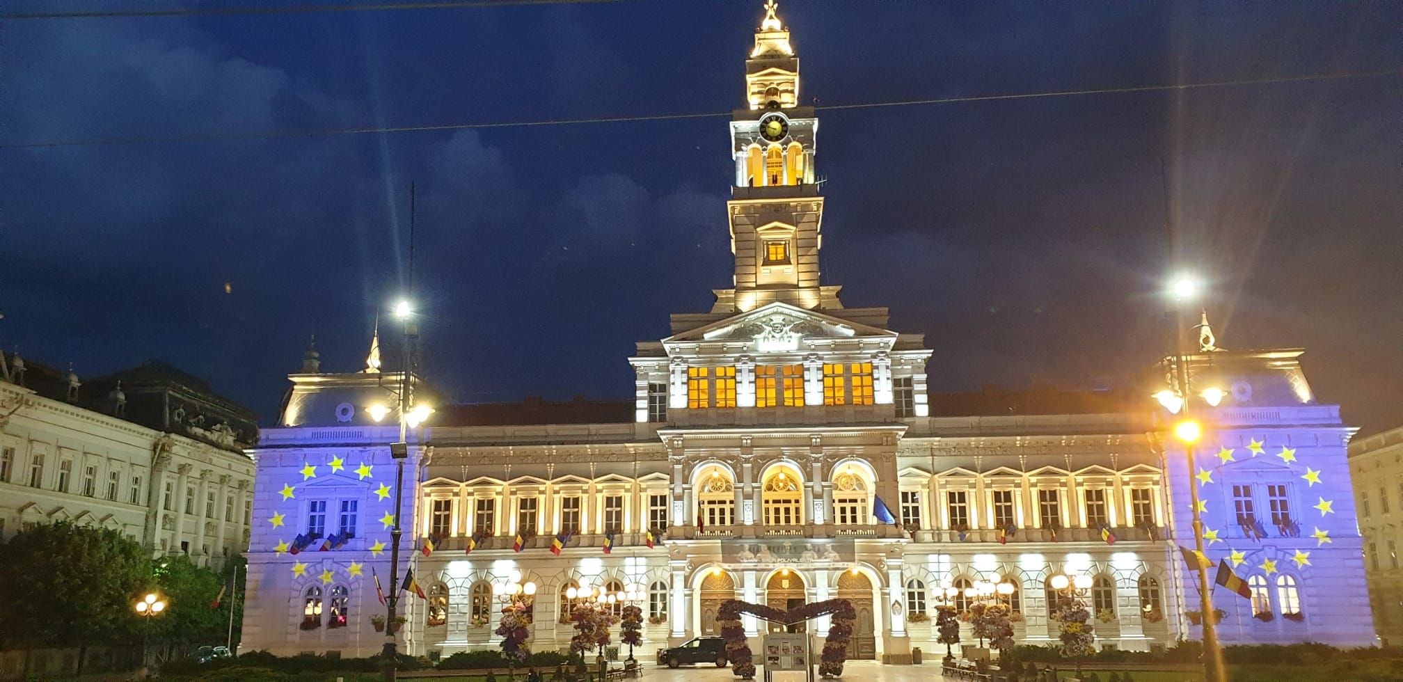 Palatul Administrativ, unde se află Primăria și Prefectura, este iluminat, începând de luni seara până vineri seara, în culorile steagului Uniunii Europene. Pe platoul din fața primăriei are loc expoziția de fotografie “35 Reasons to Smile in the EU” (parte din proiectul “174 Reasons to Smile”), care cuprinde lucrări realizate de arădeanul Cristian Manta.Primarul municipiului Arad, Călin Bibarț, a declarat că iluminarea Primăriei cu steagul UE este un gest de normalitate pentru o țară care și-a dorit să fie în Uniunea Europeană, care a avut de câștigat prin faptul că este în UE și pentru un oraș care întotdeauna a dovedit, încă de dinaintea aderării la uniune, că este un oraș european.La Arad au avut loc luni mai multe evenimente dedicate Zilei Europei, Zilei Independenței de Stat a României și împlinirii a 77 de ani de la încheierea celui de-al Doilea Război Mondial.Prin aceste acțiuni, Municipiul Arad se alătură altor orașe din România, precum Cluj-Napoca sau Brașov, în care Biroul de Legătură al Parlamentului European în România în parteneriat cu autoritățile locale, marchează Ziua Europei prin evenimente. Ziua Europei este sărbătorită în fiecare an la 9 mai, pentru a celebra pacea și unitatea în Europa. Data marchează aniversarea istoricei Declarații Schuman, care a deschis calea Europei către Uniunea Europeană de astăzi.
