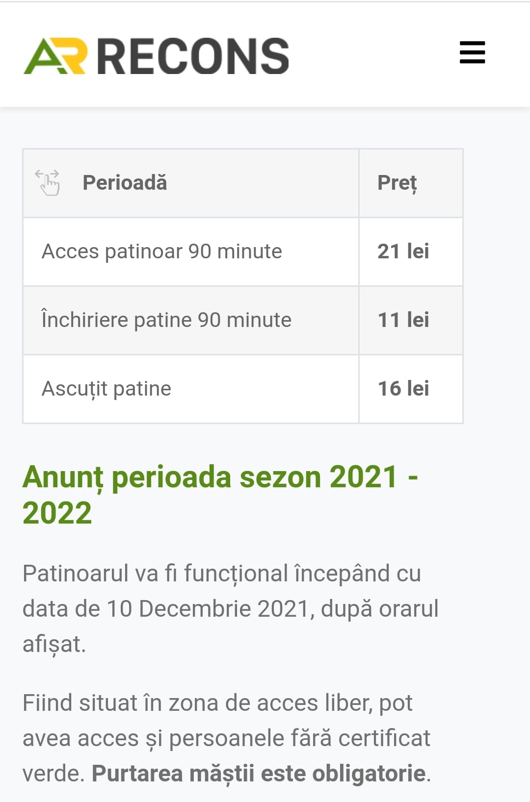 Conform anunțului de pe site-ul RECONS, patinoarul ar fi trebuit să se deschidă pe data de 10 decembrie: “Anunț perioada sezon 2021 – 2022. Patinoarul va fi funcțional începând cu data de 10 Decembrie 2021, după orarul afișat: luni–vineri 9:00–21:30, sâmbătă 8:00–22:30, duminică 8:00–22:30. Fiind situat în zona de acces liber, pot avea acces și persoanele fără certificat verde. Purtarea măștii este obligatorie.” Cu toate acestea, deschiderea nu a avut loc. De altfel, primarul Călin Bibarț anunța pe 3 decembrie că vremea ar putea influența data deschiderii patinoarului: „Dacă vremea, prognoza se menţine în aceiaşi parametri meteorologici, sperăm ca în weekend-ul viitor, de vineri, să deschidem patinoarul. Ne dorim acest lucru. E în aer liber, s-a rugat conducerea Recons-ului să discute şi cu DSP-ul să vedem condiţiile în care se poate desfăşura activitatea de acolo. Dacă vremea se menţine la fel de aspră şi nu sunt ploi abundente, cred că ne putem bucura şi de patinoar.”