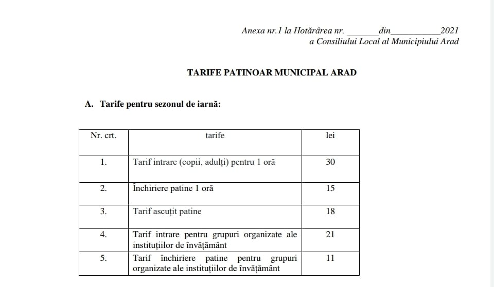 Proiectul de hotărâre privind modificarea tarifelor pentru utilizarea zonei de agrement Patinoarul Municipal Arad, la iniţiativa primarului. Proiectul, care aduce creșteri semnificative ale tarifelor pentru o oră de patinat, se află la transparență până pe data de 31 decembrie, dată până la care cei interesați pot depune în scris recomandări, sugestii şi opinii privind acest document.