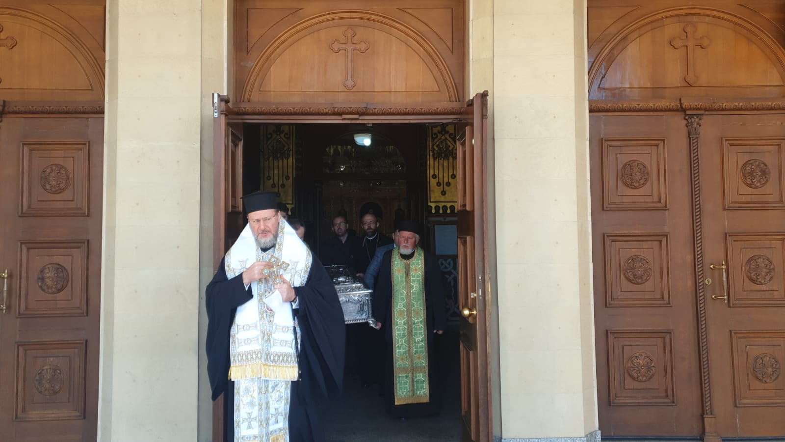 Cu începere de la ora 12.00, racla ce cuprinde sfintele moaşte ale Sfântului Ioan Gură de Aur şi două icoane ale Maicii Domnului, de dimensiuni mari, pictate în Muntele Athos, au fost amplasate într-o maşină special pregătită, care le-a dus prin mai multe locuri importante din Arad. Mașina a fost împodobită cu ramuri de salcie, simbol al Floriilor și al intrării Domnului Iisus în Ierusalim.
