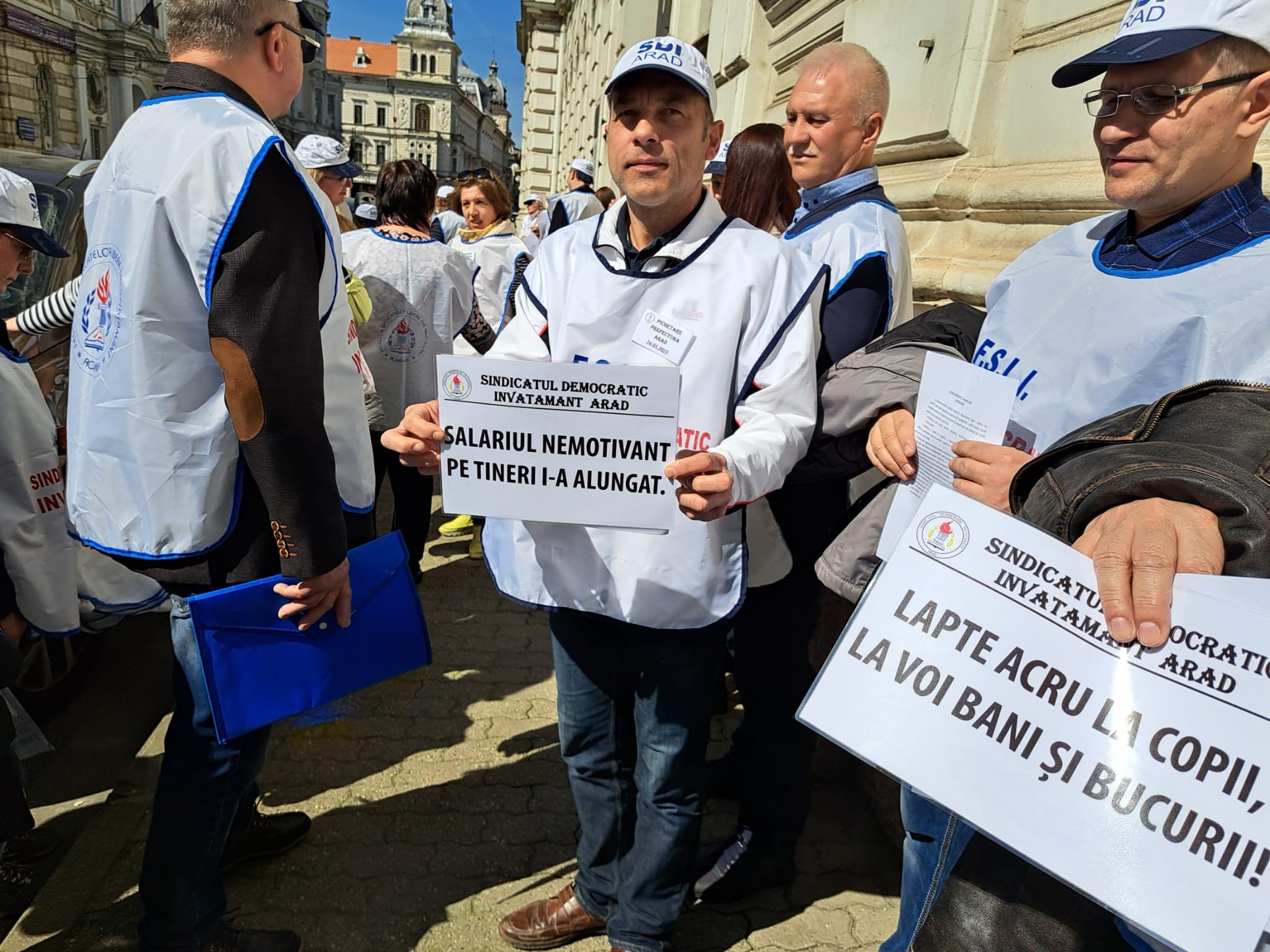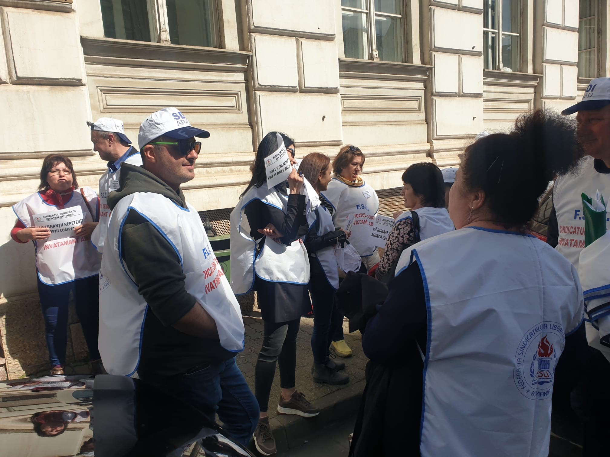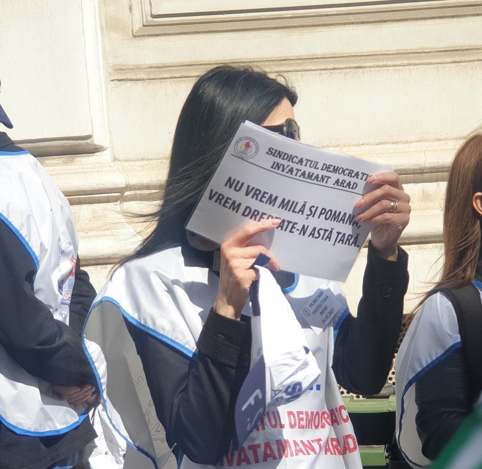 ARAD. Nemulţumiţi de salarii, dar nu numai, zeci de cadre didactice şi angajaţi din învăţământ au pichetat, vineri, 24 martie, sediului Instituţiei Prefectului Judeţului Arad. Protestul s-a desfăşurat între orele 12:00 şi 13:00, iar Dănuţ Ieneşescu, preşedintele SDÎ Arad, a punctat că „această acțiune sindicală se înscrie în seria protestelor declanșate în întreaga țară și care, în cazul nesoluționării revendicărilor personalului din învățământ, vor culmina cu greva generală”.