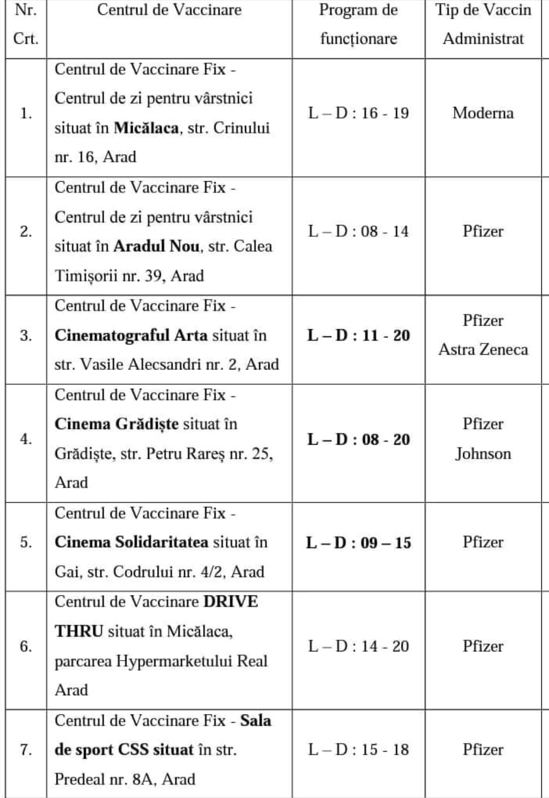 – Centrul de vârstnici Aradul Nou (Calea Timișorii nr.39) – deschis zilnic între 08:00 – 14:00 (Pfizer);